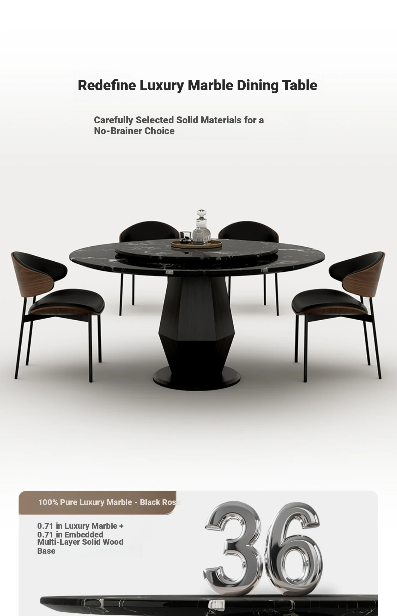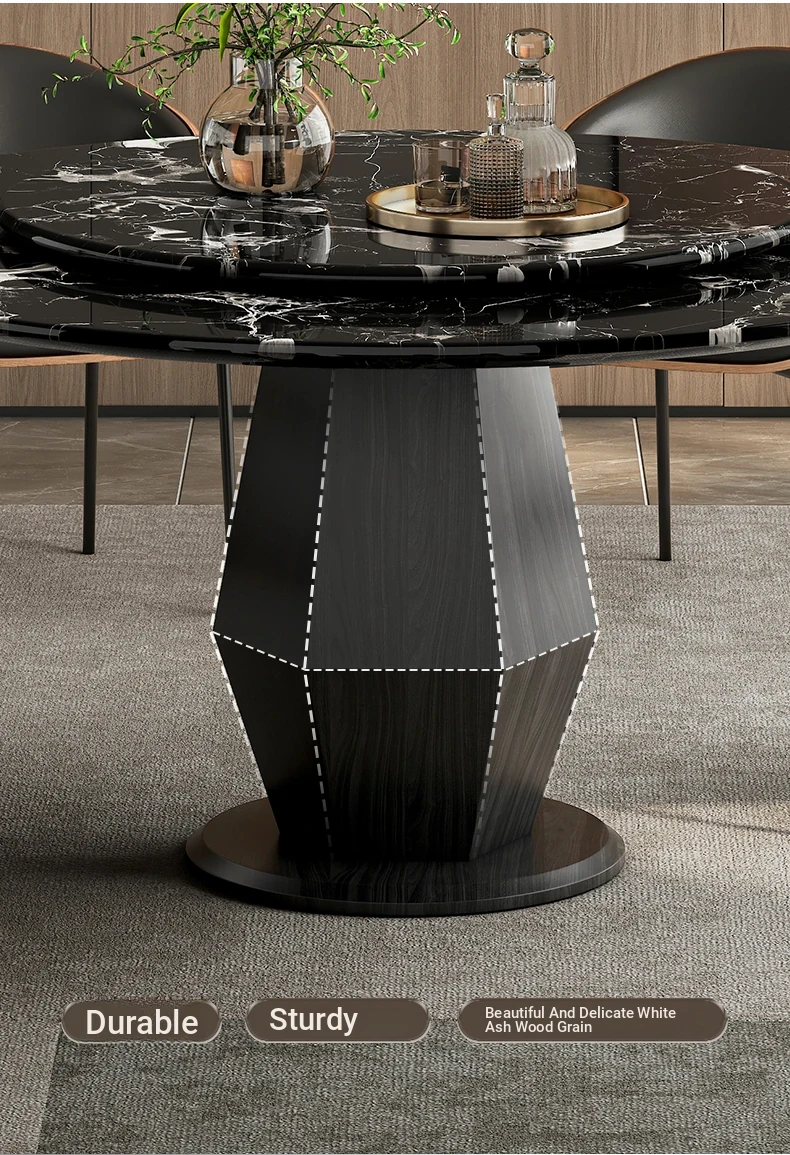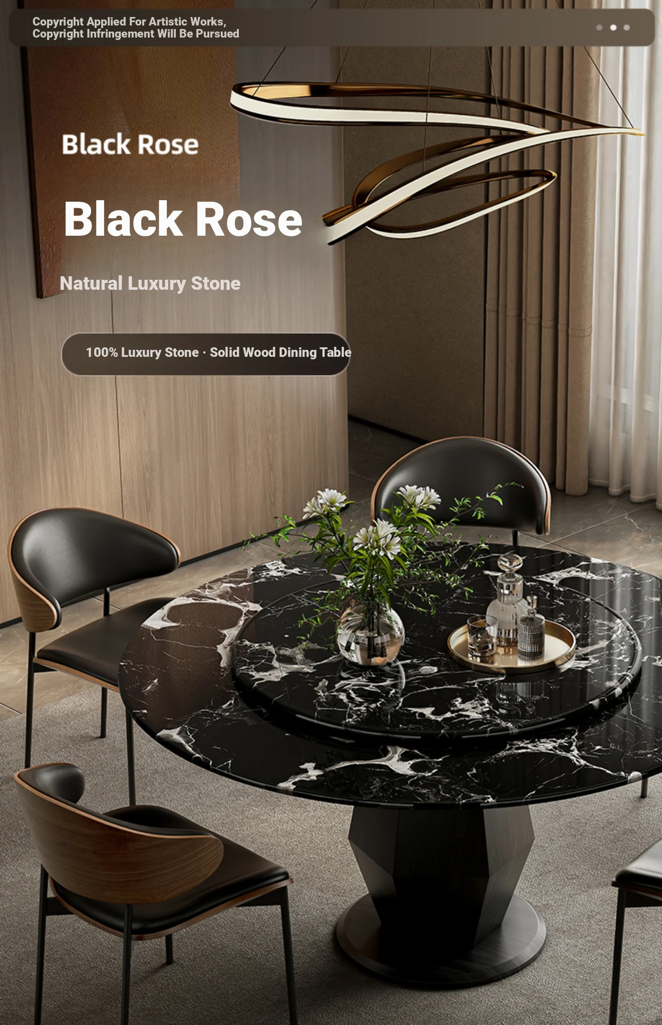 2025 New Luxury Natural Black Rose Marble Round Dining Table with Rotating Base - Perfect for Small Spaces, Stylish Solid Wood Design for Modern Homes