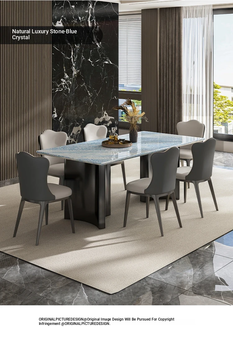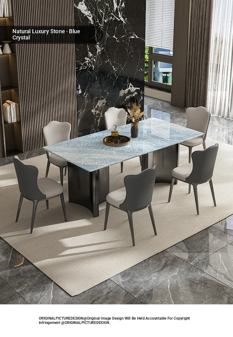 Blue Crystal Natural Luxury Stone Dining Table + Leather Cloud Dining Chair * 6
