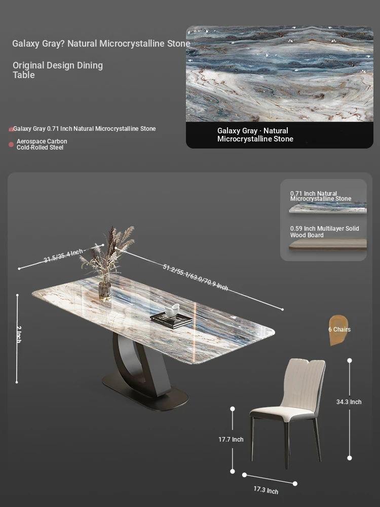[Original Design] 0.71in Natural Microlite, Xinghe Grey Dining Table + Dining Chair * 6