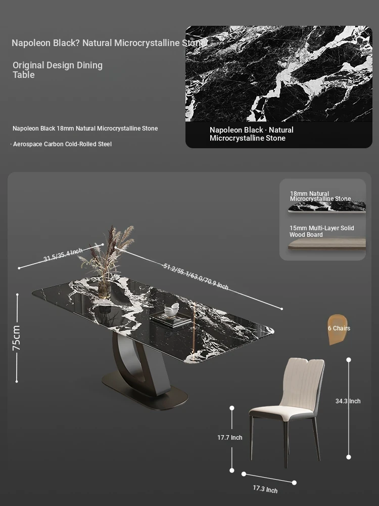 [Original Design] 0.71in Natural Microlite Napoleon Black Dining Table + Dining Chair * 6