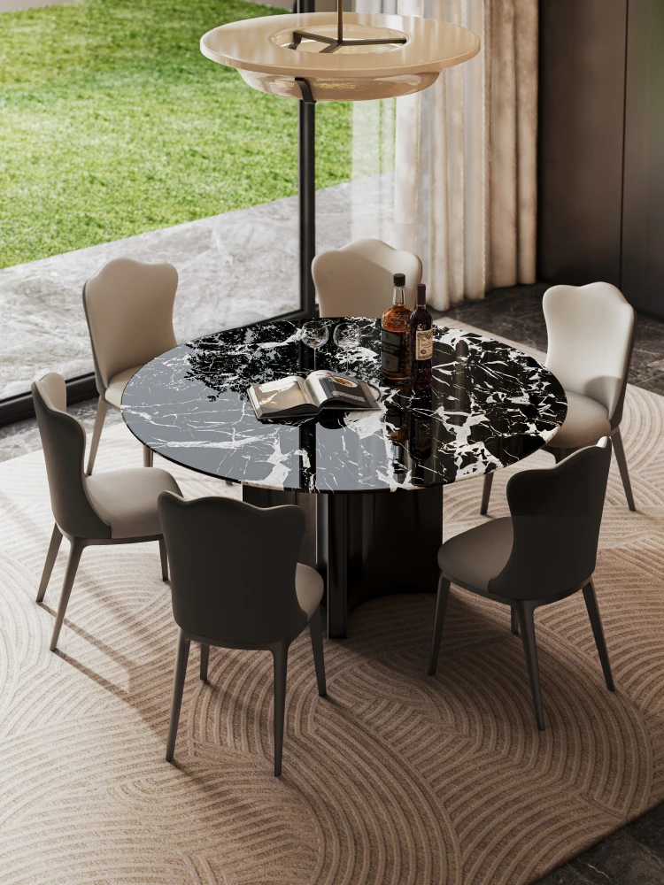 [S] Bulgari Black Natural Luxury Stone Round Dining Table + Cloud Leather Dining Chair * 8
