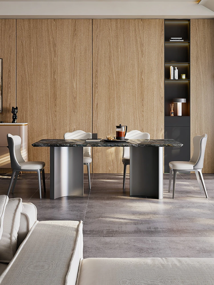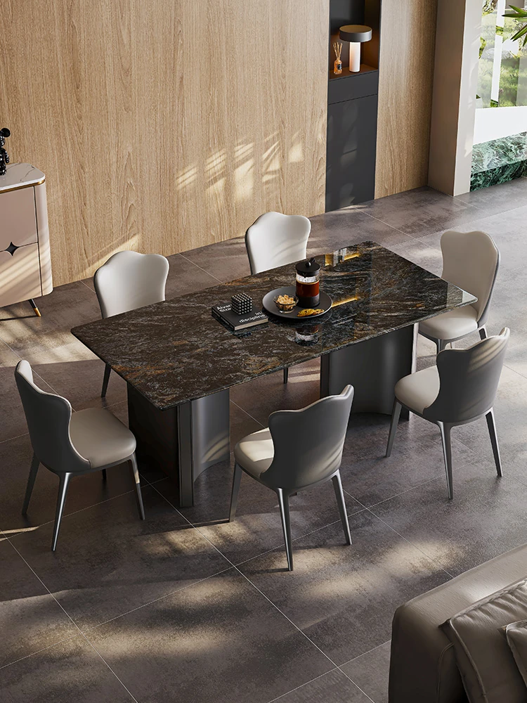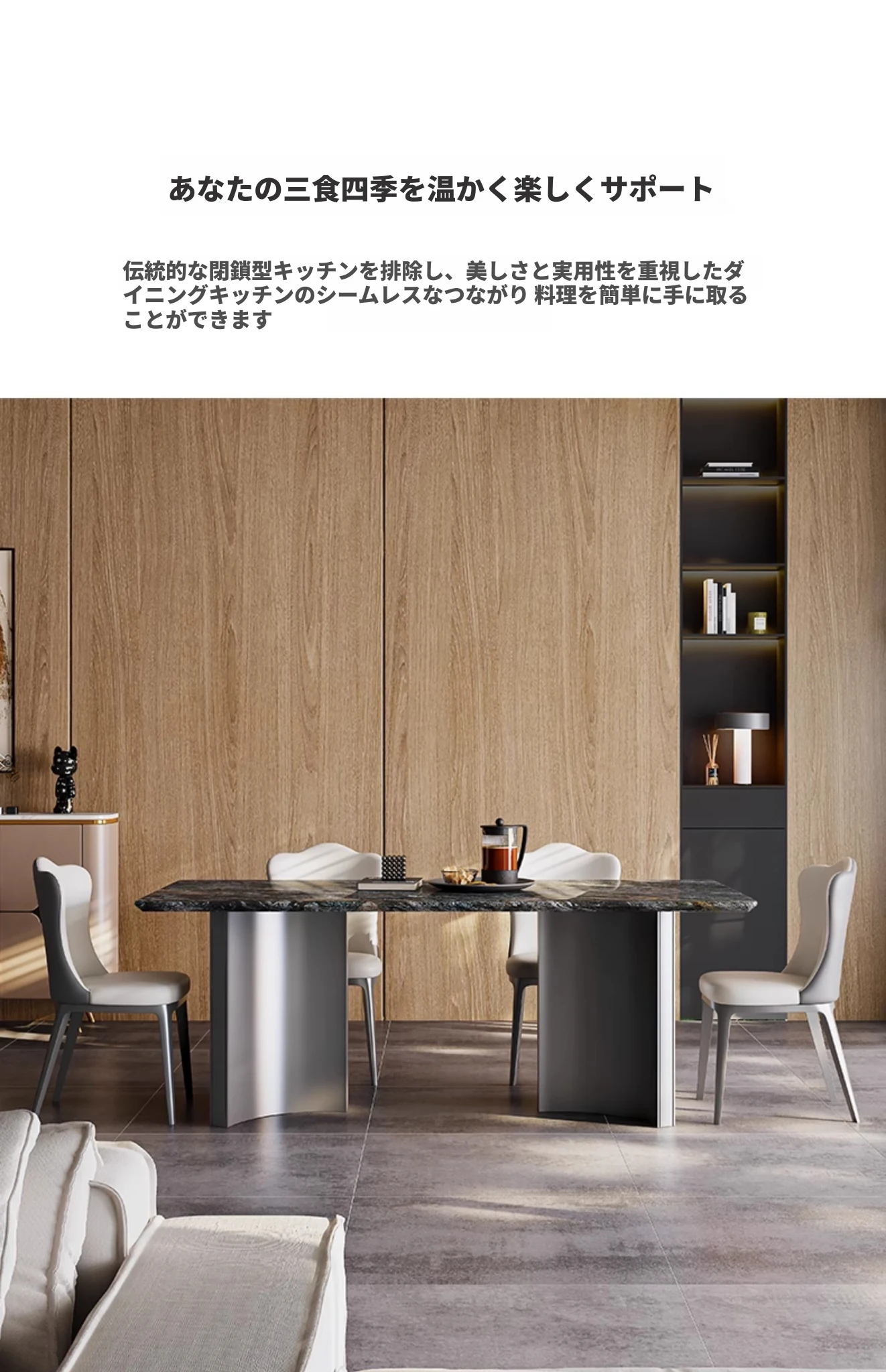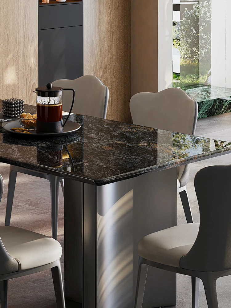 2025年新作!天然プラチナダイヤモンド仕上げの贅沢なイタリアンミニマリズムテーブル。高級感あふれる長方形大理石ダイニングテーブル&チェアセットで、洗練された空間を演出します!