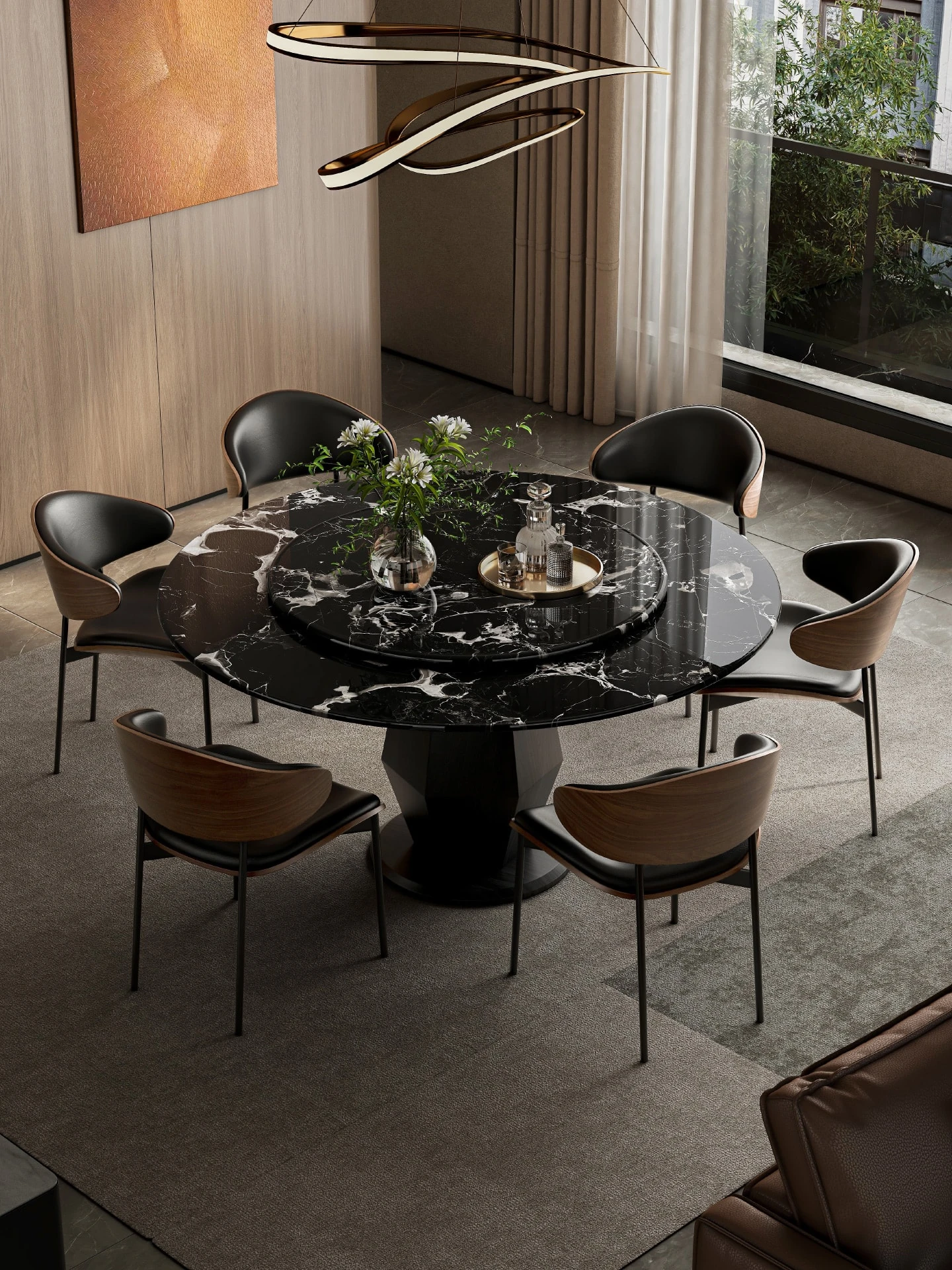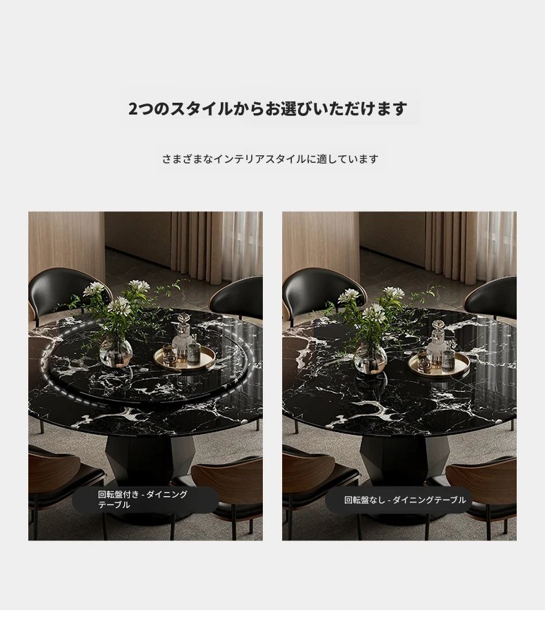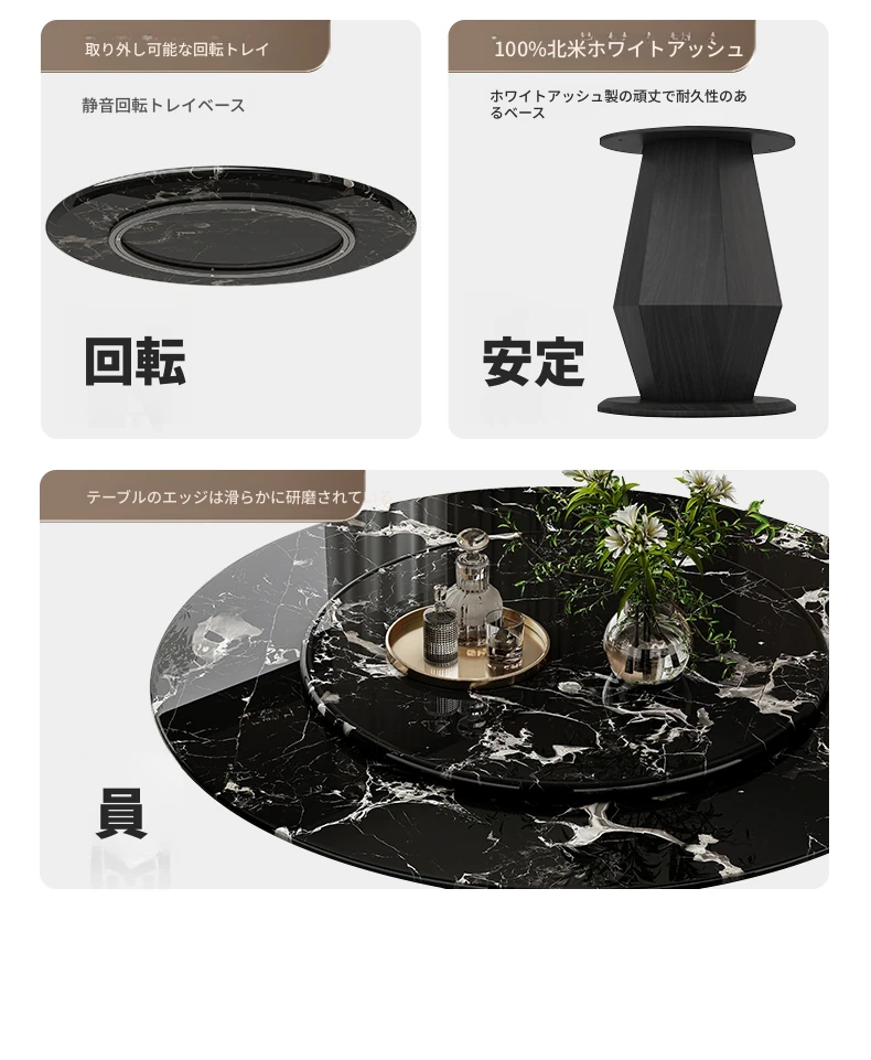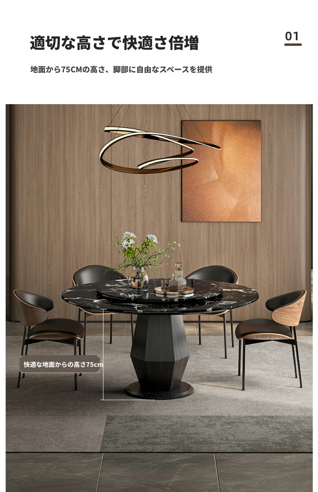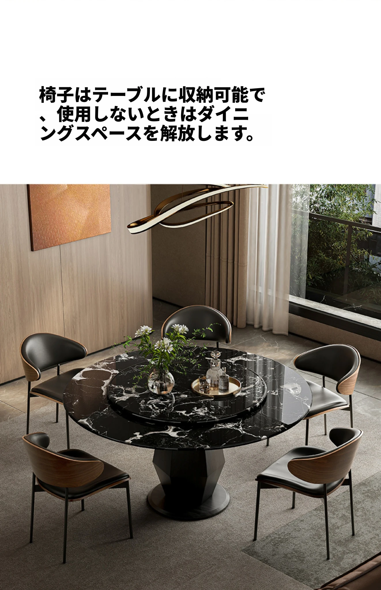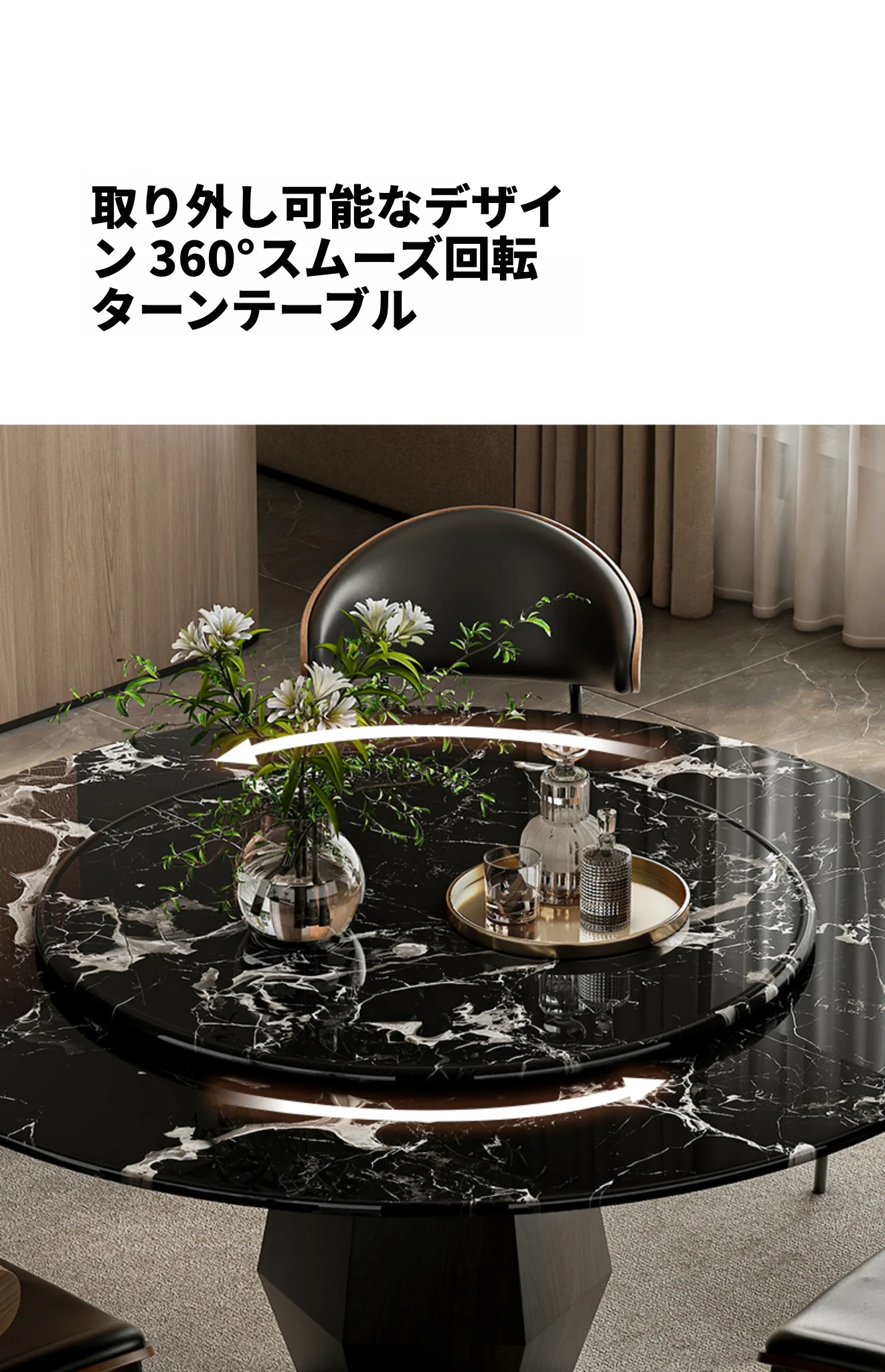 2025年新作!天然黒バラ石のラウンドダイニングテーブル - 小さな家にぴったりの回転式大理石&無垢材製。おしゃれで機能的なデザインで、食卓を華やかに彩ります!