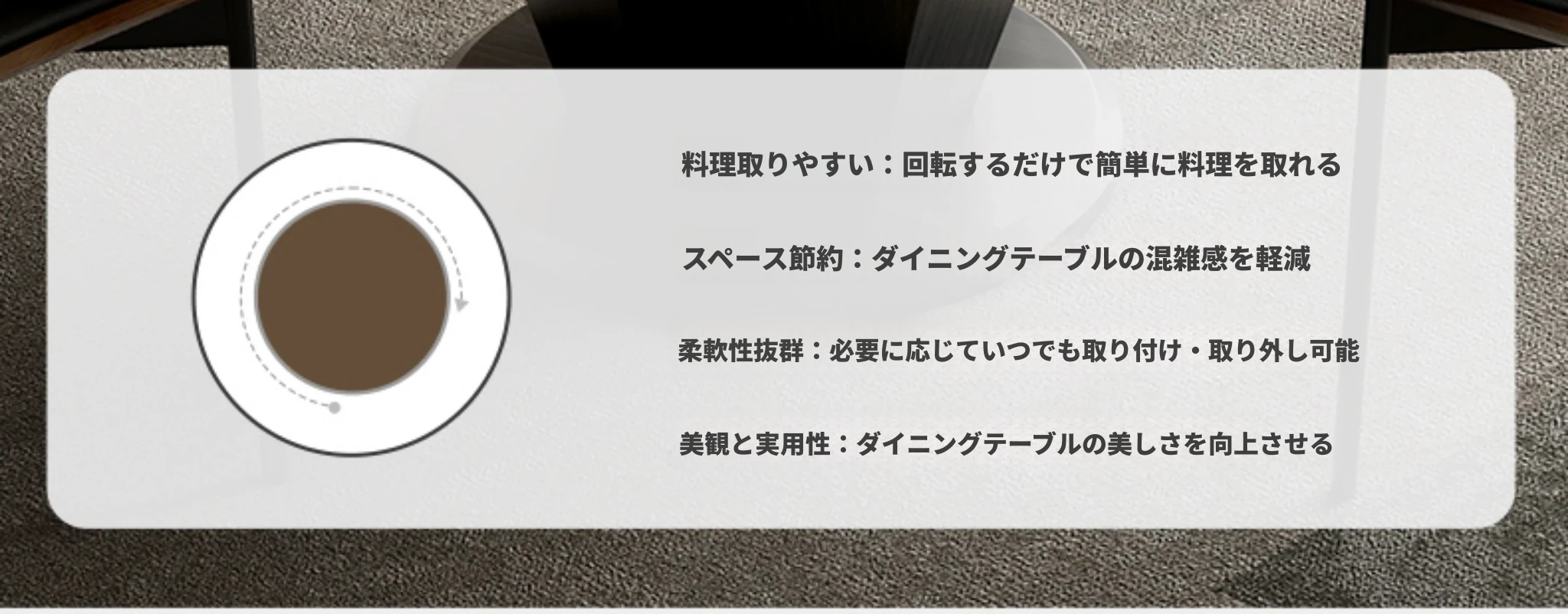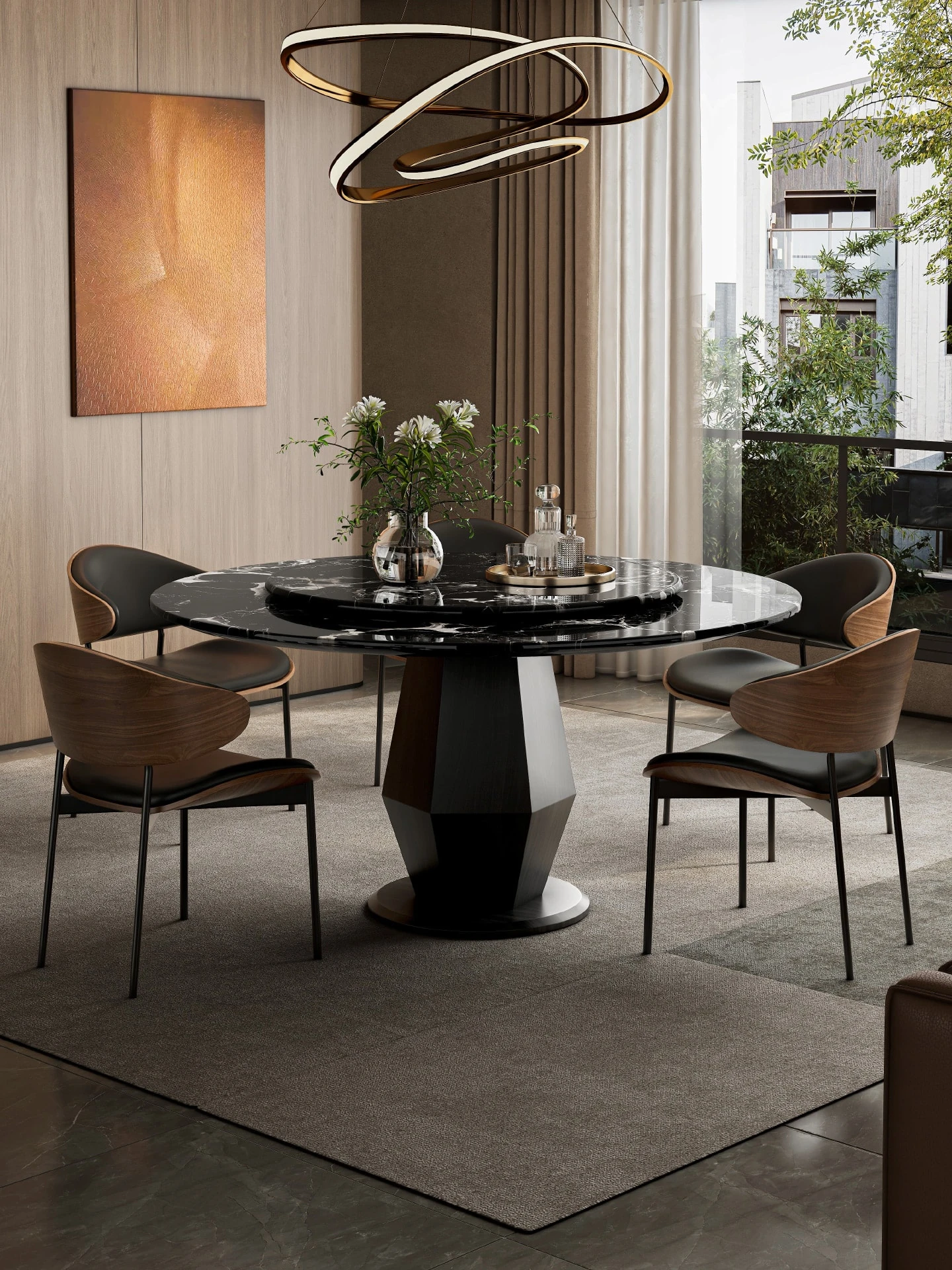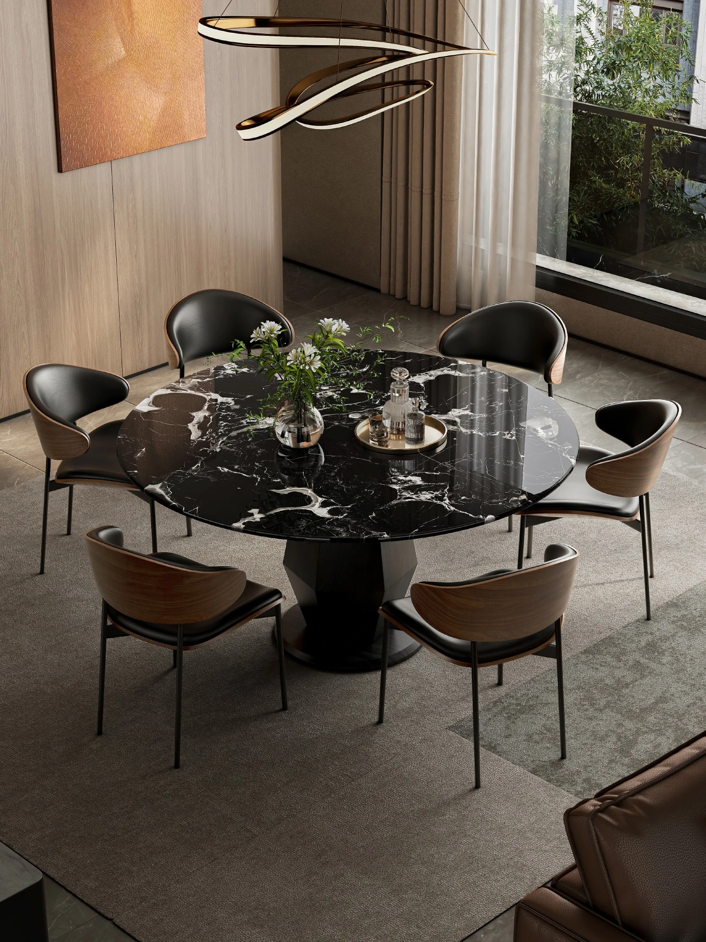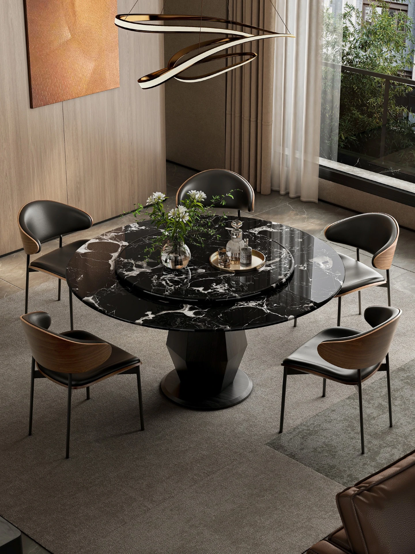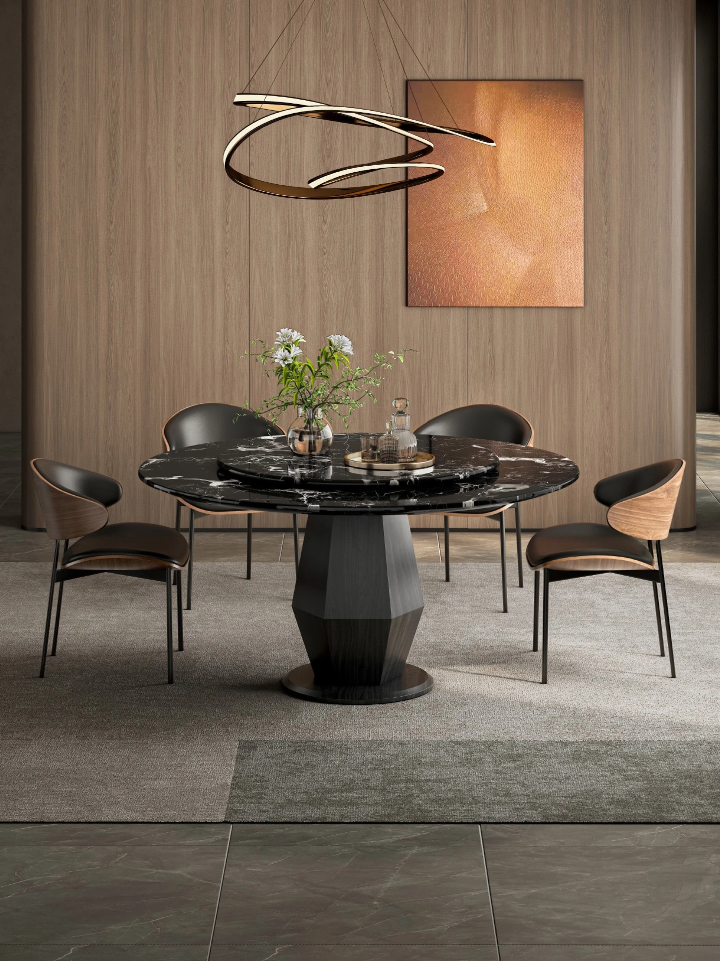 2025年新作!天然黒バラ石のラウンドダイニングテーブル - 小さな家にぴったりの回転式大理石&無垢材製。おしゃれで機能的なデザインで、食卓を華やかに彩ります!