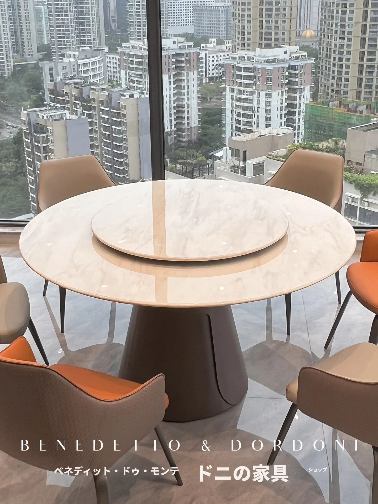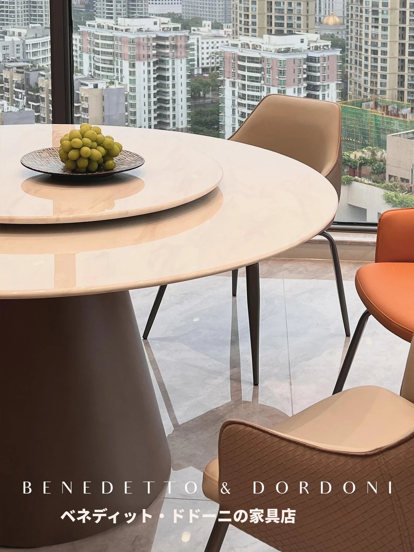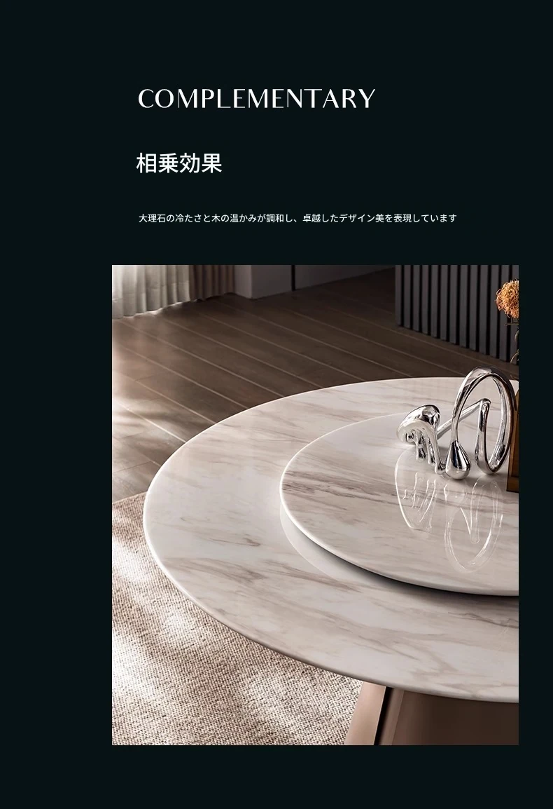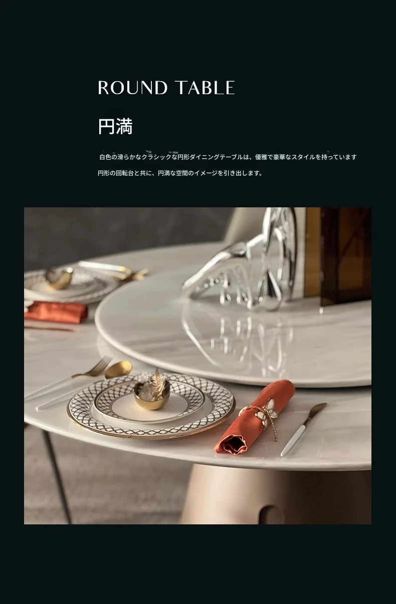 天然大理石製の高級ダイニングテーブルセット - デザイナーが手がけたイタリアンな軽やかさを持つラグジュアリーな円形テーブル、回転式プレート付きで家族や友人との特別な食卓を演出!