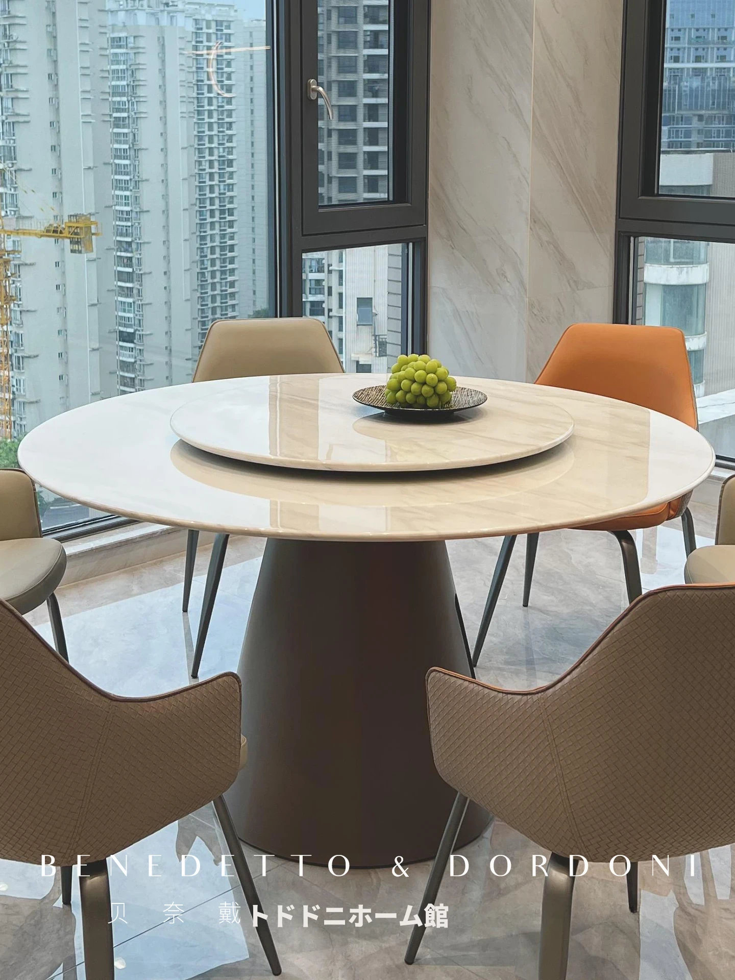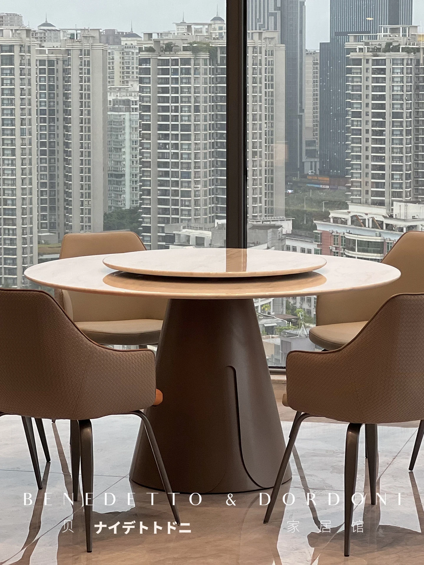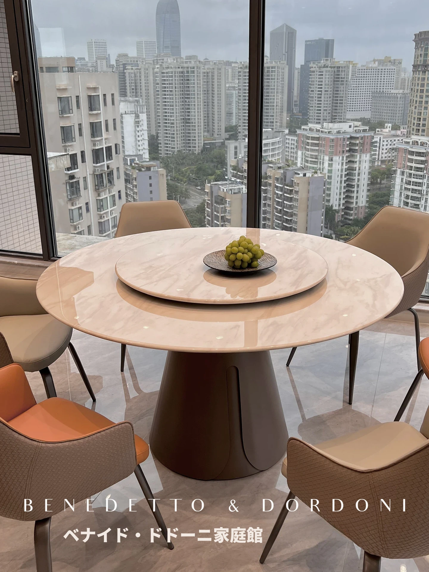 天然大理石製の高級ダイニングテーブルセット - デザイナーが手がけたイタリアンな軽やかさを持つラグジュアリーな円形テーブル、回転式プレート付きで家族や友人との特別な食卓を演出!