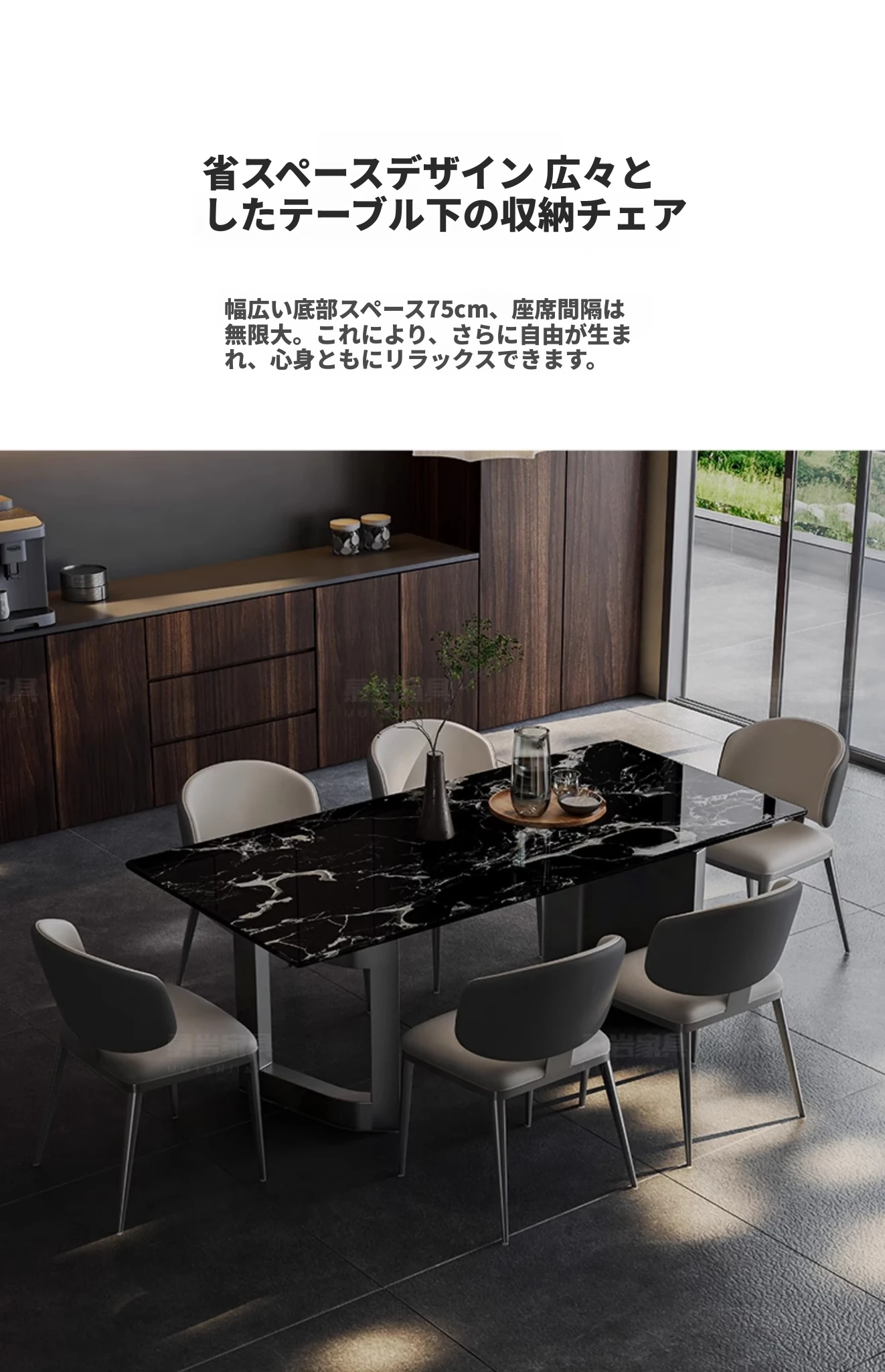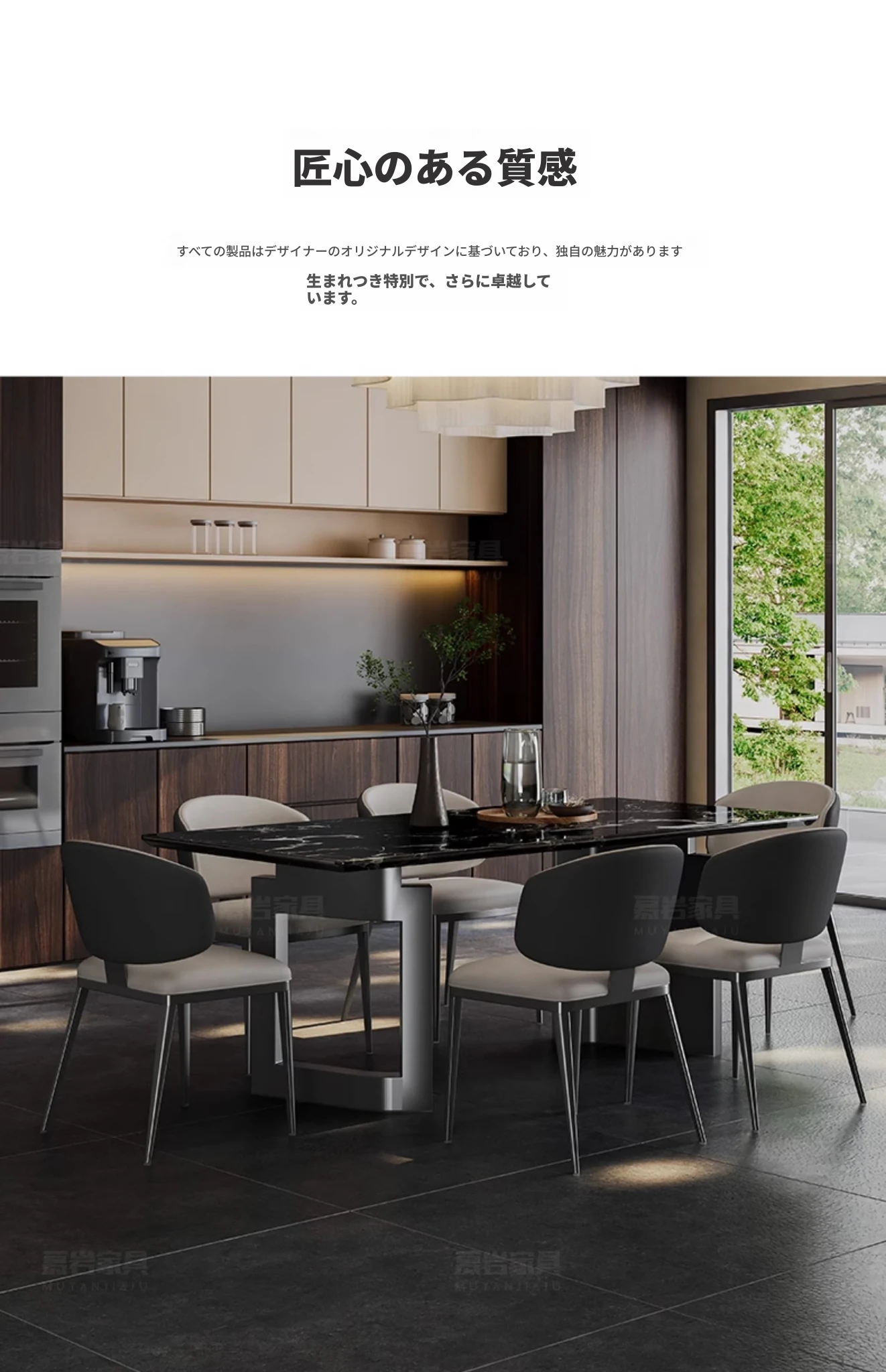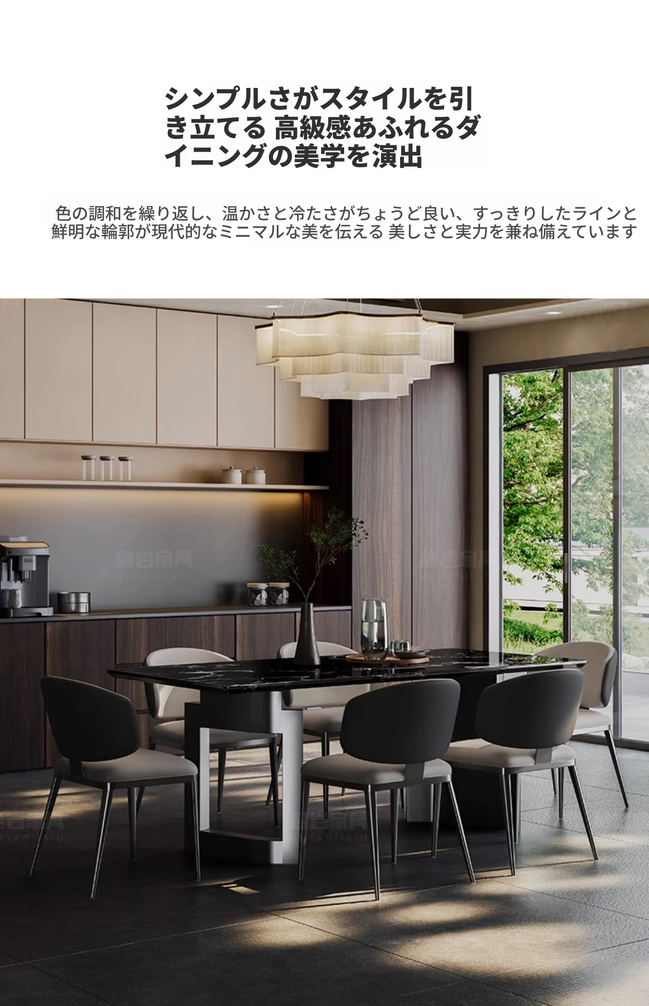 【Aランク】ブラックローズ天然豪華石製ダイニングテーブル+本革ダイニングチェア*6