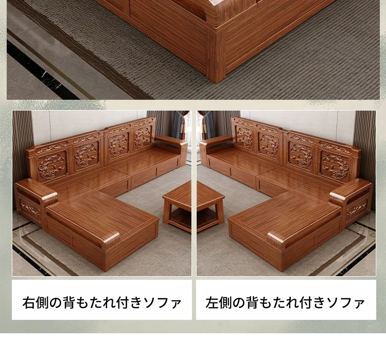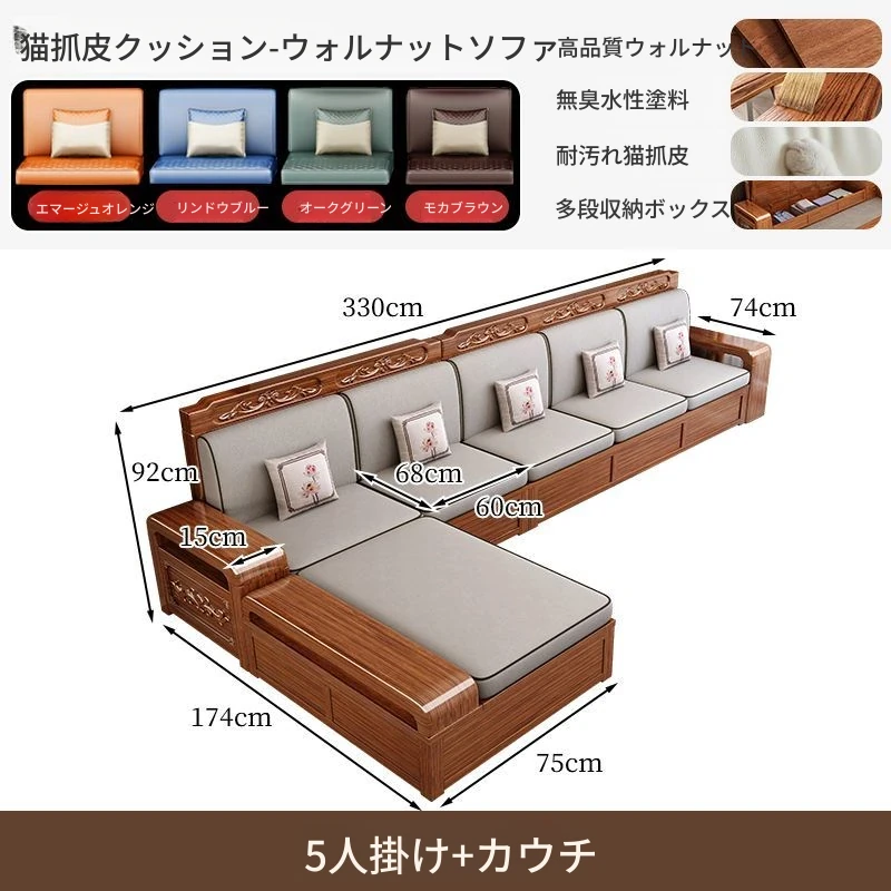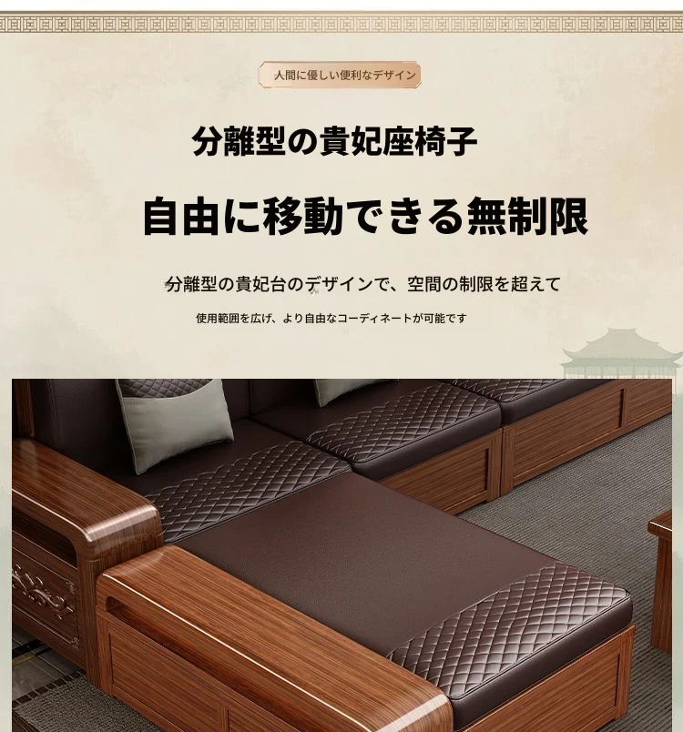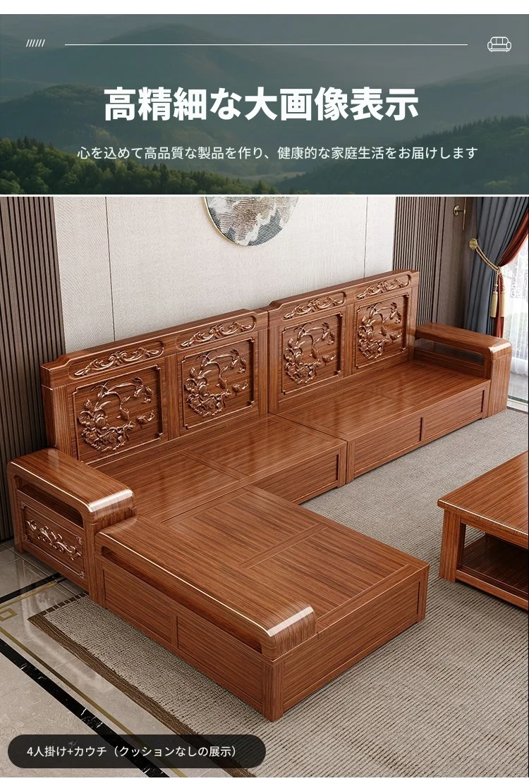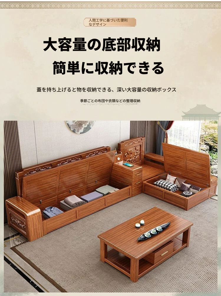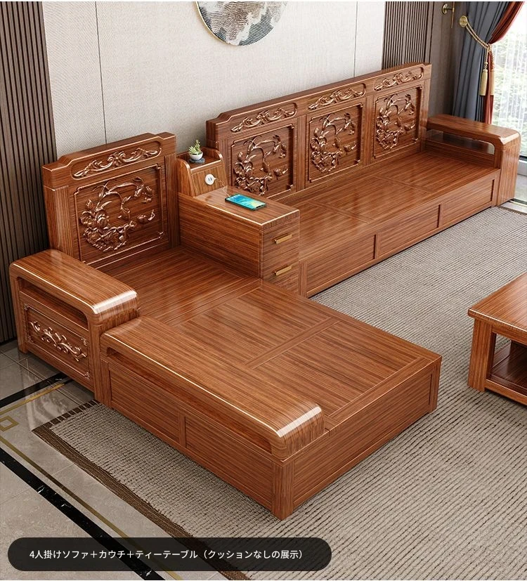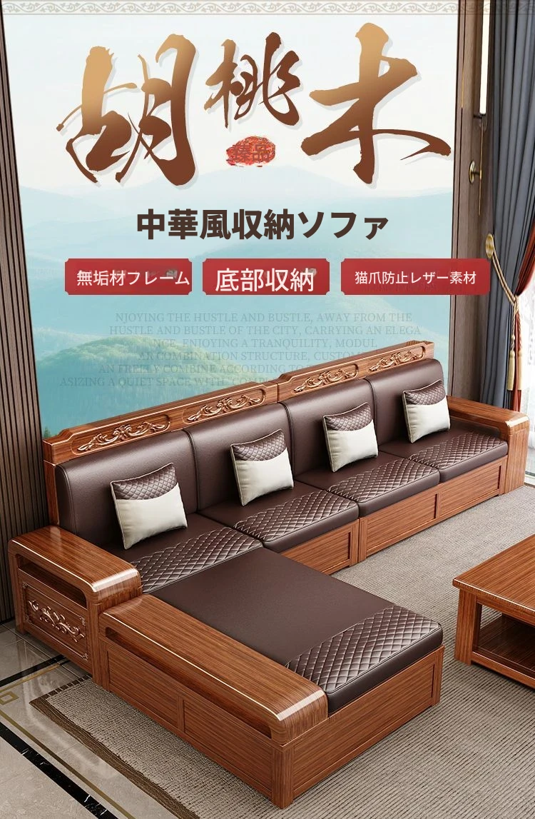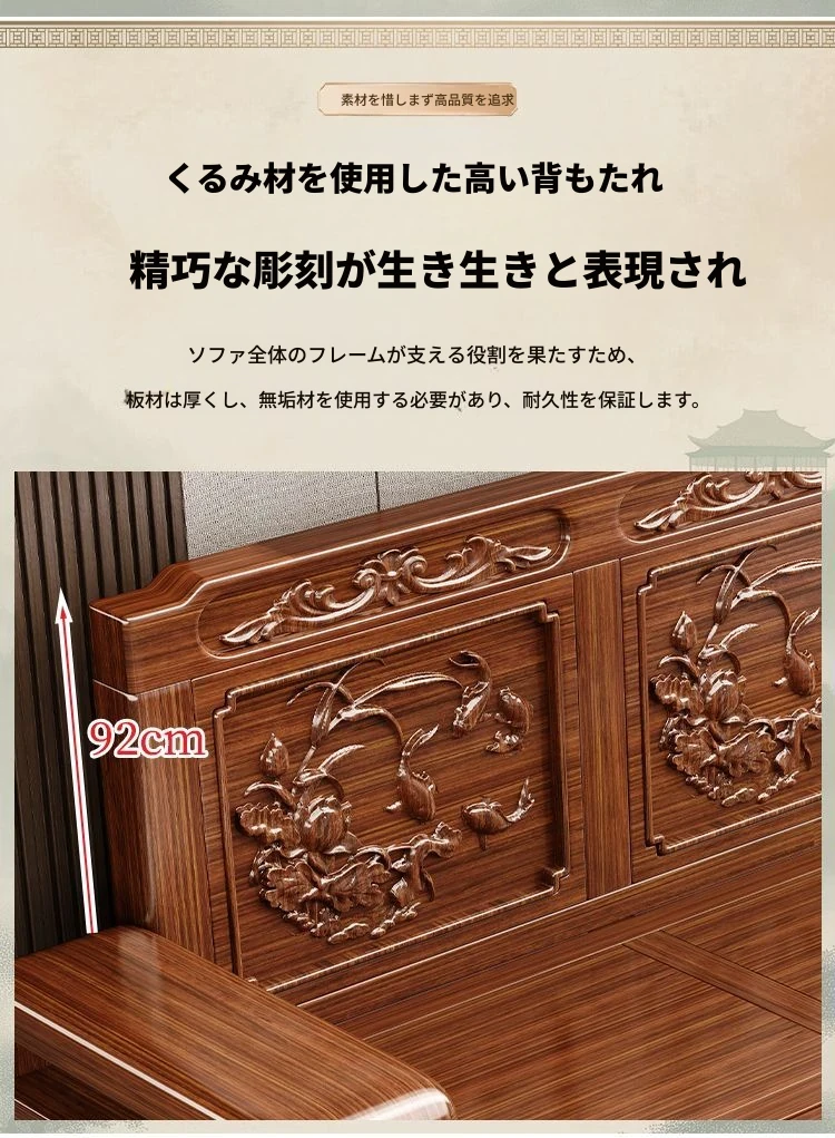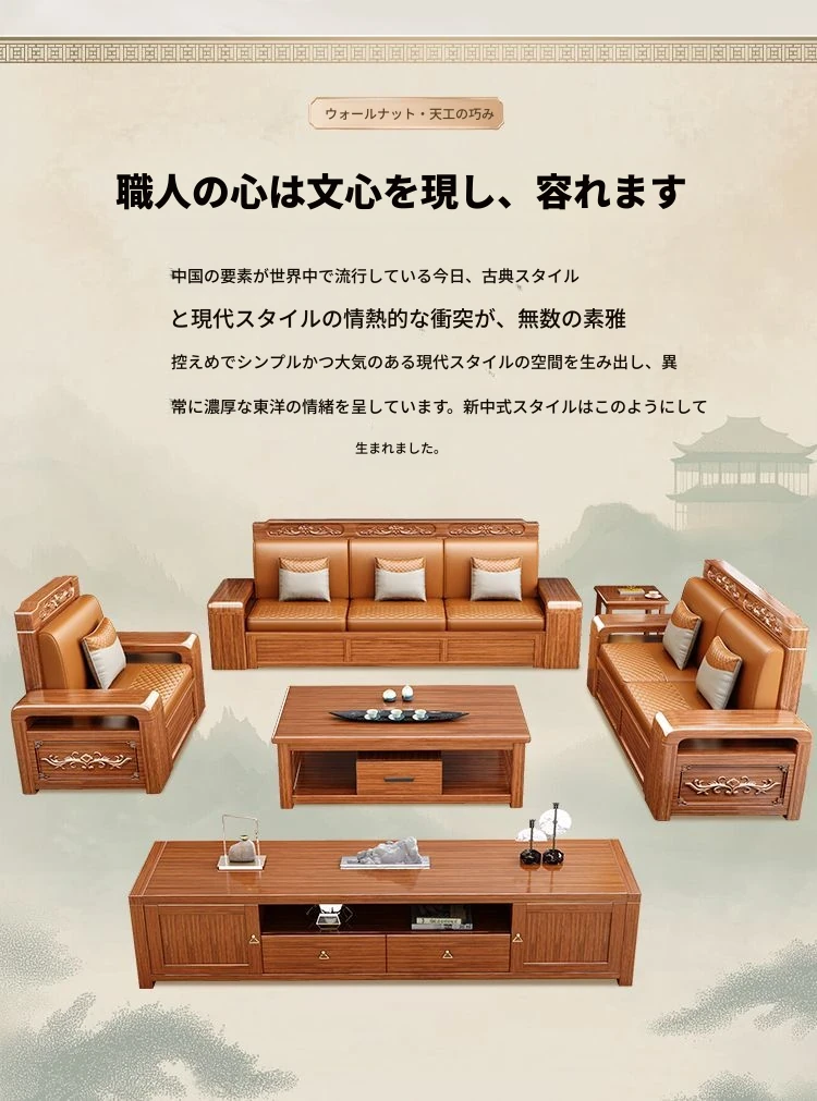 新中式デザインのウォールナット無垢材ソファセット - 大小様々なお部屋に最適、リビングと収納を兼ね備えた彫刻入り家具!快適なひとときを演出します。