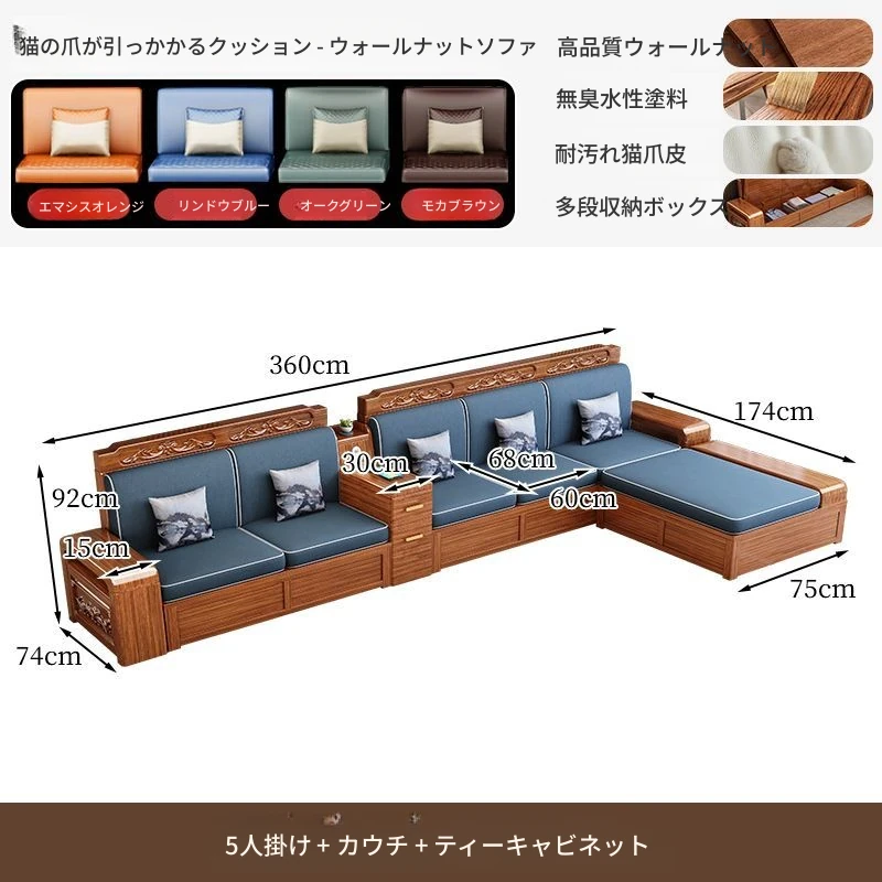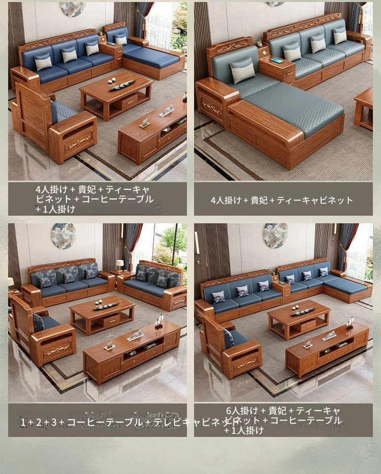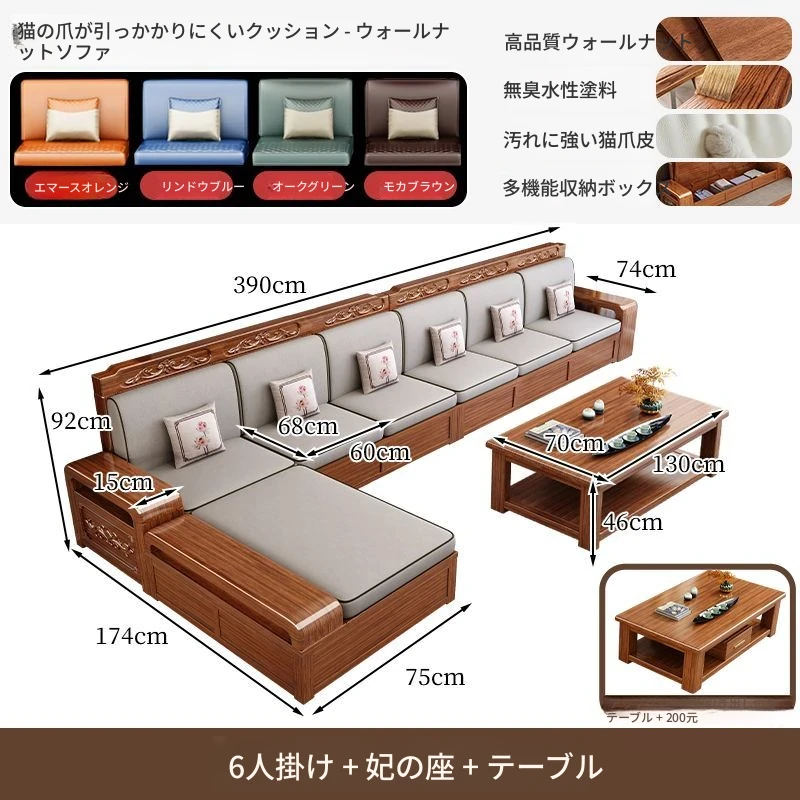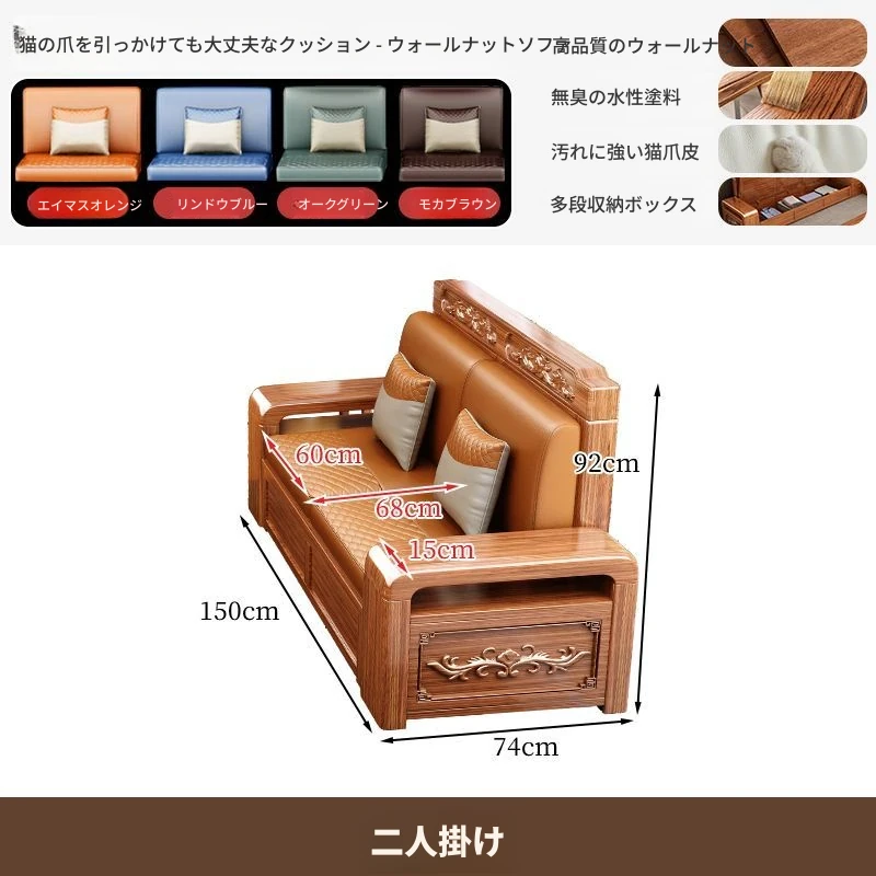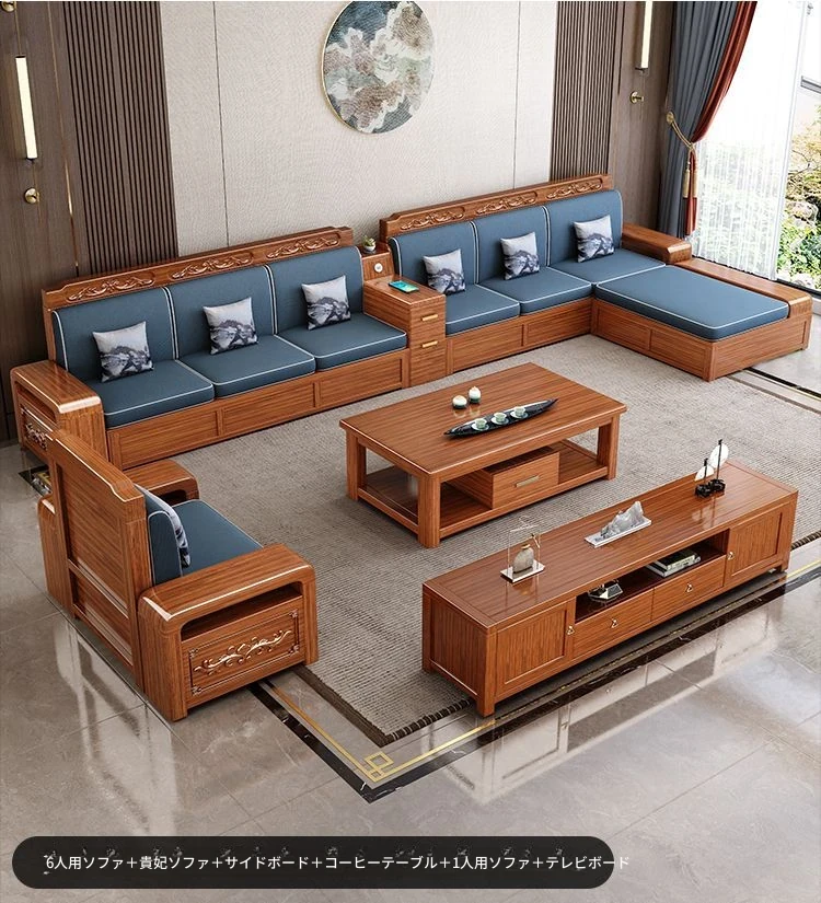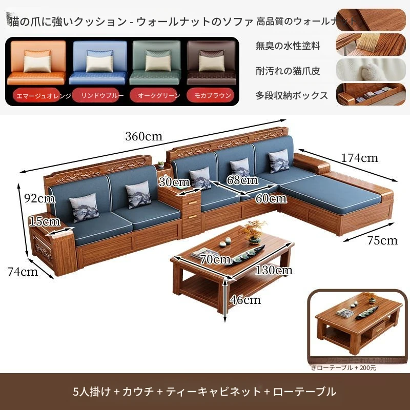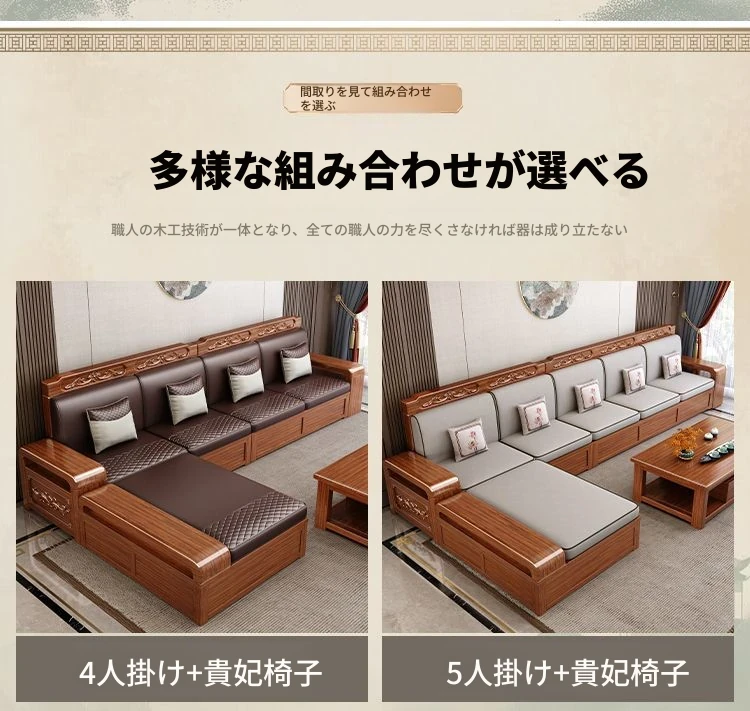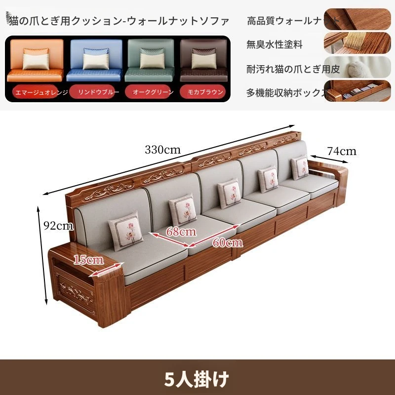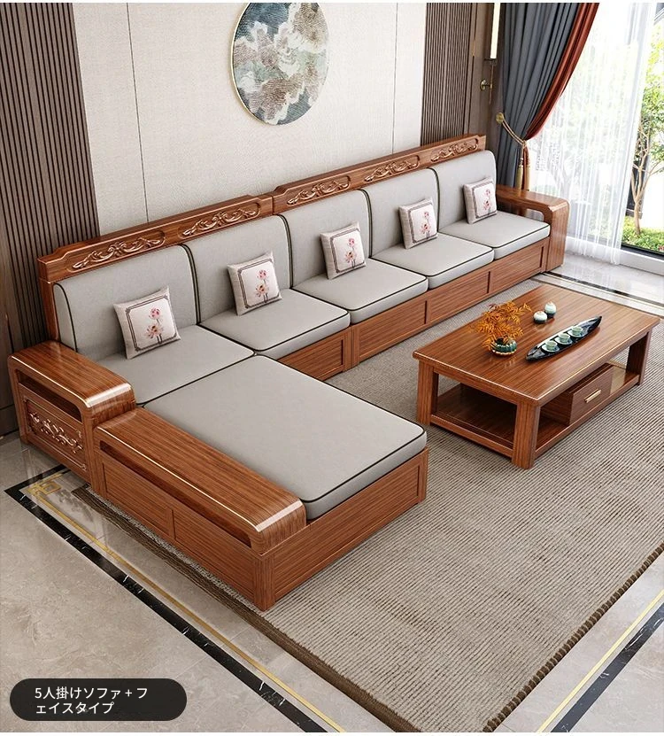 新中式デザインのウォールナット無垢材ソファセット - 大小様々なお部屋に最適、リビングと収納を兼ね備えた彫刻入り家具!快適なひとときを演出します。