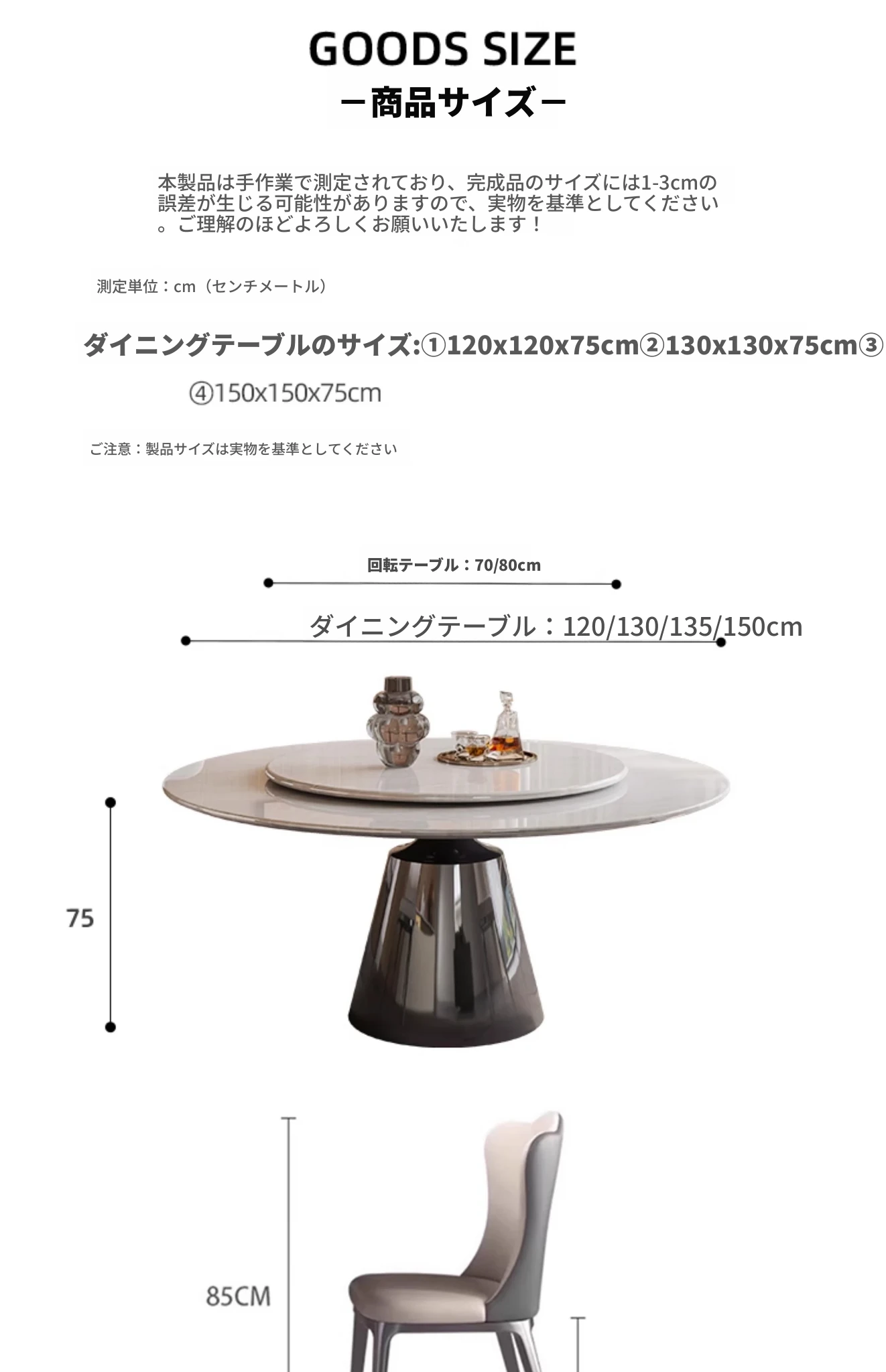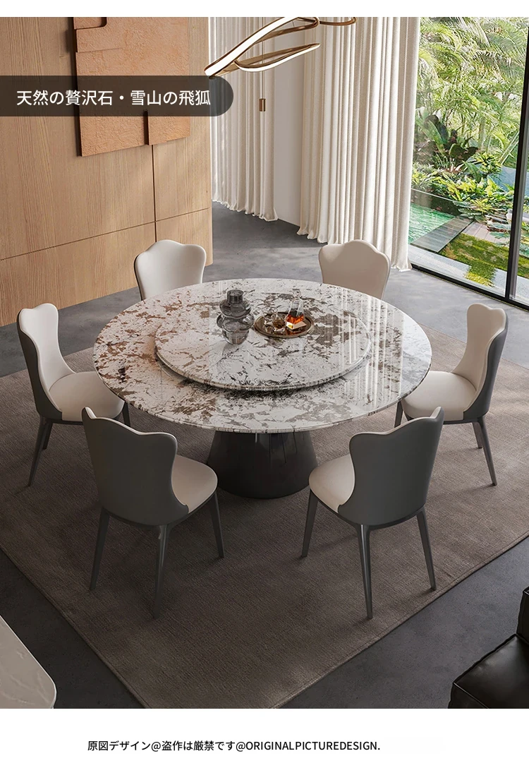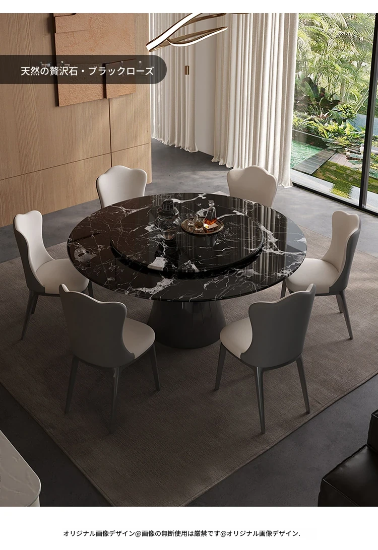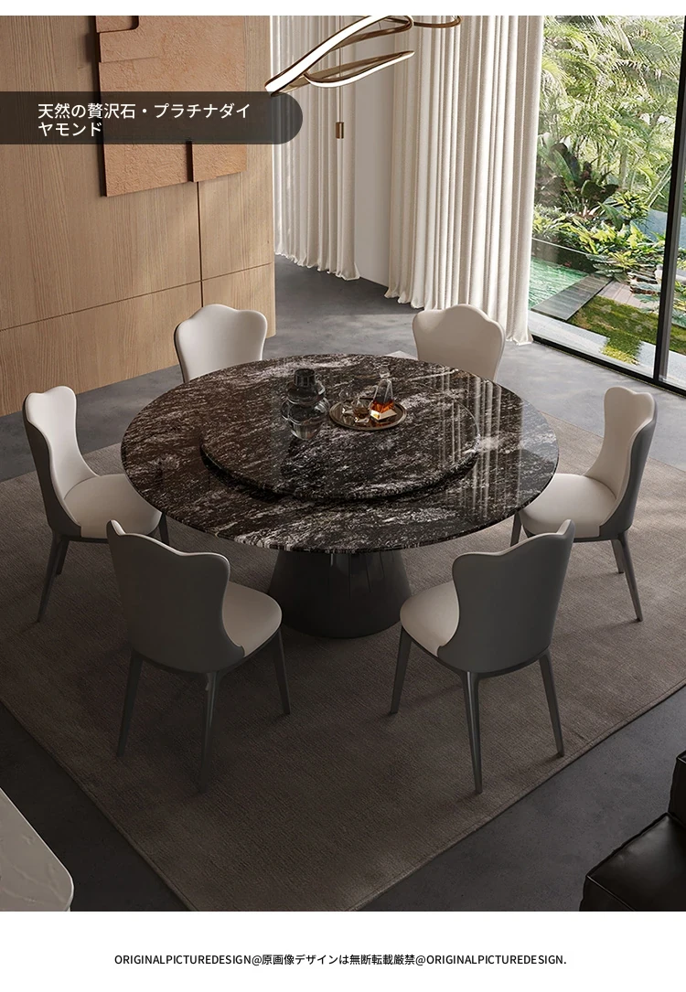 ヴェネツィアブラウン・天然ラグジュアリーストーン円形ダイニングテーブル【回転盤付き】+雲朵本革ダイニングチェア*6