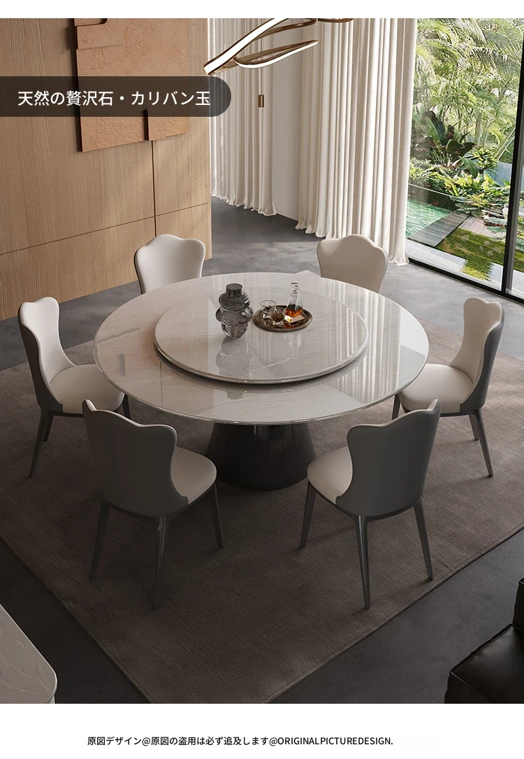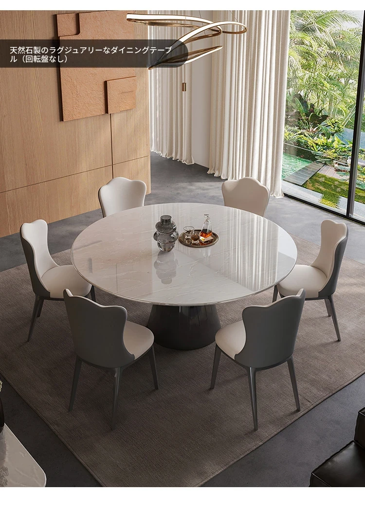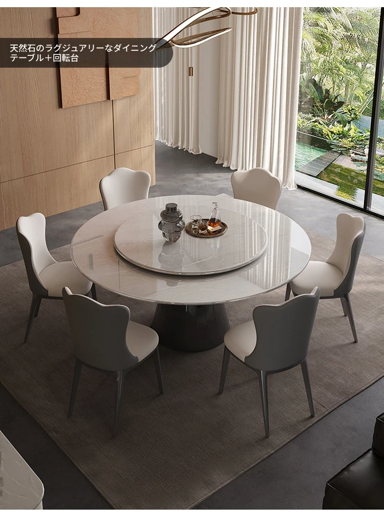 カリビング玉・天然ラグジュアリーストーン円形ダイニングテーブル【回転盤付き】+雲朵本革ダイニングチェア*6