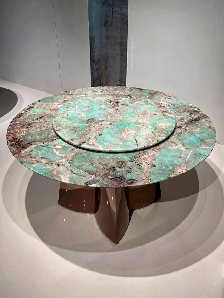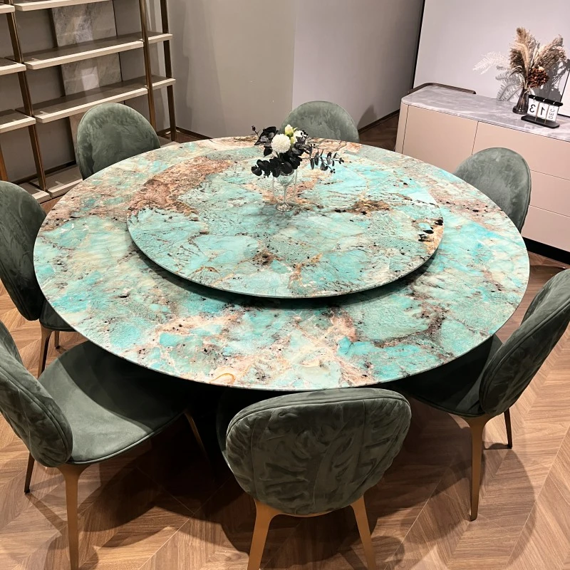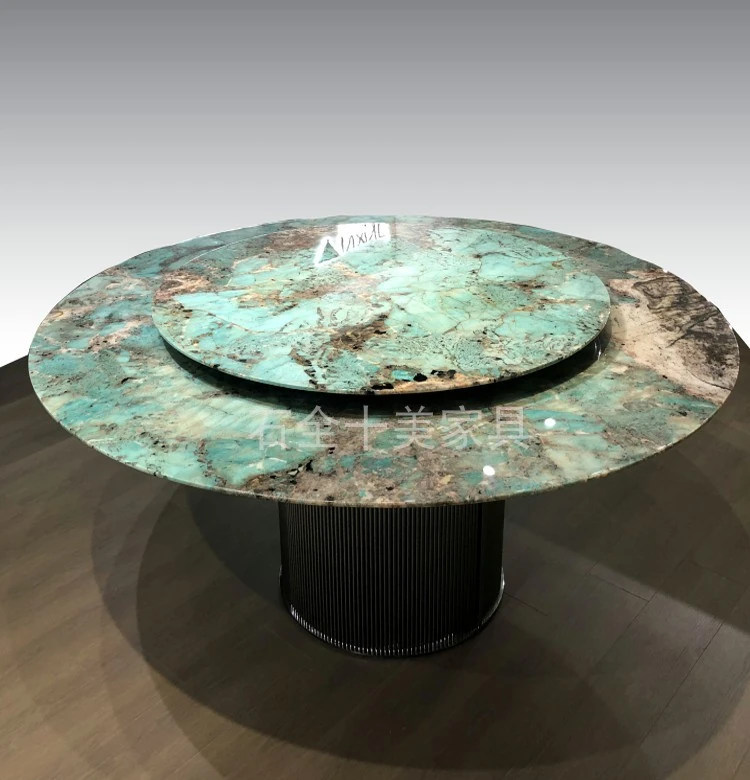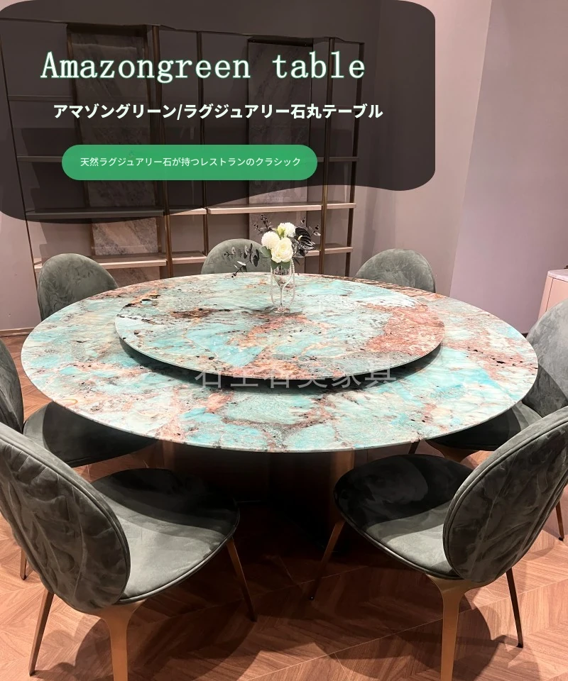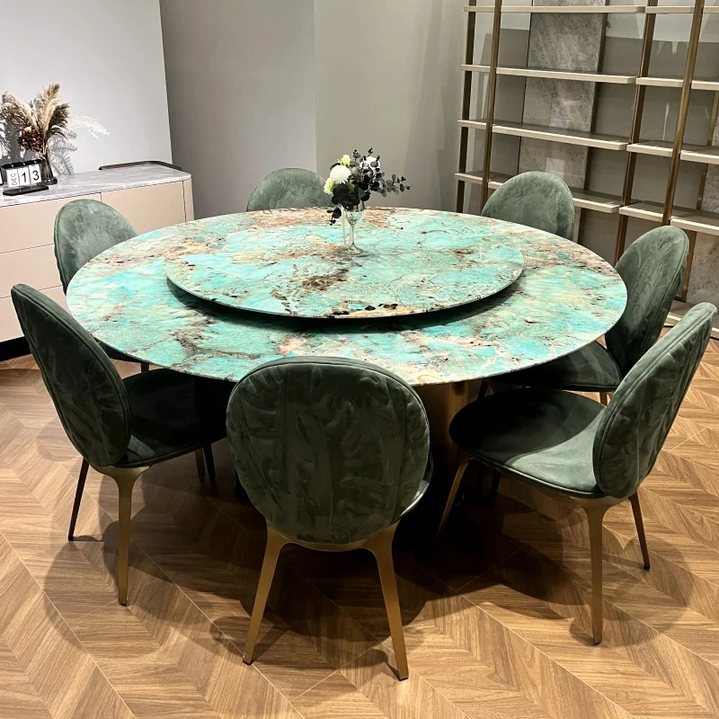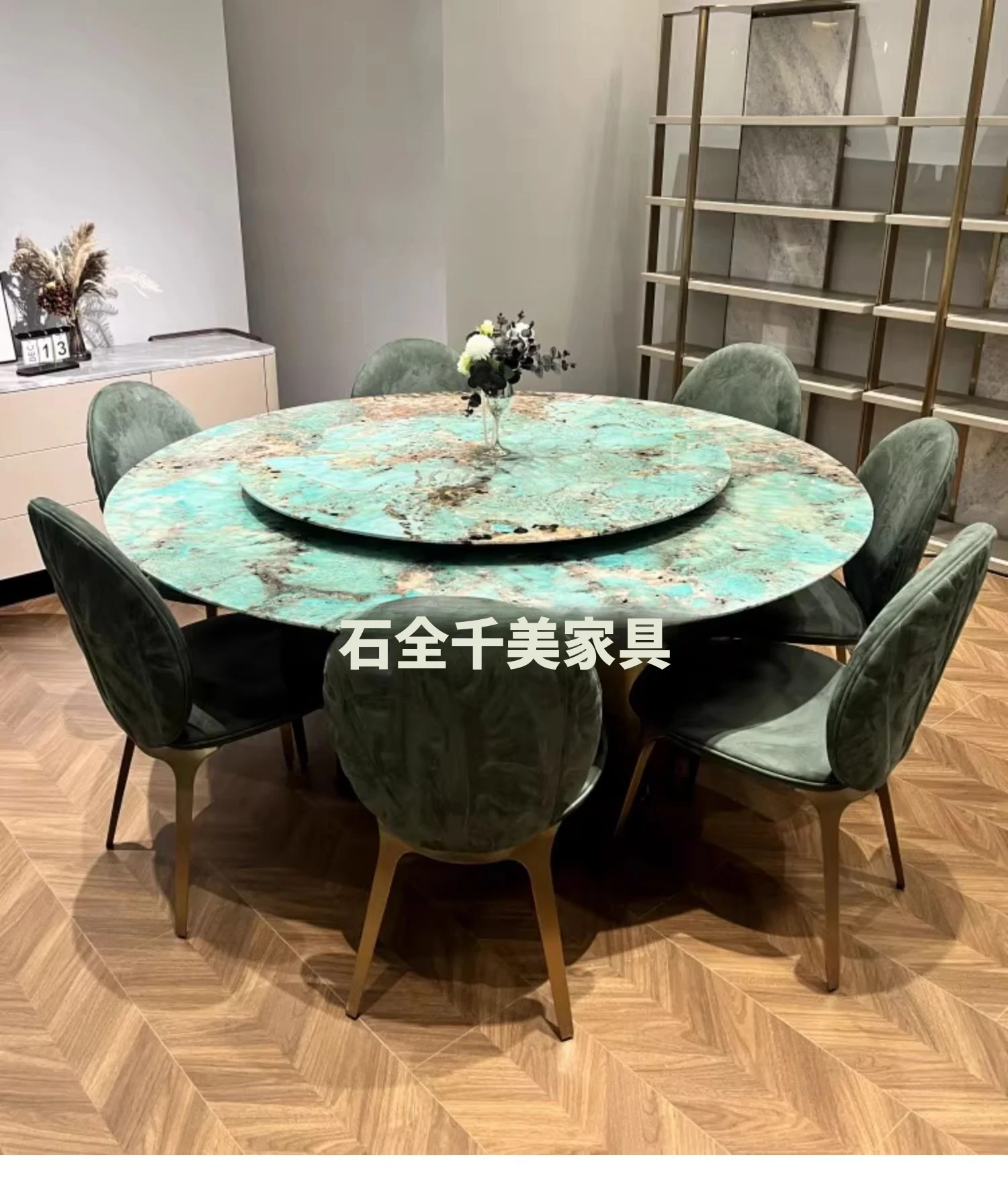 高級アマゾンのグリーンラグジュアリー石製ダイニングテーブル - 自然大理石のラウンドテーブル、回転トレイ付き、軽やかな贅沢な別荘スタイルの家庭用食卓。