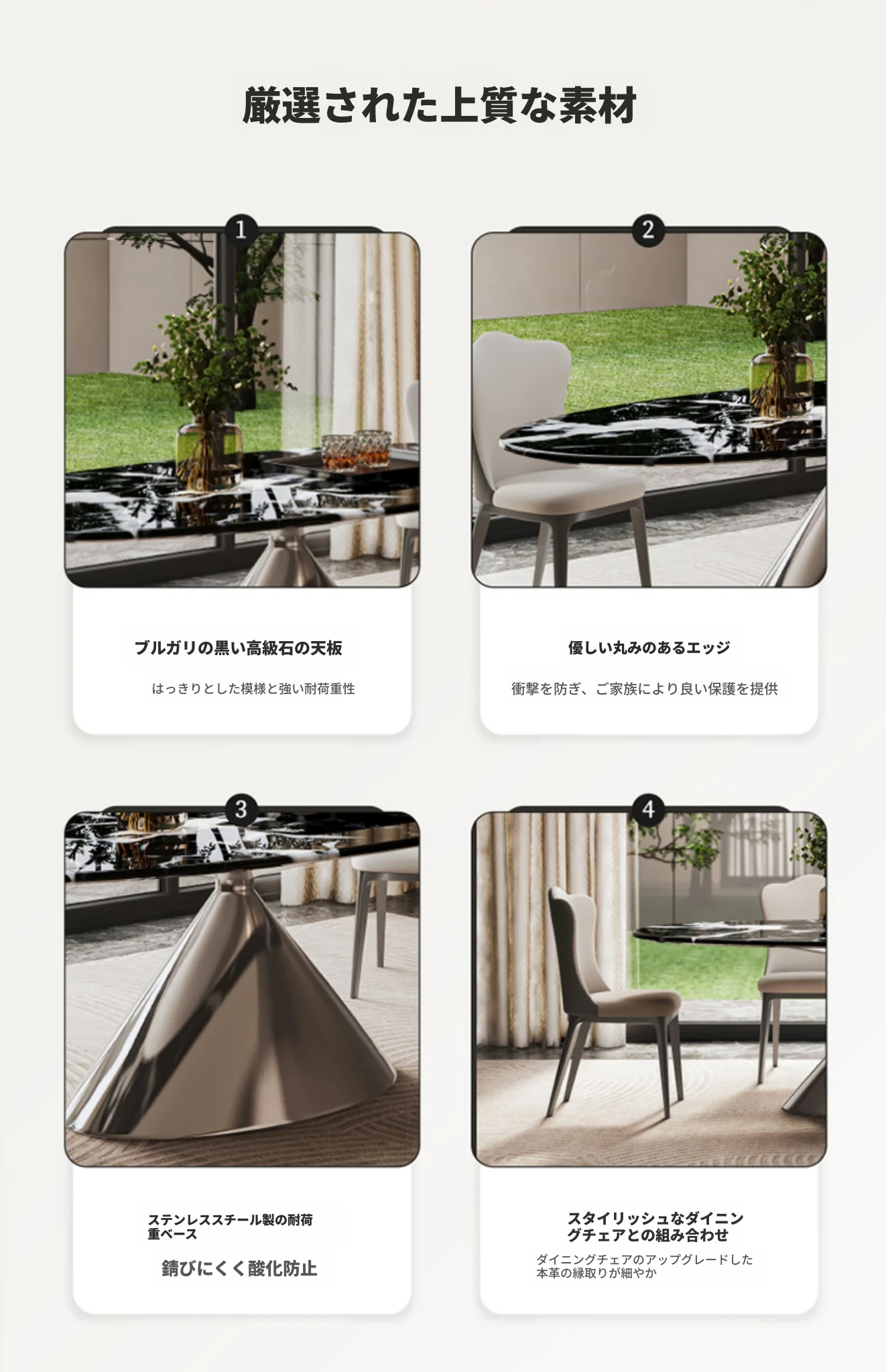 【S級】ブラックローズ天然ラグジュアリーストーンダイニングテーブル【偽りは罰十】+本革クラウドダイニングチェア*4