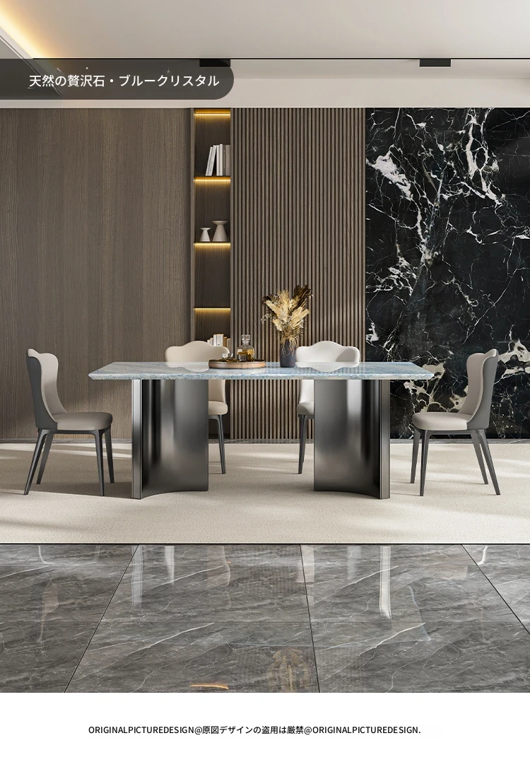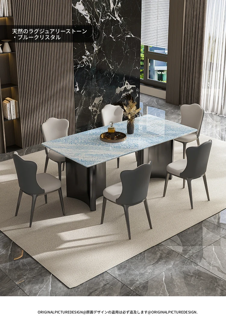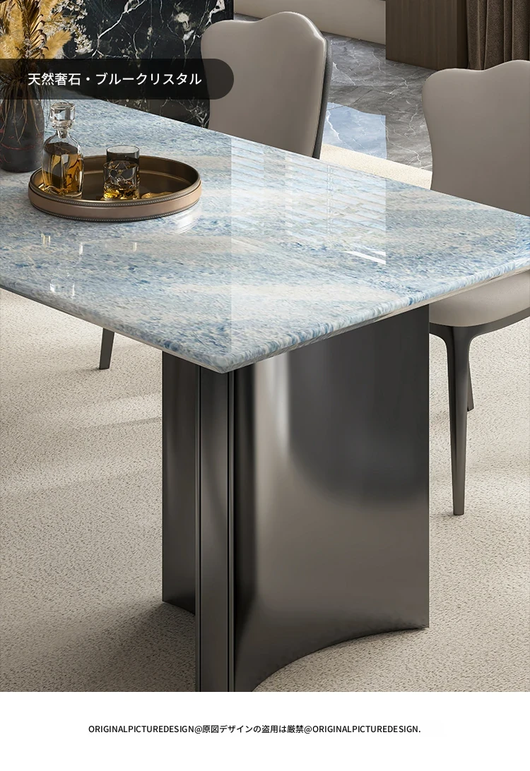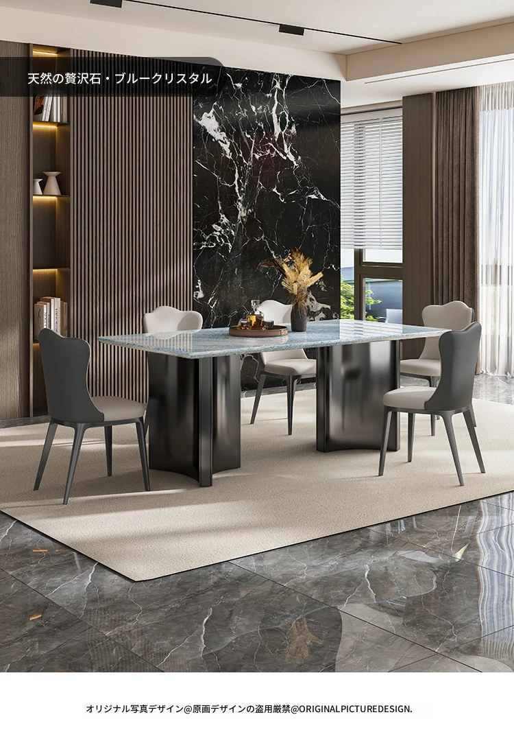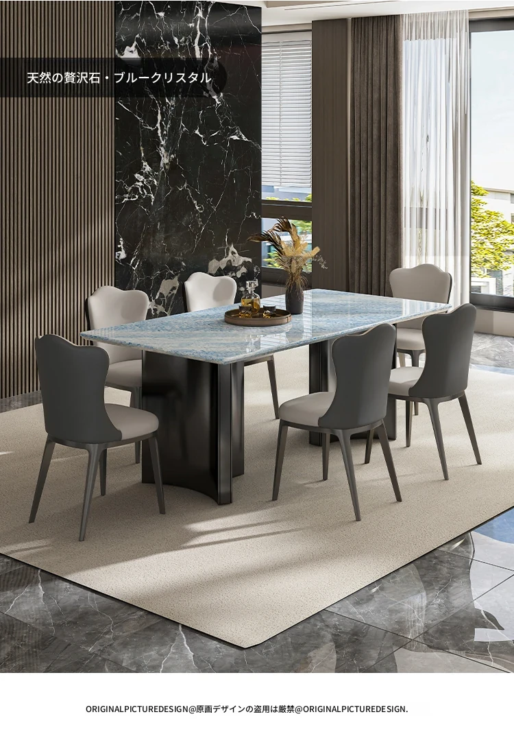 天然ブルークリスタル豪華石テーブル|高級デザインのダイニングテーブルセット|ラグジュアリーな別荘スタイルの長方形大理石テーブル&チェア|上品な食卓を演出します!