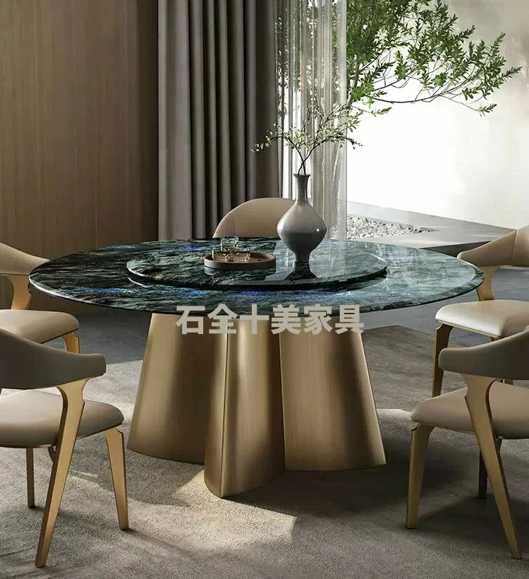 ラピスラズリの天然豪華石を使用したラウンドダイニングテーブル - 高級感溢れる大理石製、回転式プレート付き、別荘や家庭にぴったりの軽やかなラグジュアリー感を演出します!