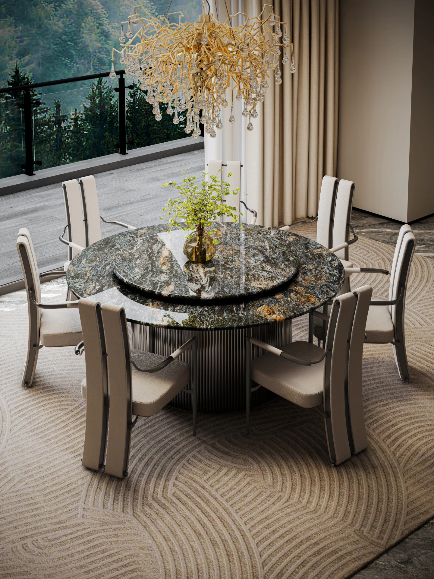 【S級】プラチナダイヤモンド・天然ラグジュアリーストーンラウンドダイニングテーブル+マスターチェア*8