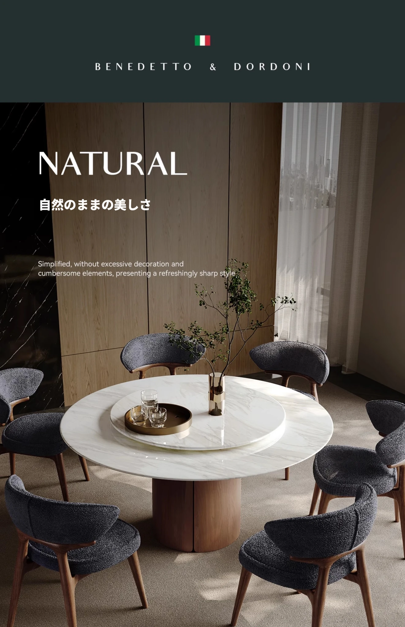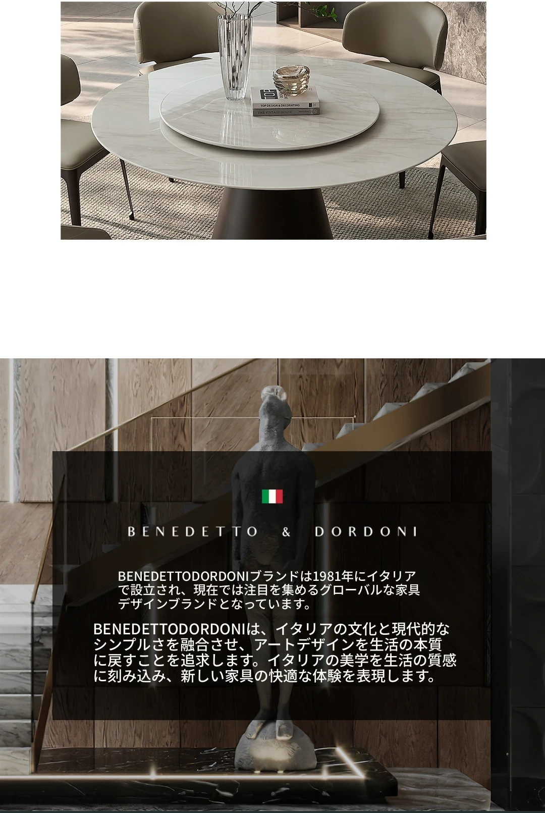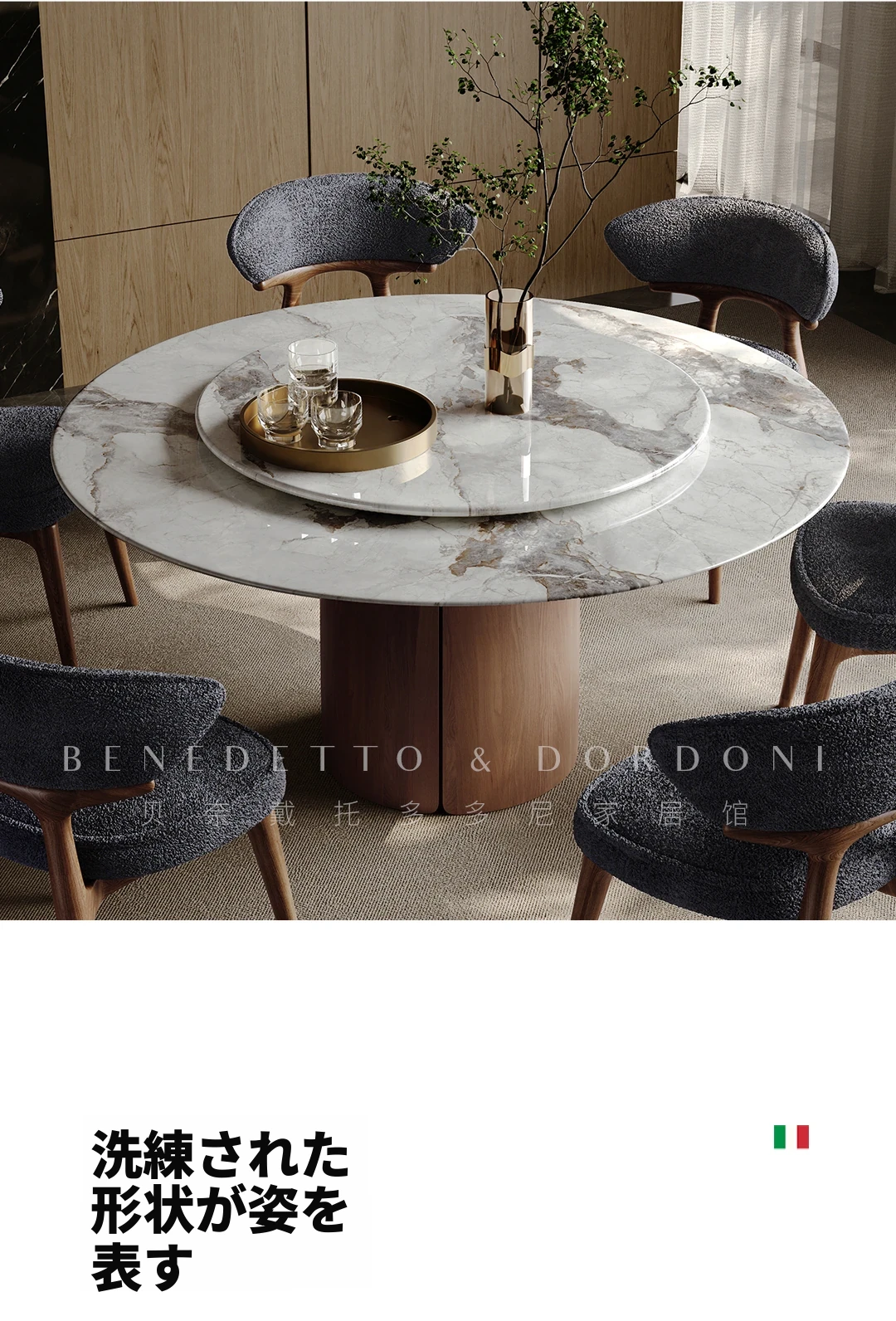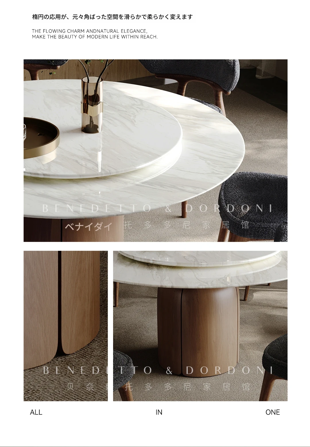 高級感溢れる大理石ダイニングテーブル|モダンなラウンドデザインの転回式|侘寂の美しさを体現した無垢材使用|イタリアンミニマリズムの極み、あなたの食卓を格上げする特別な一品!
