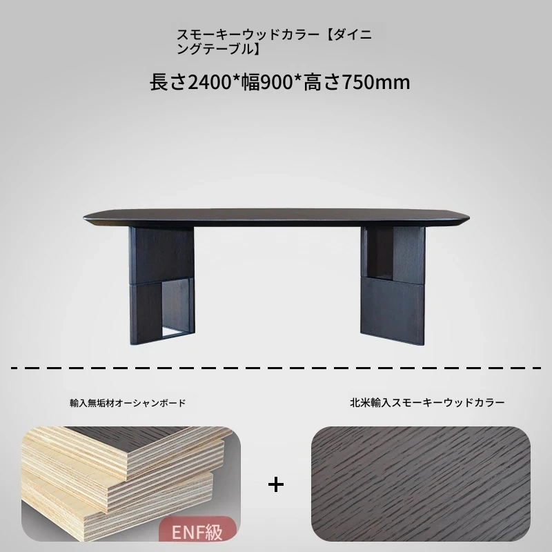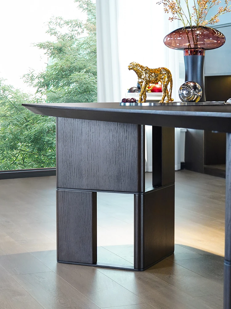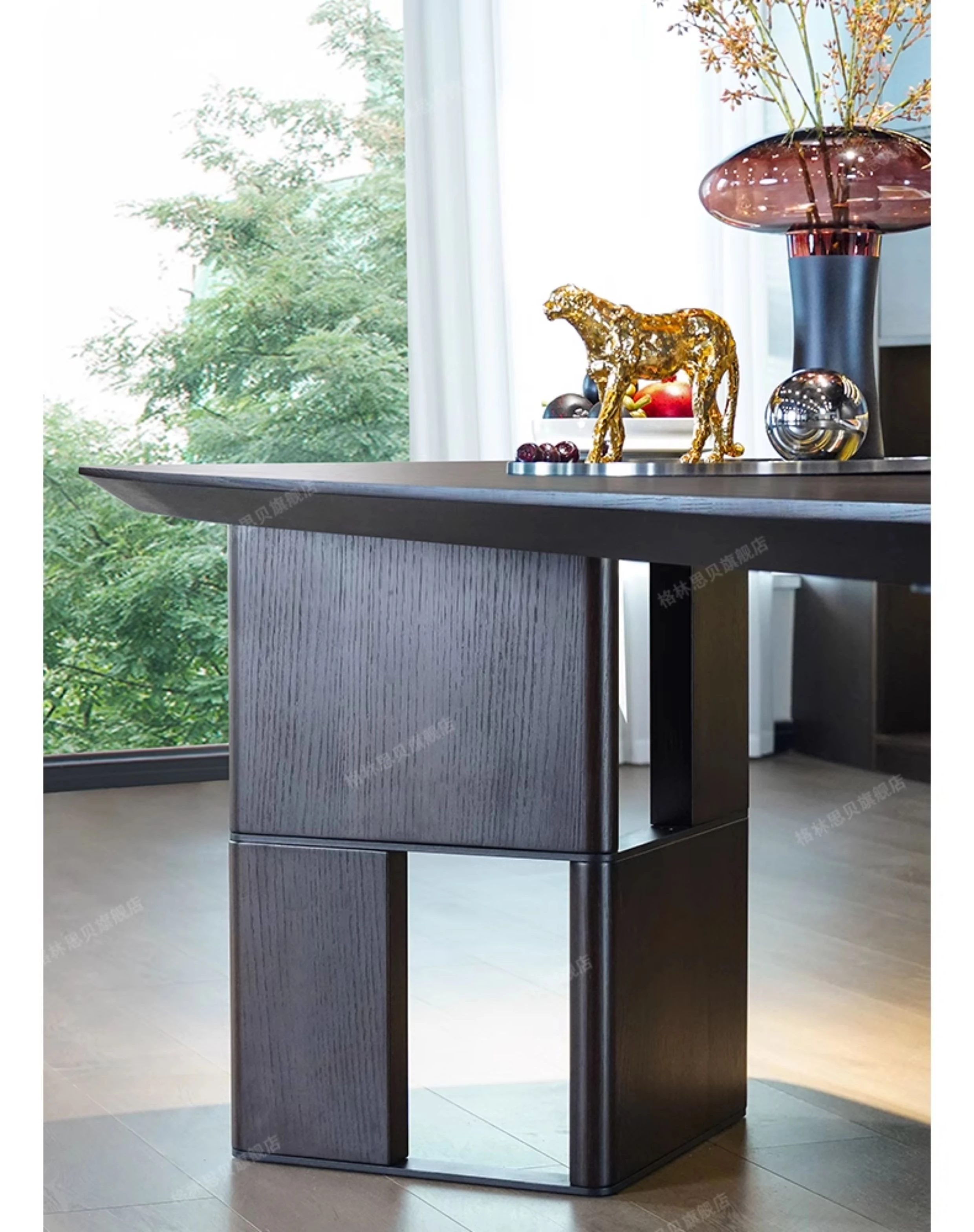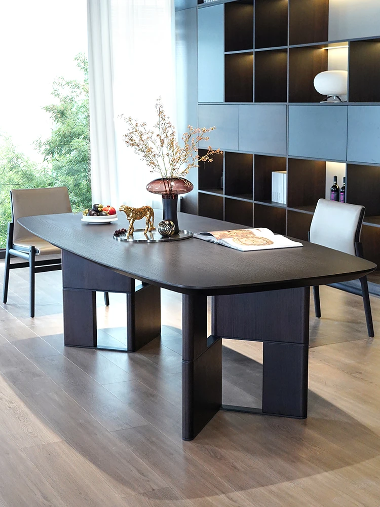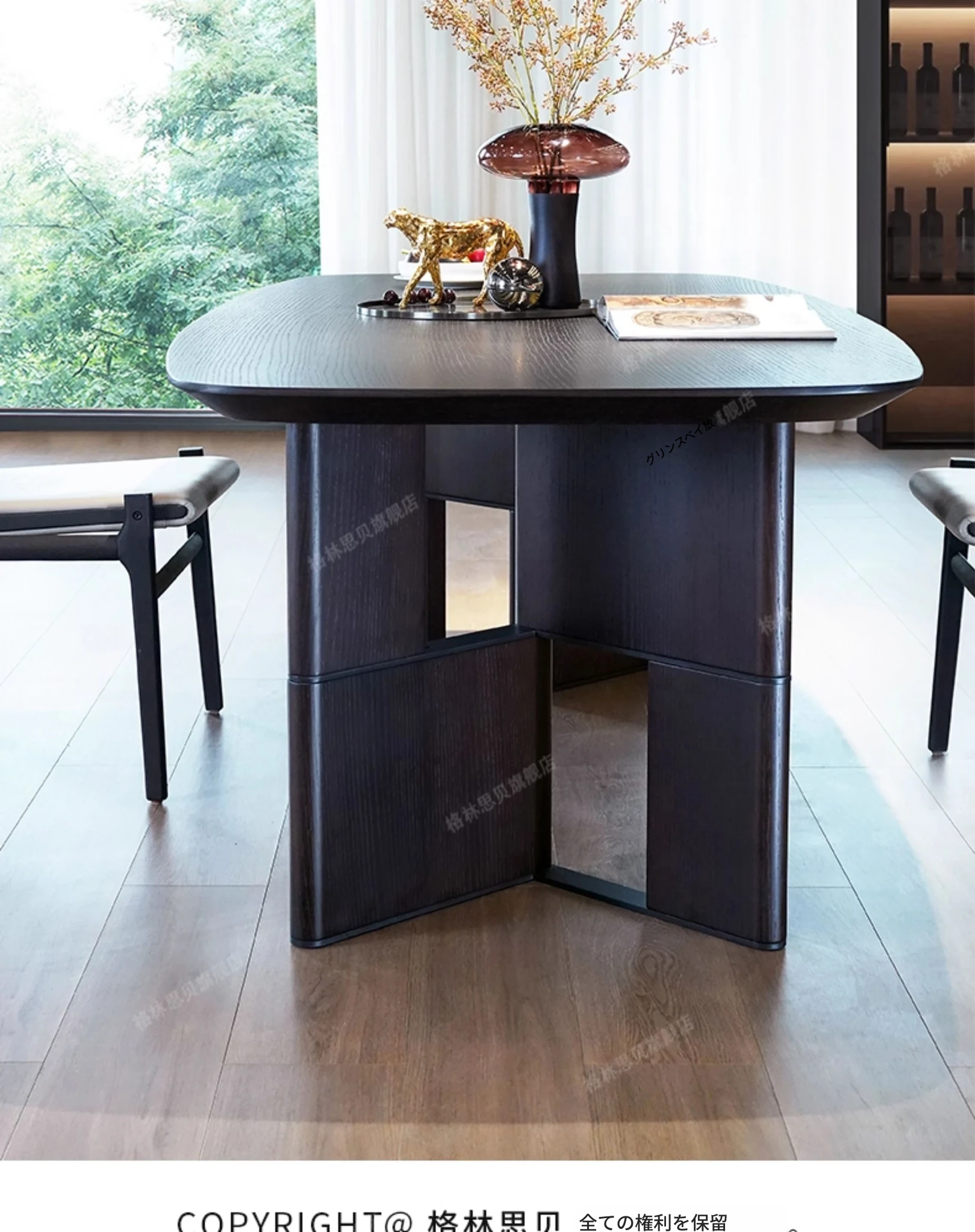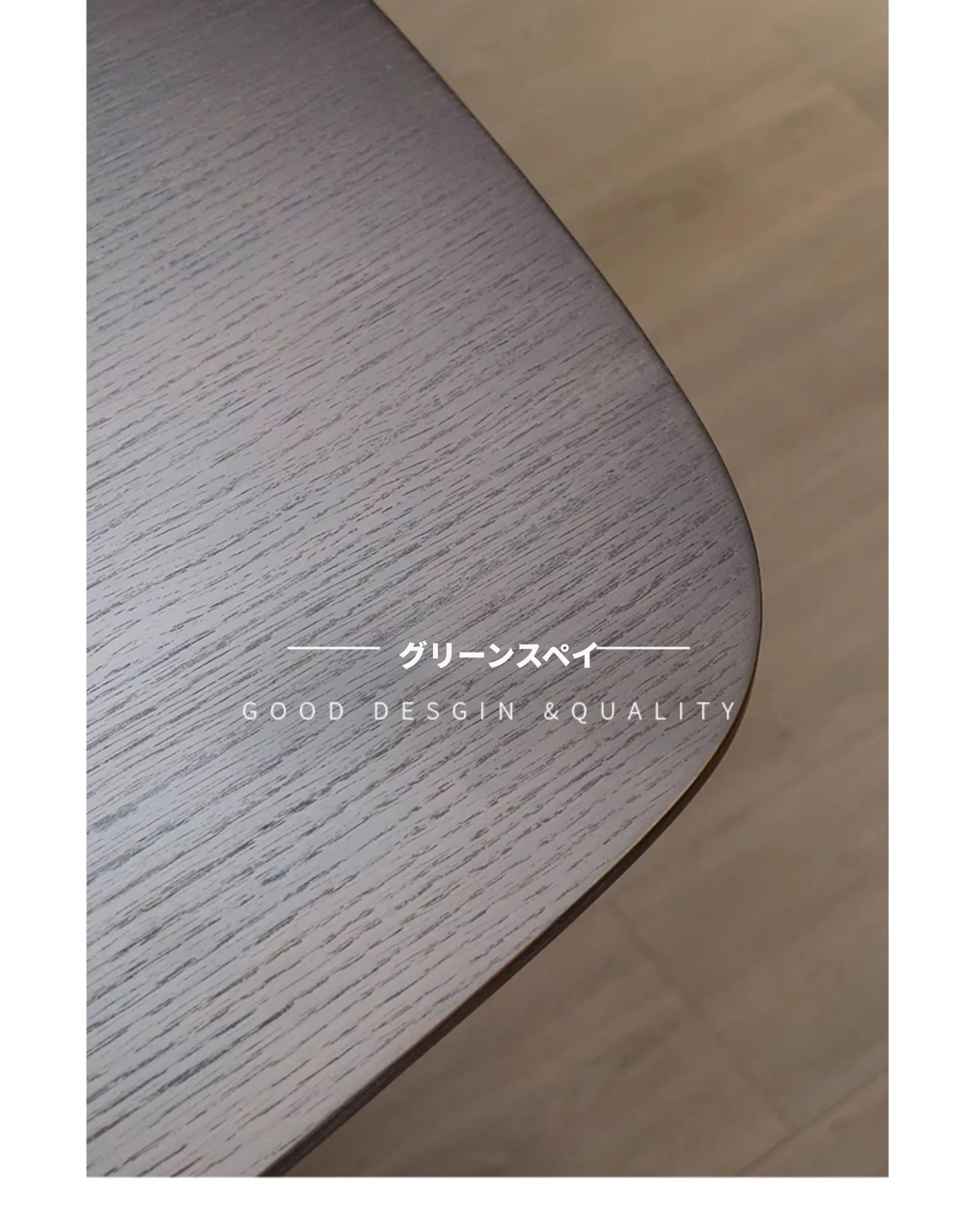シンプルでモダンなイタリアンライトラグジュアリーのスモーキーオークダイニングテーブル – 極細の丸みを帯びたユニークな長方形デザインで、洗練された空間を演出するレストラン家具。