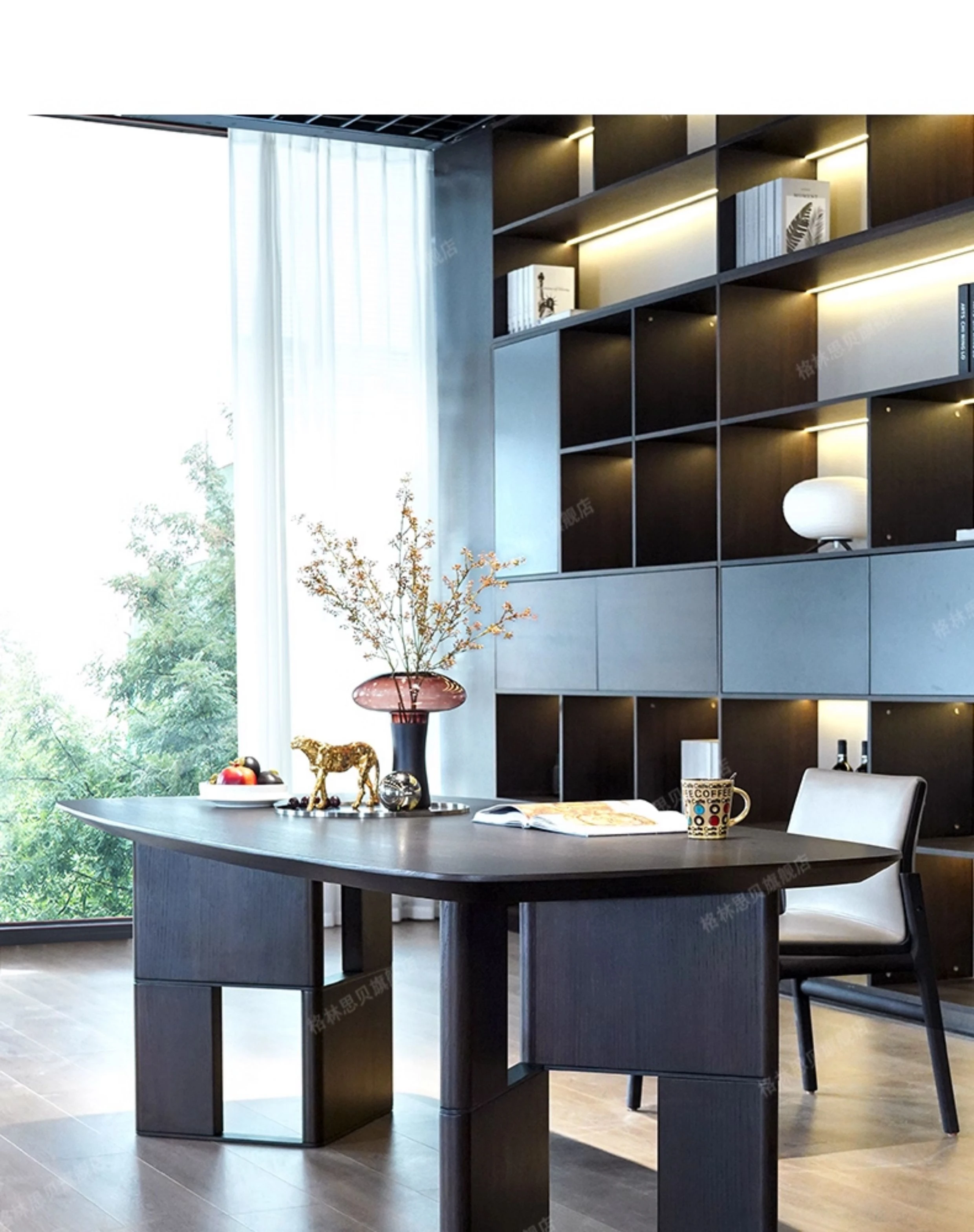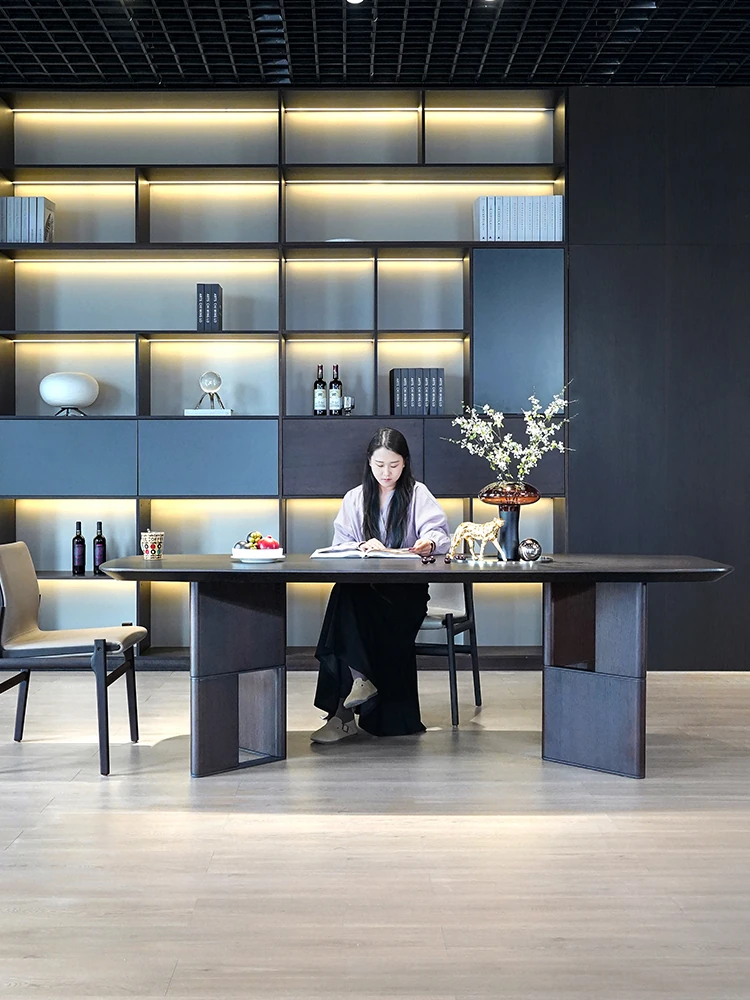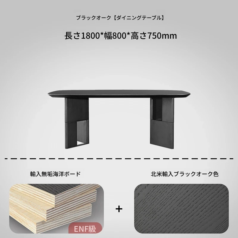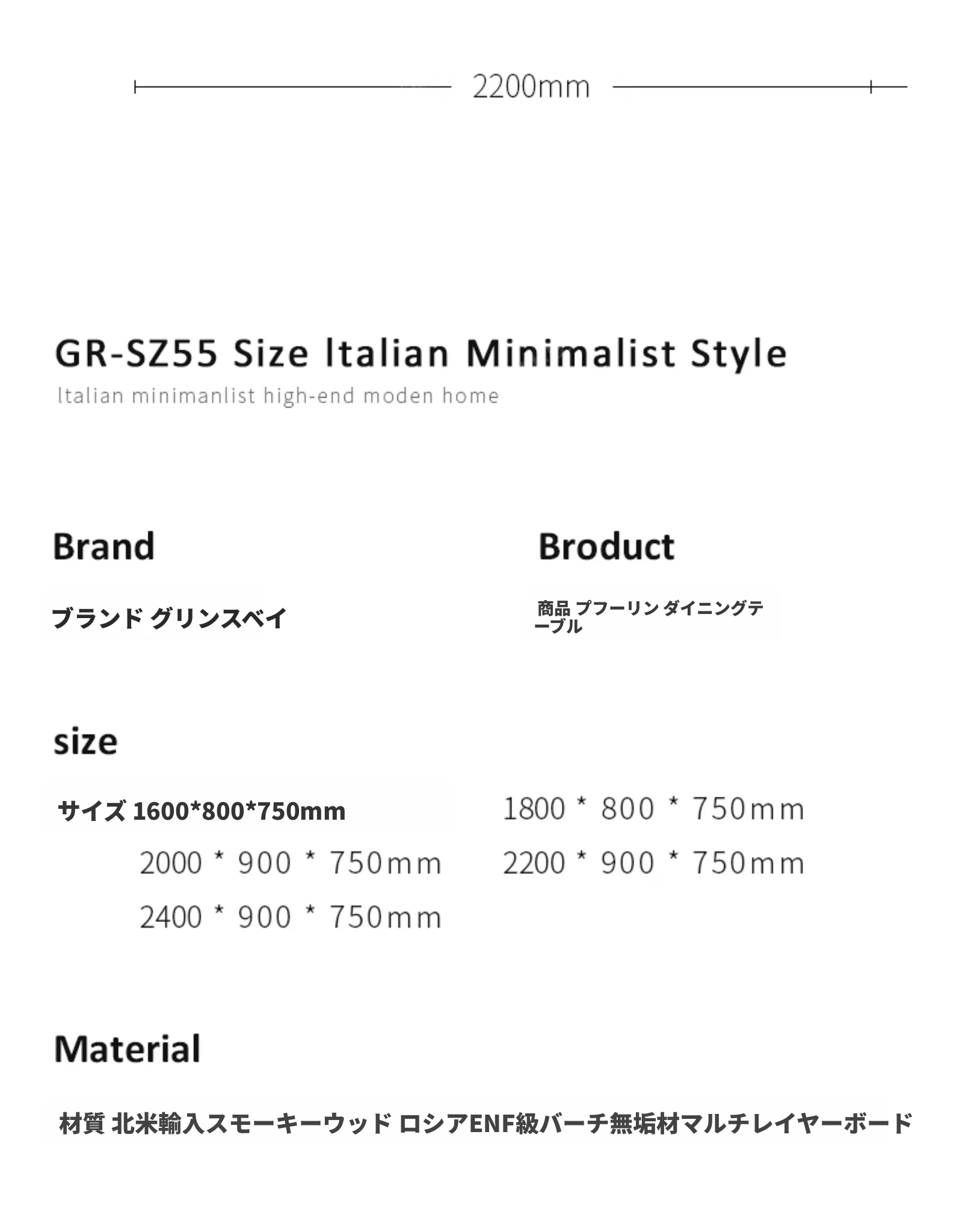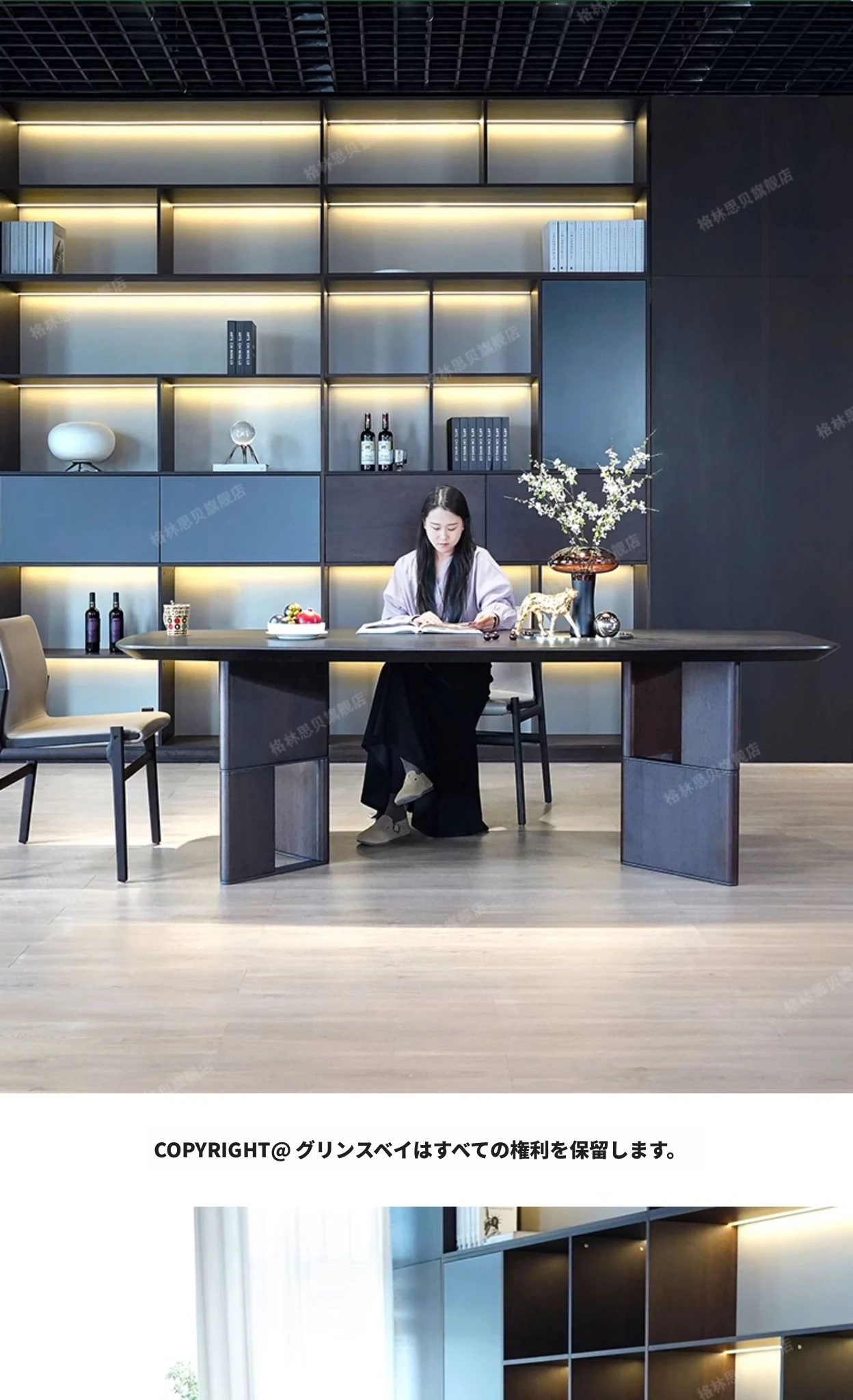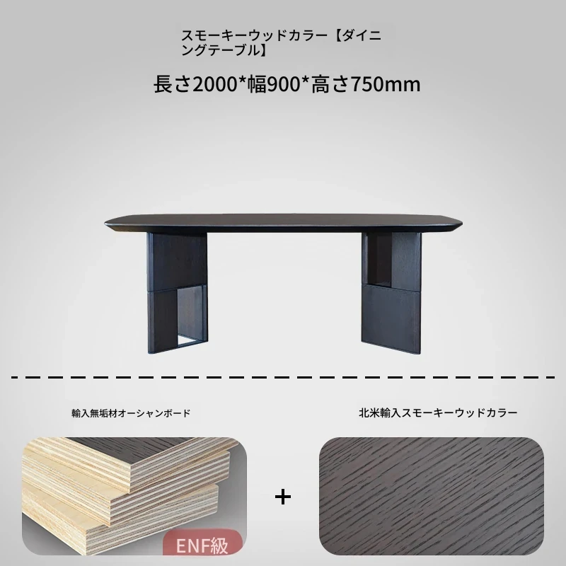 シンプルでモダンなイタリアンライトラグジュアリーのスモーキーオークダイニングテーブル – 極細の丸みを帯びたユニークな長方形デザインで、洗練された空間を演出するレストラン家具。