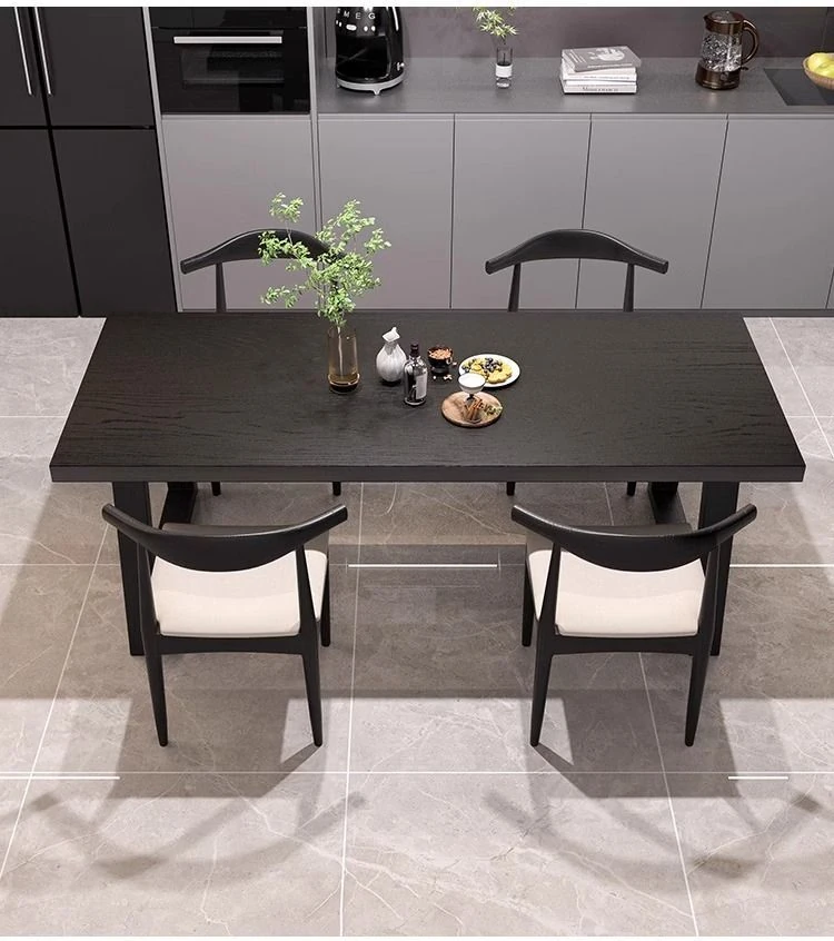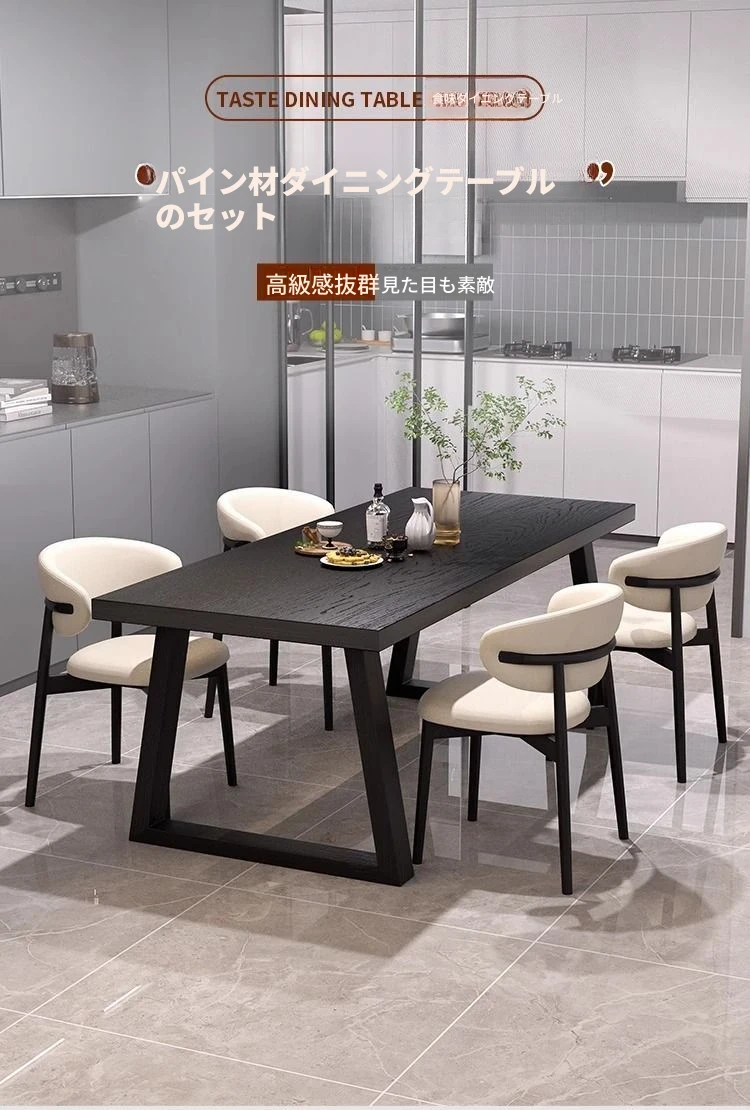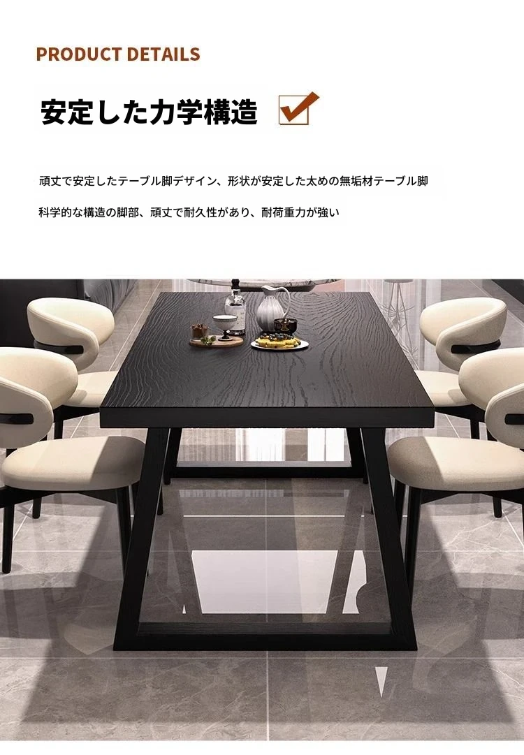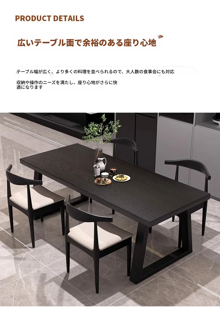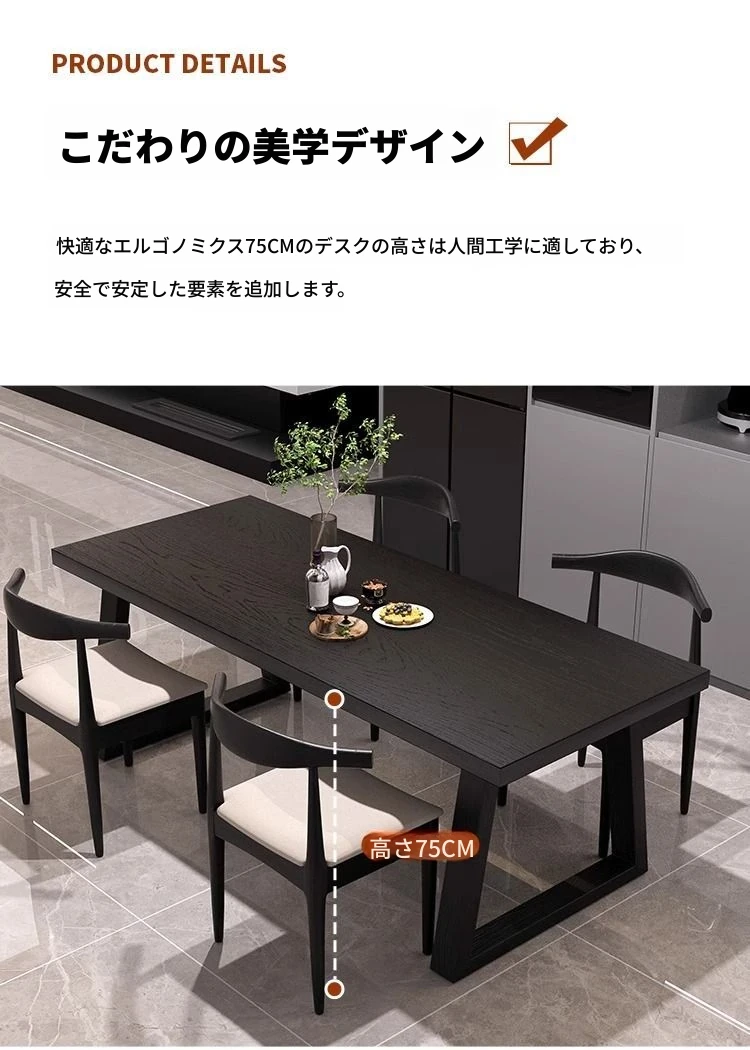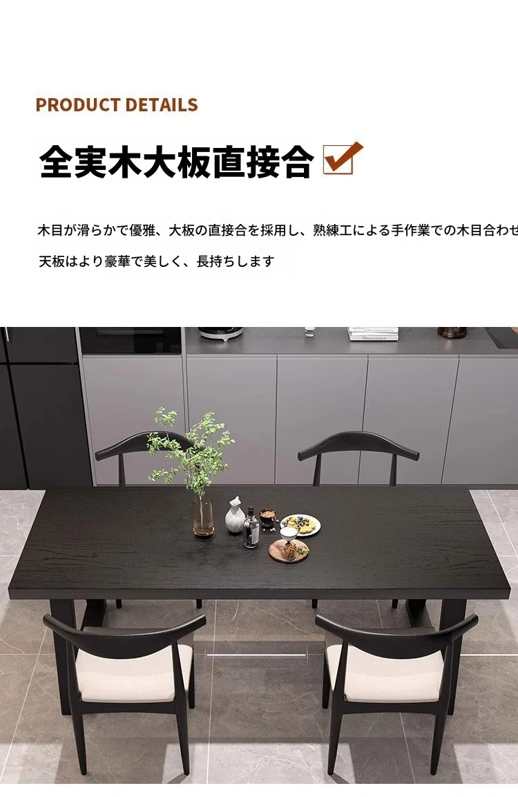シンプルでスタイリッシュな炭化ブラック無垢材ダイニングテーブル&デスクセット - 現代的な長方形デザインで、家庭やオフィスに最適!快適な食事と作業空間を演出します。