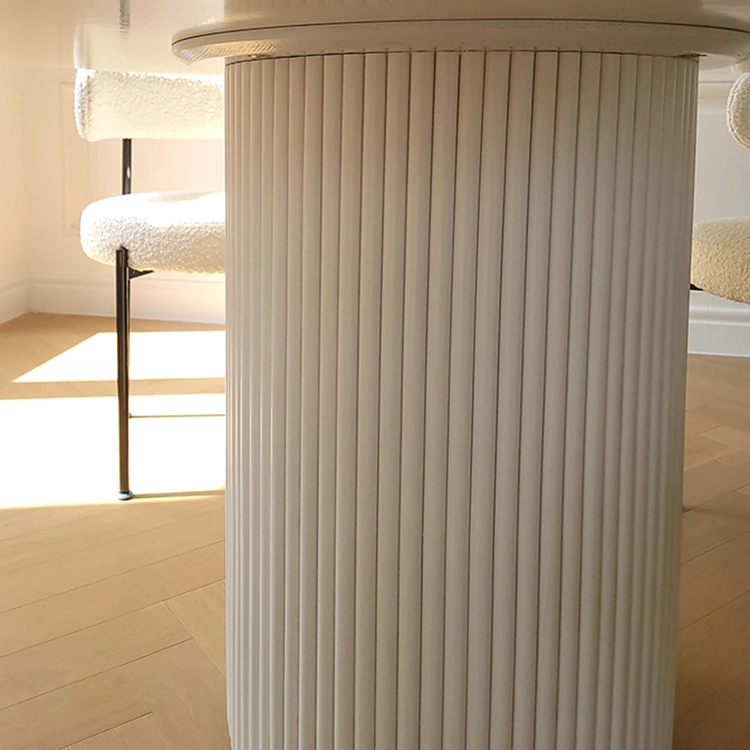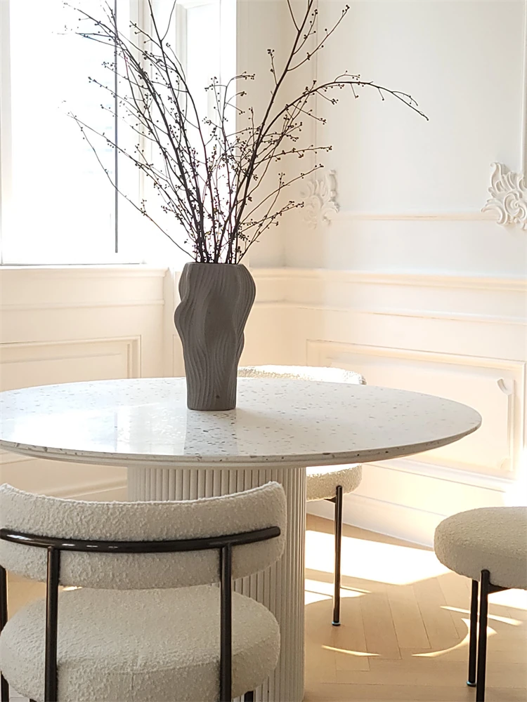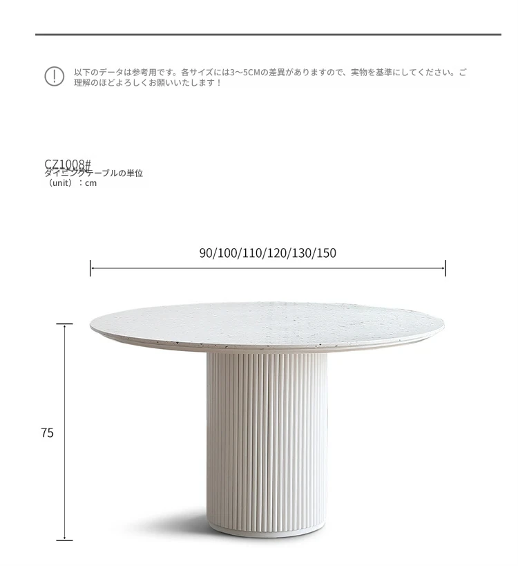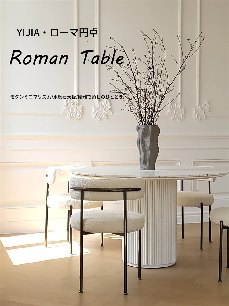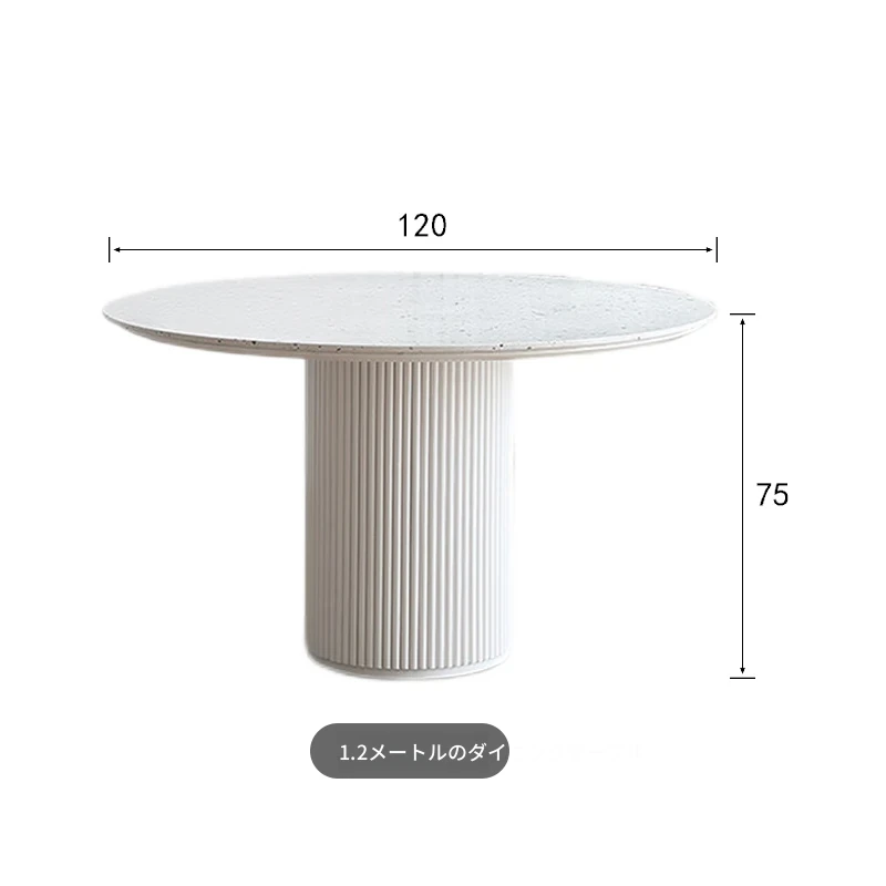 現代的水磨石ダイニングテーブル - シンプルでお洒落な小型住宅向け、実木のローマ柱デザイン、片脚タイプのクリーム風味の丸テーブル、食事が楽しくなる魅力的なアイテム!
