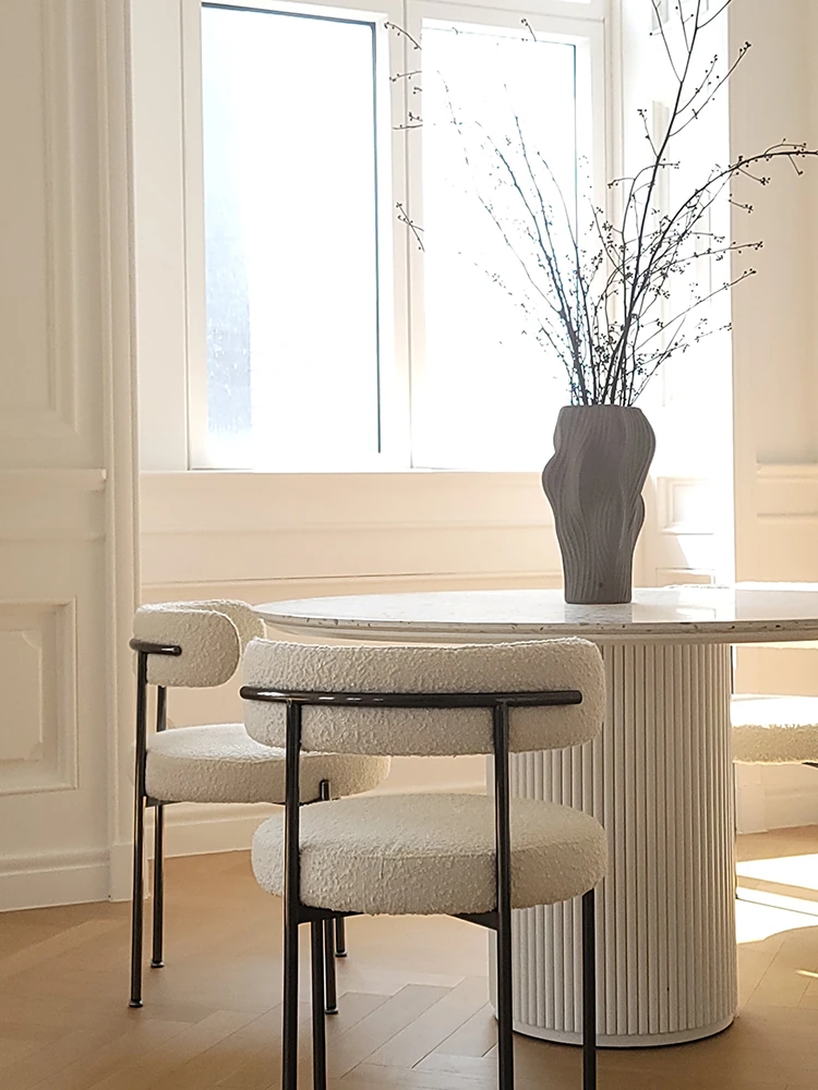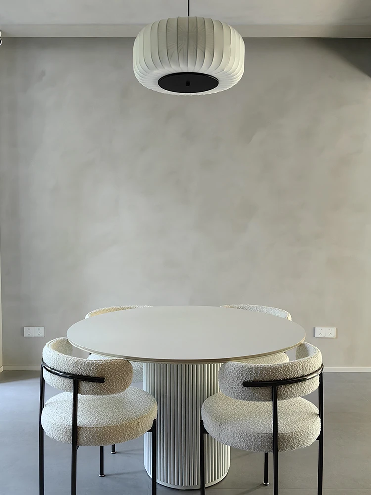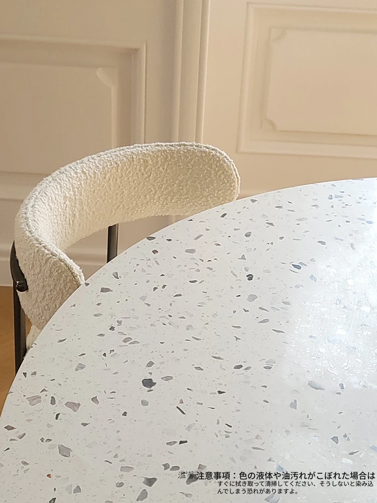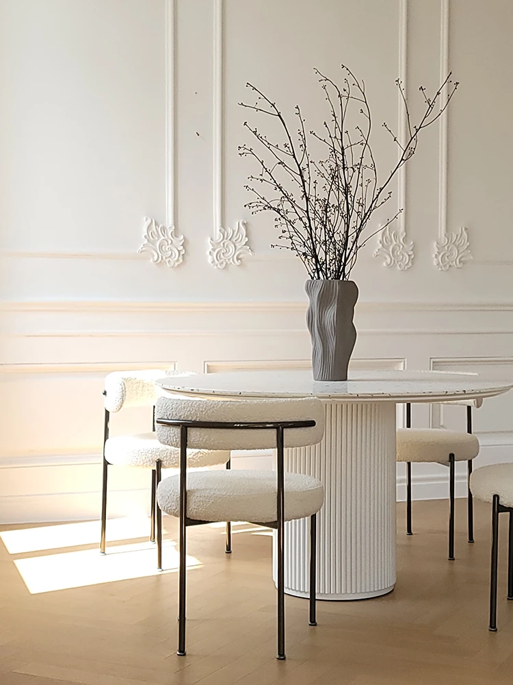 現代的水磨石ダイニングテーブル - シンプルでお洒落な小型住宅向け、実木のローマ柱デザイン、片脚タイプのクリーム風味の丸テーブル、食事が楽しくなる魅力的なアイテム!