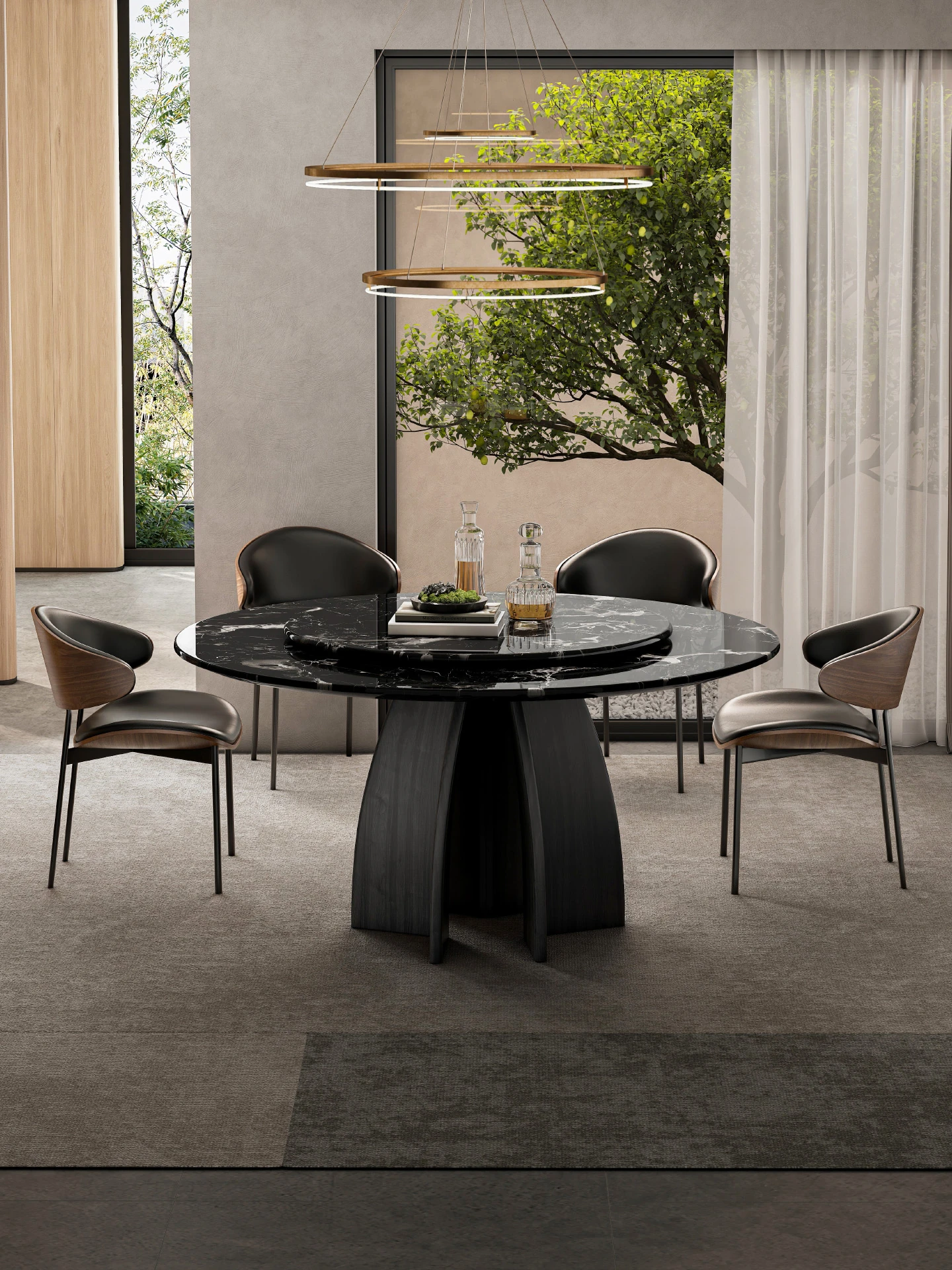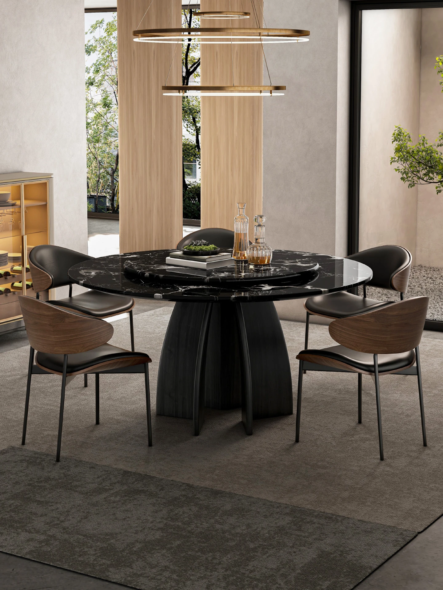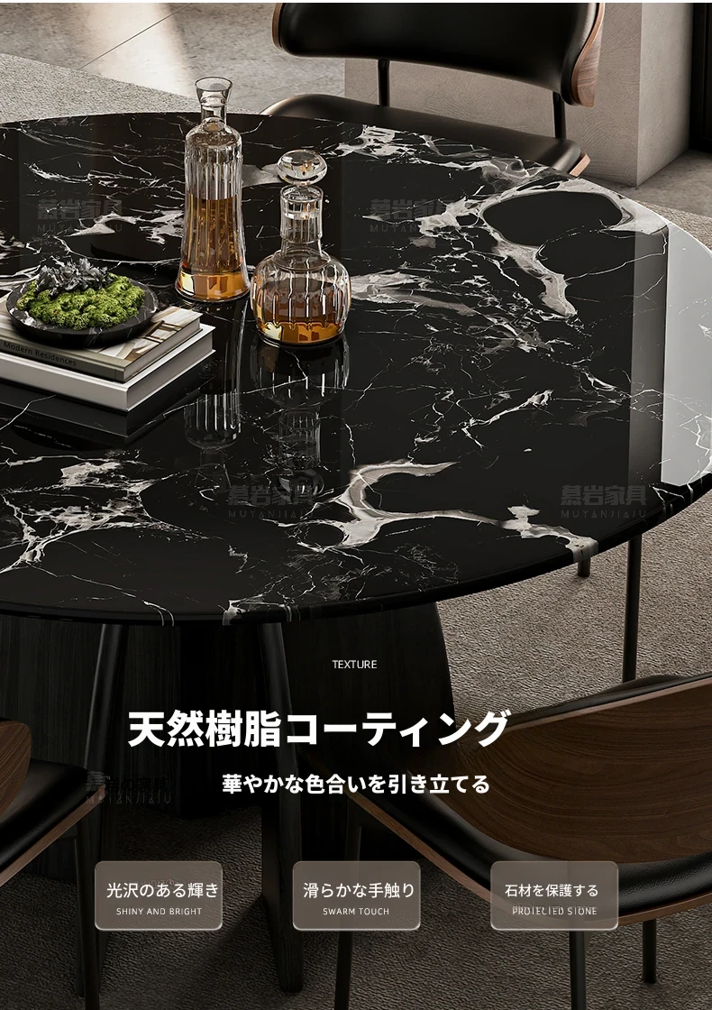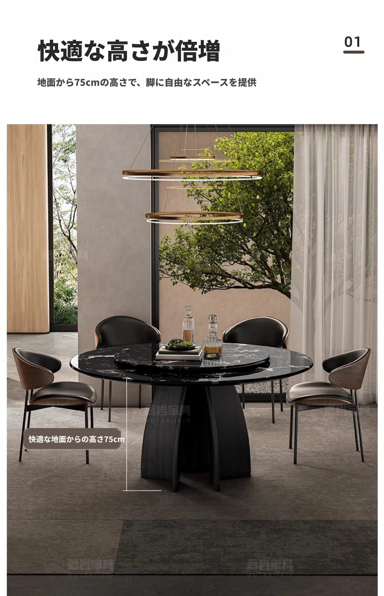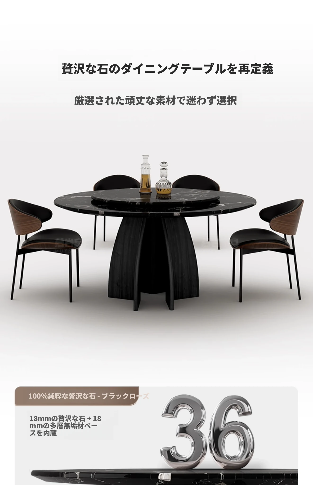 天然黒バラ豪華石丸テーブル|イタリアンミニマルデザインのブラック無垢材と大理石の円形ダイニングテーブル&チェアセットで、洗練された空間を演出!