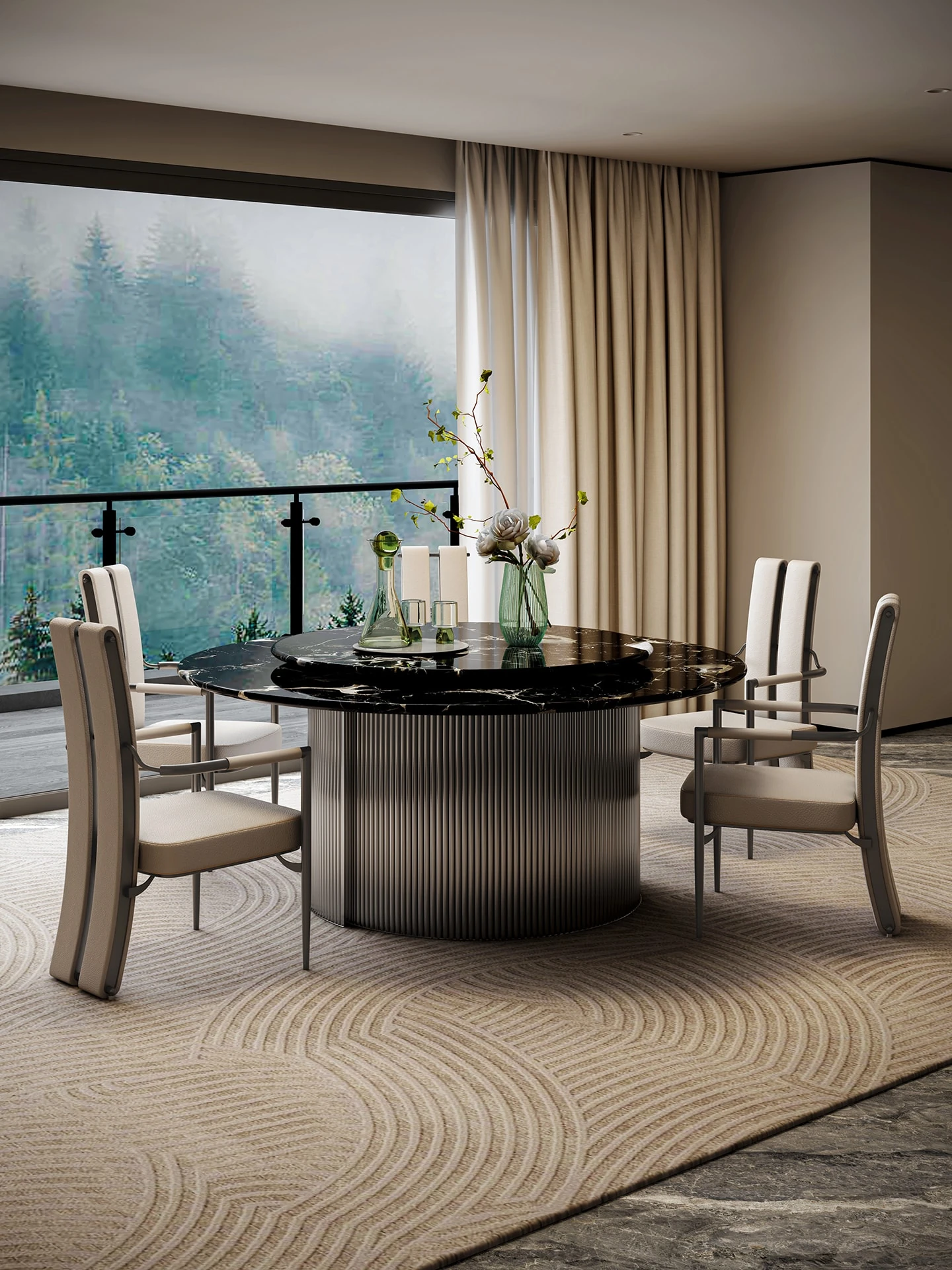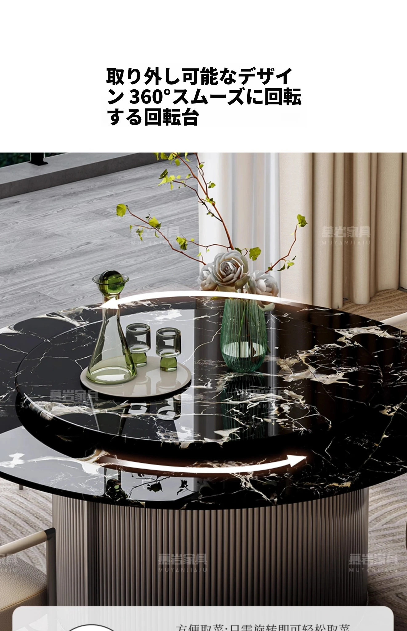 【S級】ブラックローズ・天然の贅沢石製円形ダイニングテーブル【回転盤付き】+マスター椅子*6