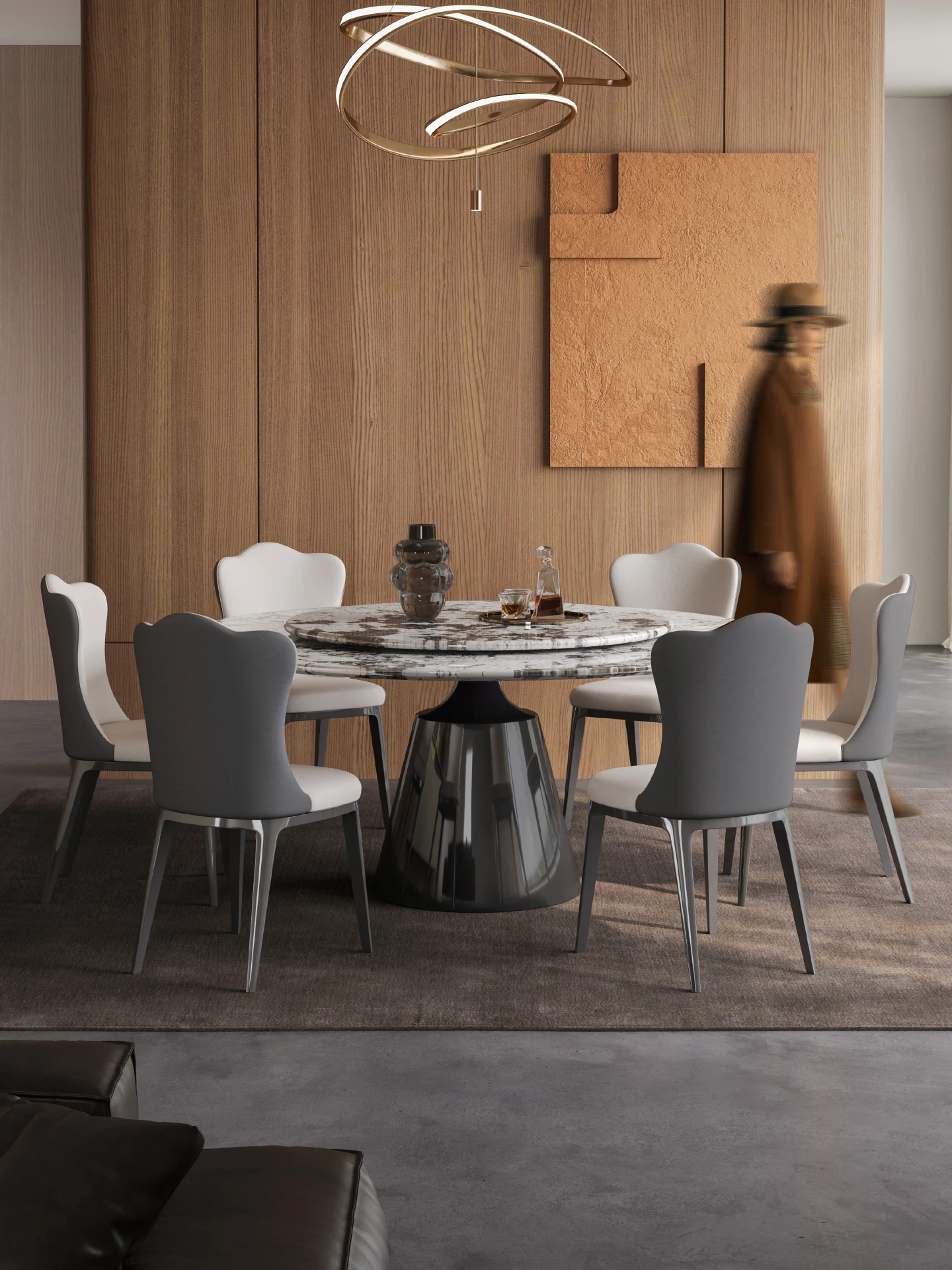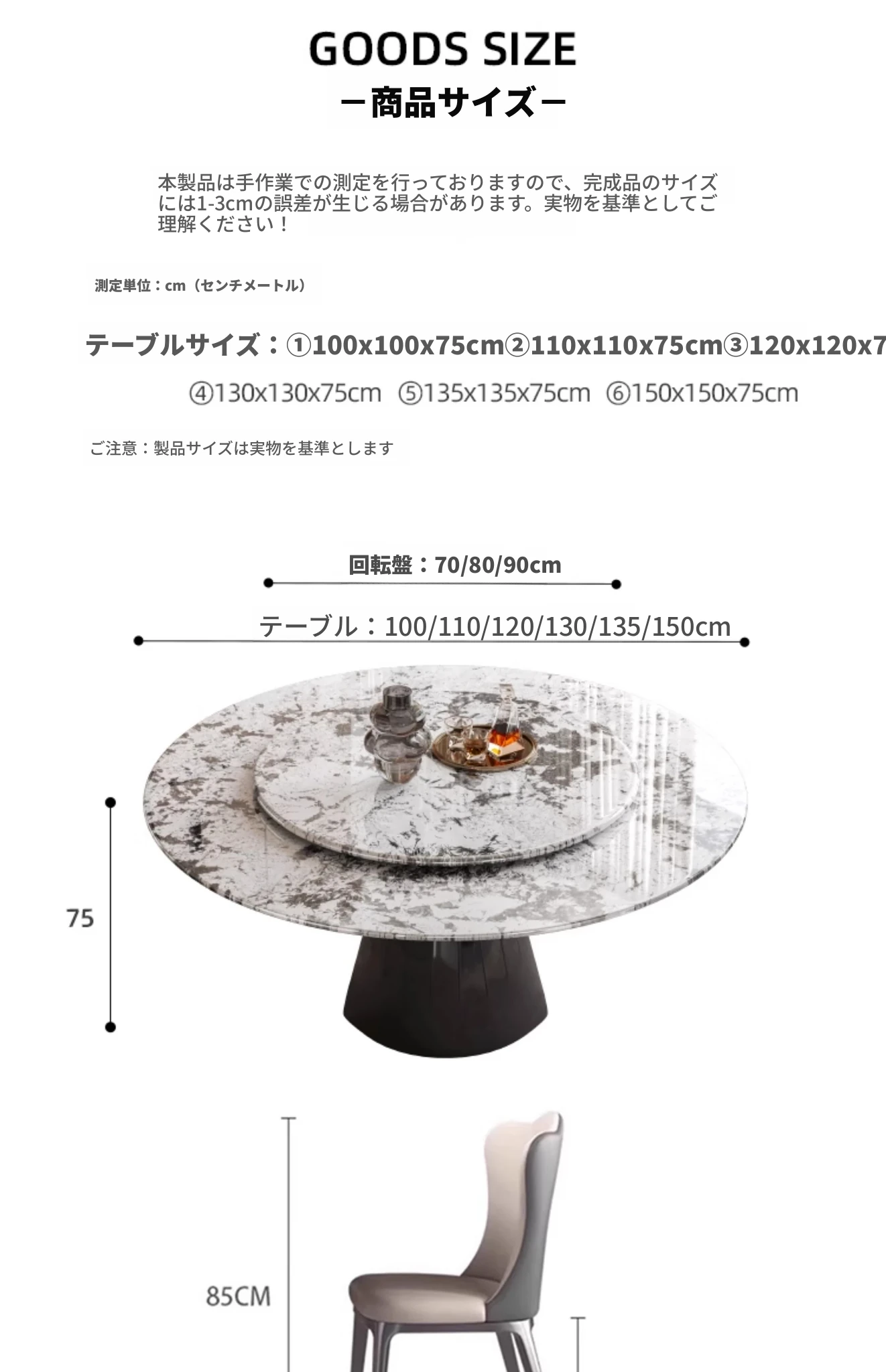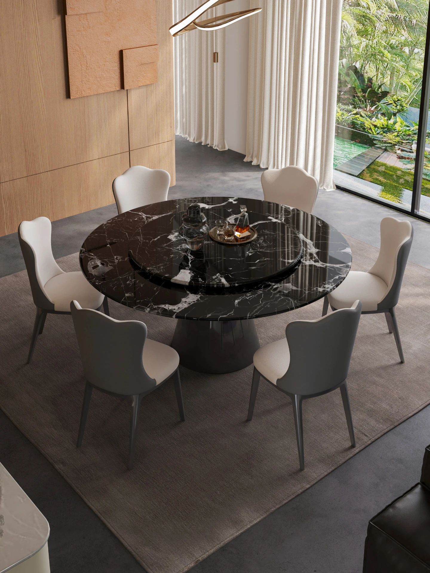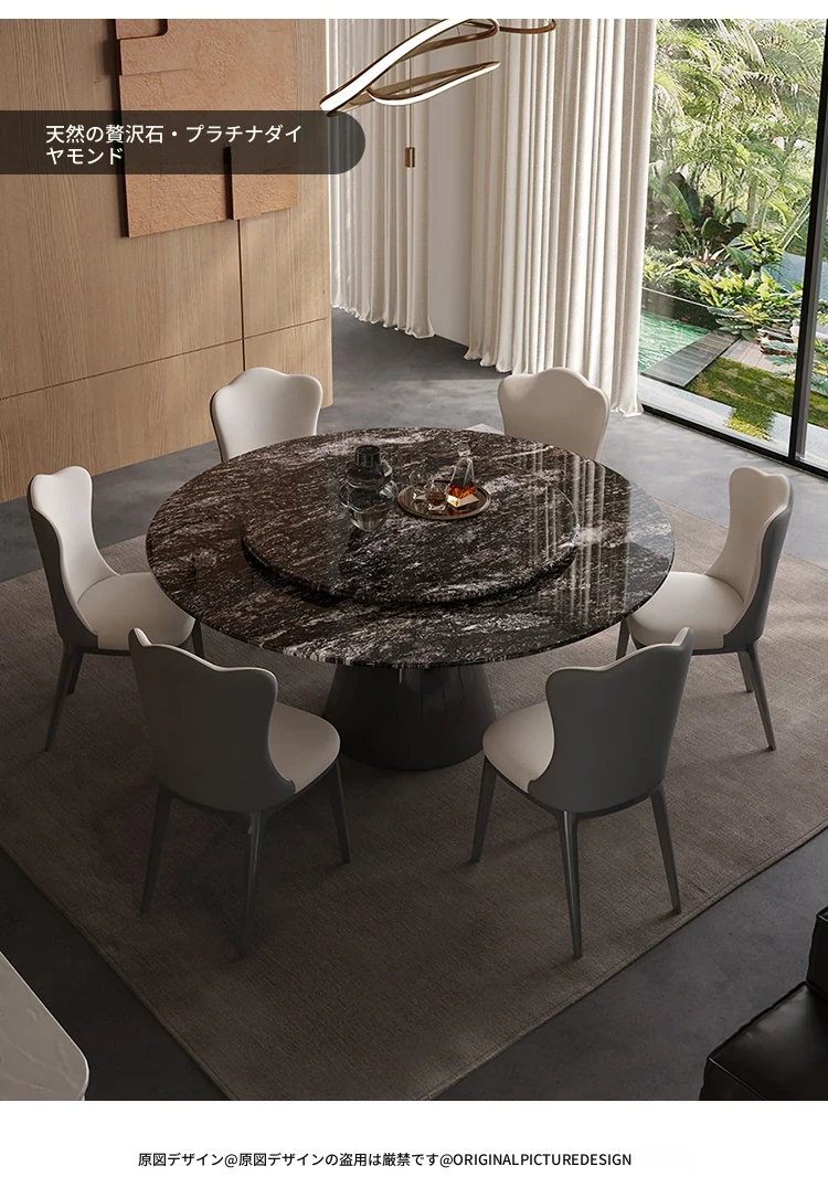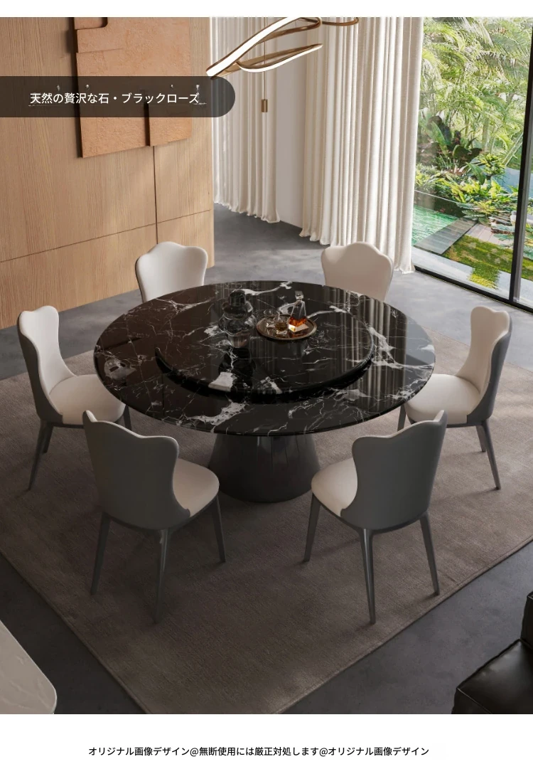 【S級】黒バラ·天然ラグジュアリー石円形ダイニングテーブル【回転盤付き】+雲朵本革ダイニングチェア*6