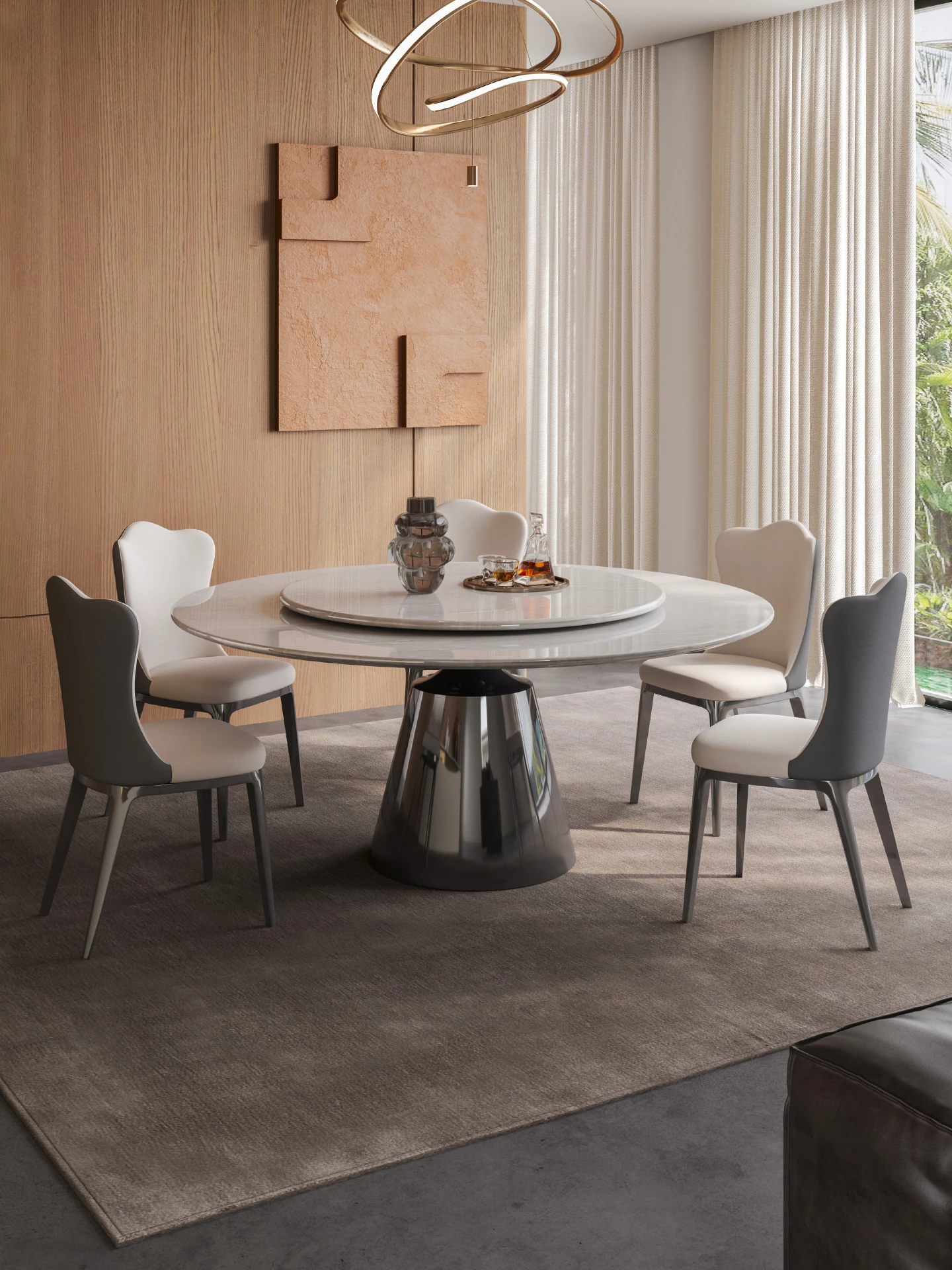【S級】雪山飛狐·天然ラグジュアリー石円形ダイニングテーブル+雲朵本革ダイニングチェア*4