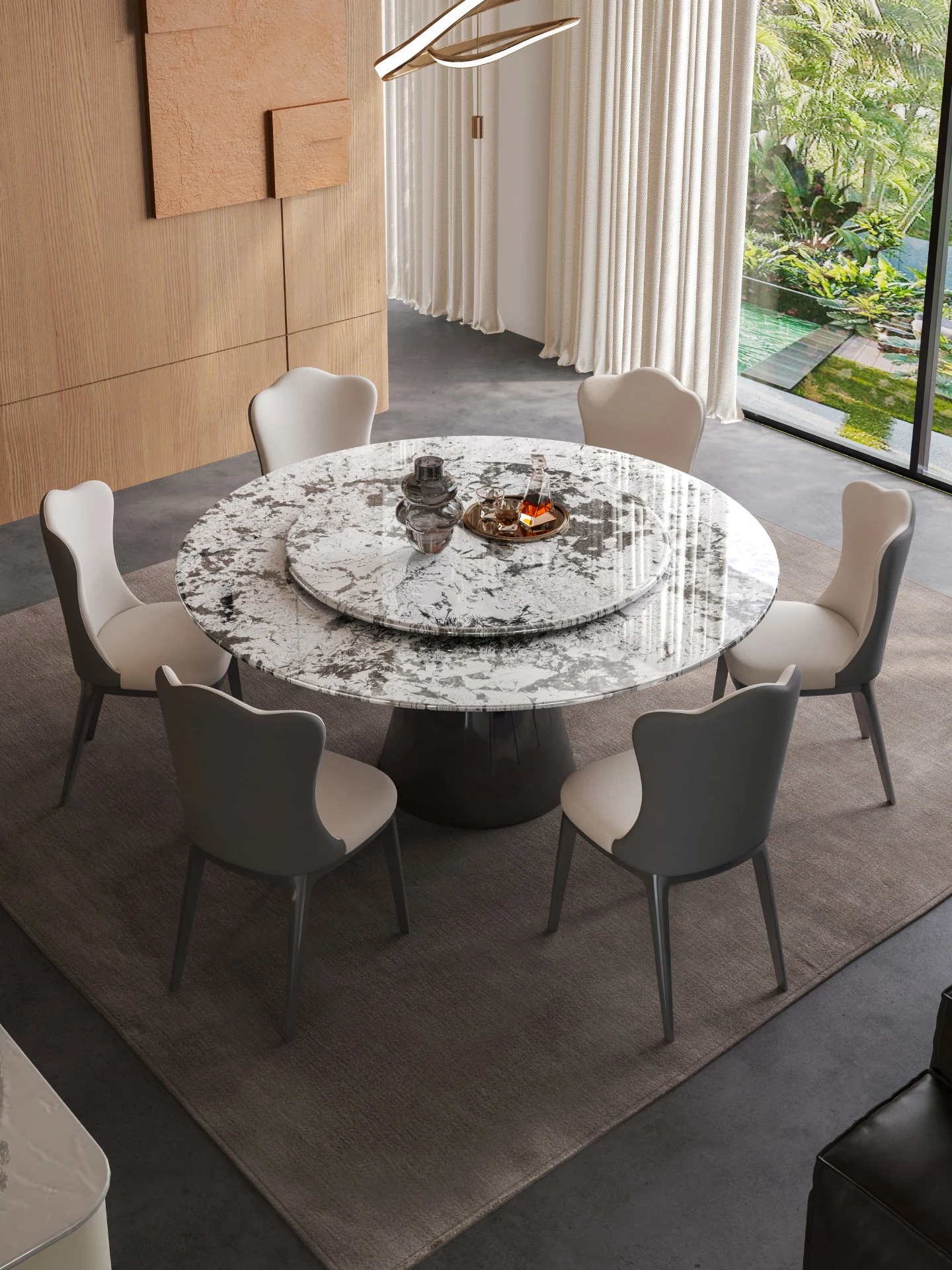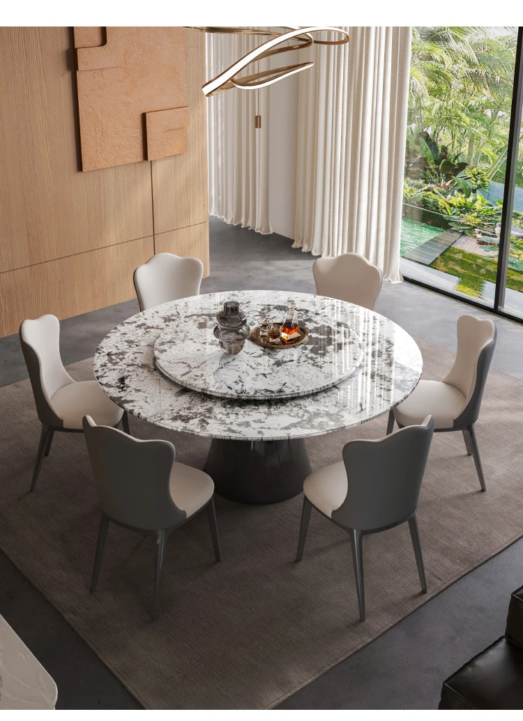 天然雪山飛狐大理石ラウンドダイニングテーブル - イタリアンライトラグジュアリー、高級感あふれる回転式ビッグテーブル。家族団らんに最適、洗練されたデザインでおしゃれな食卓を演出。