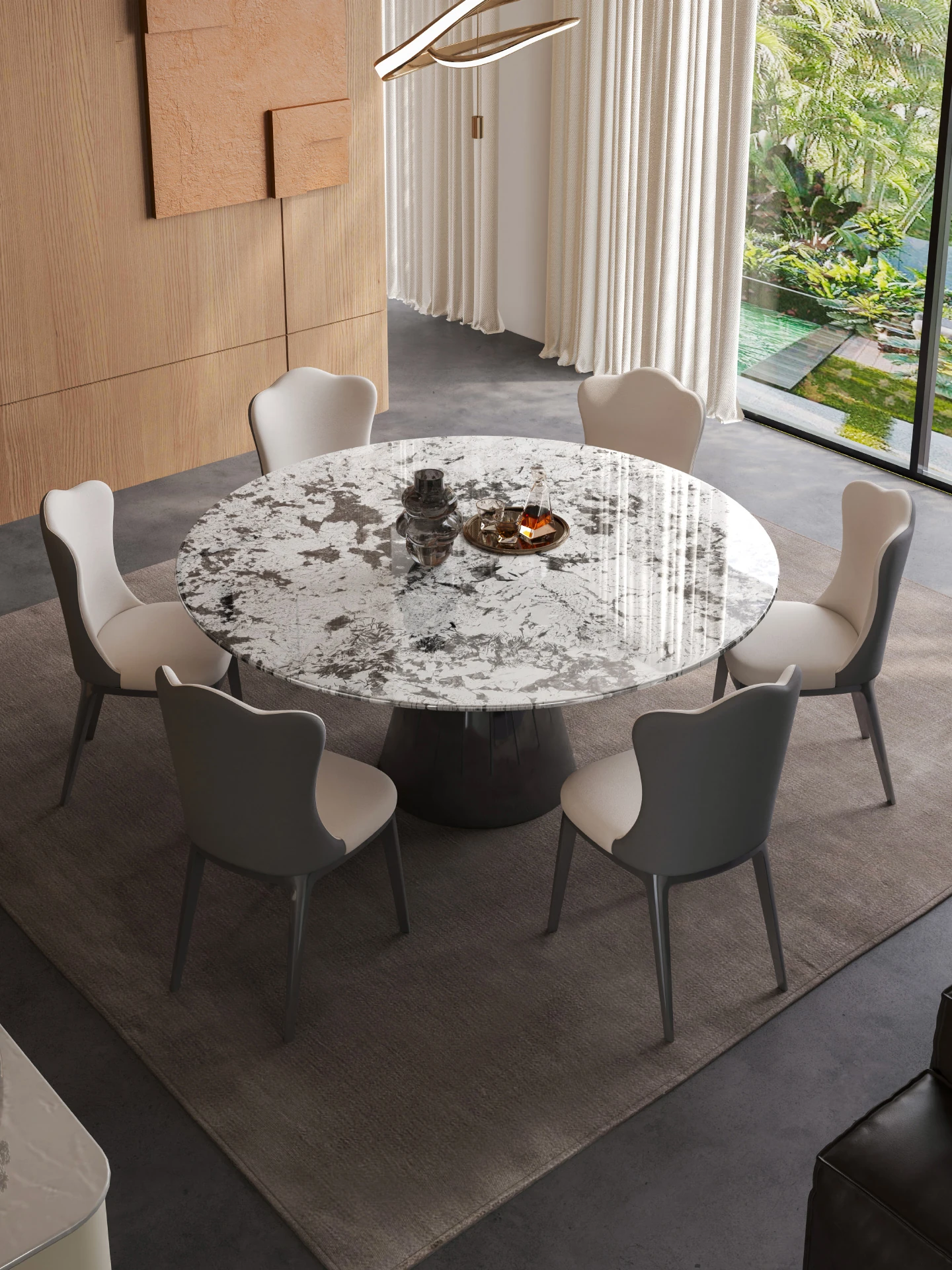 【S級】雪山飛狐·天然ラグジュアリー石円形ダイニングテーブル+雲朵本革ダイニングチェア*6
