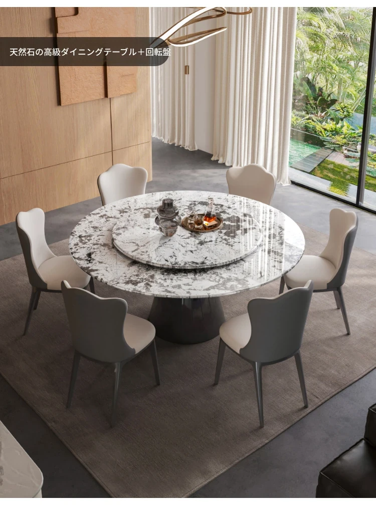 【S級】雪山飛狐·天然ラグジュアリー石円形ダイニングテーブル【回転盤付き】+雲朵本革ダイニングチェア*6