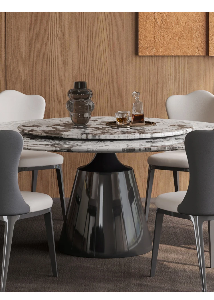 【S級】黒バラ·天然ラグジュアリー石円形ダイニングテーブル+雲朵本革ダイニングチェア*6