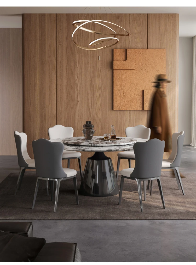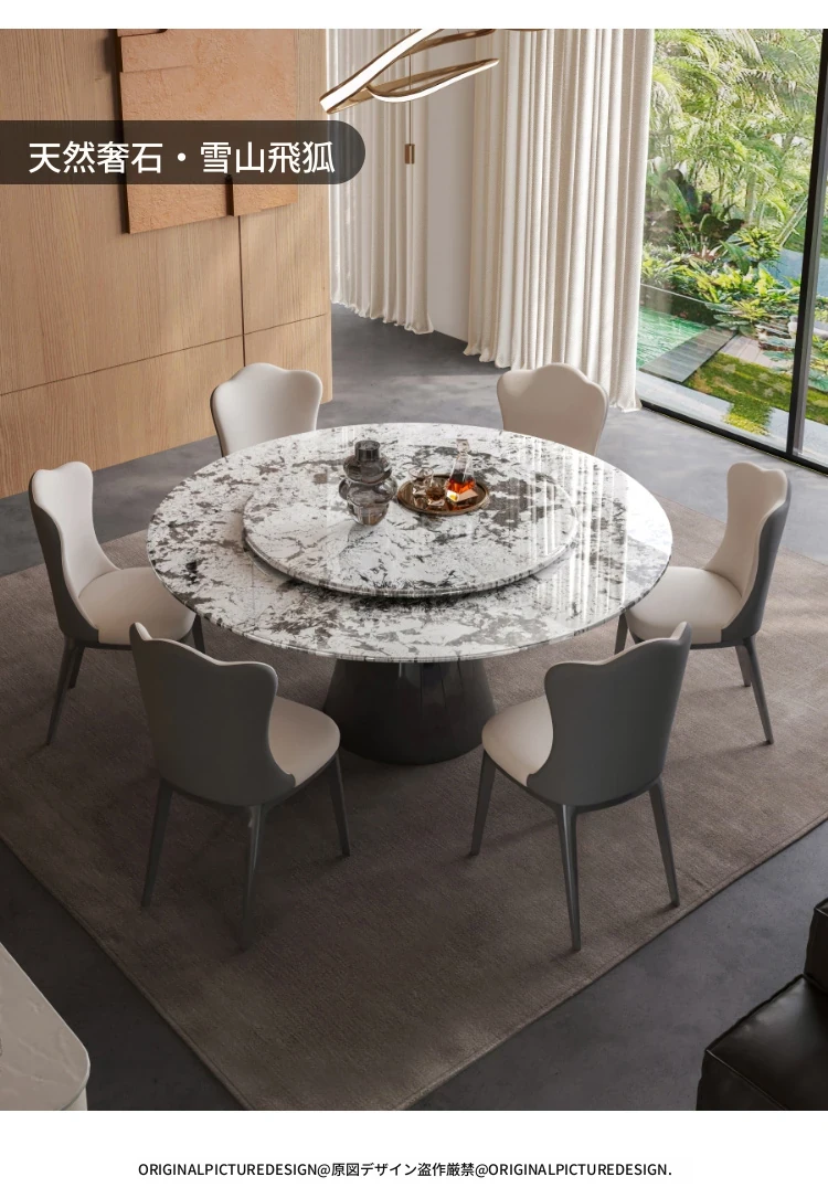 【S級】雪山飛狐·天然ラグジュアリー石円形ダイニングテーブル+雲朵本革ダイニングチェア*8