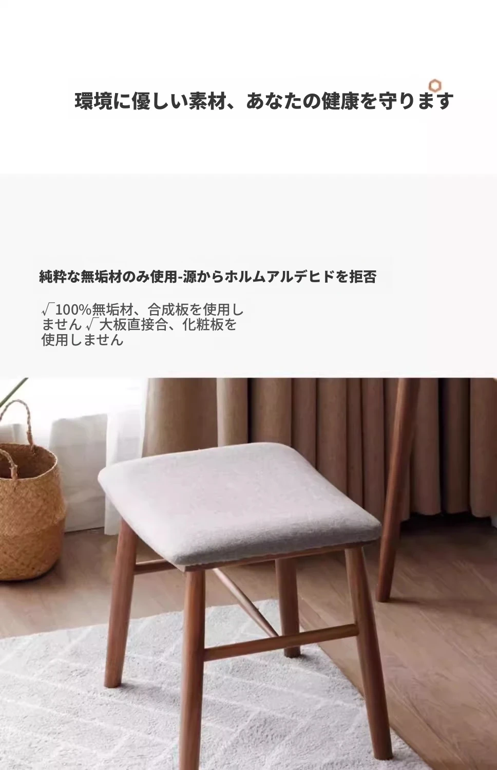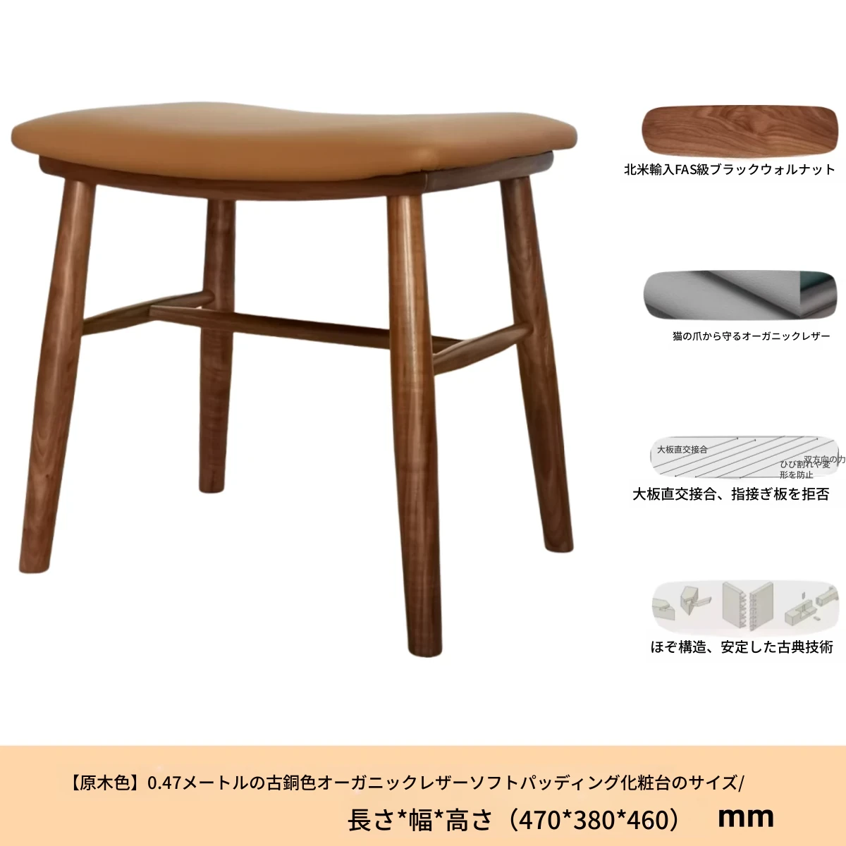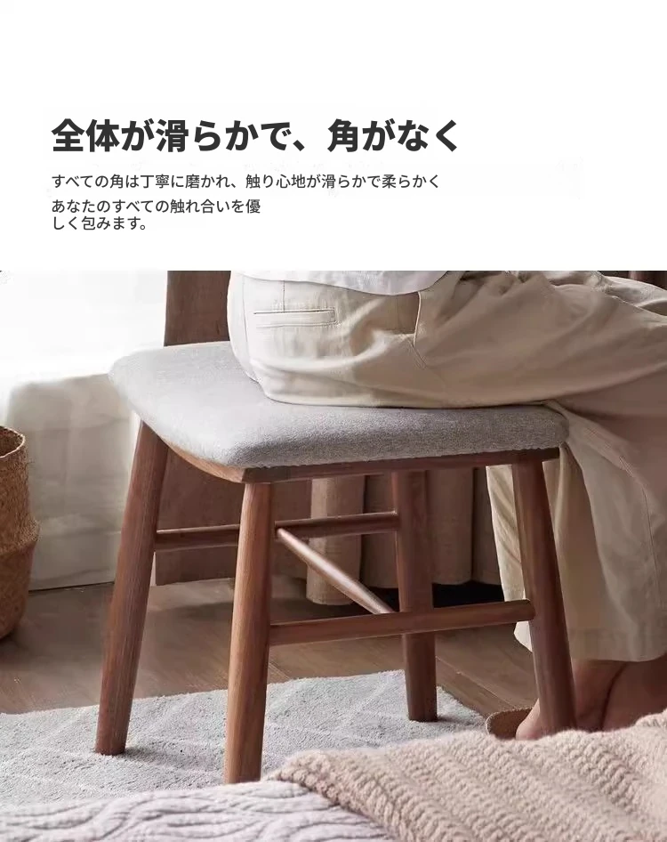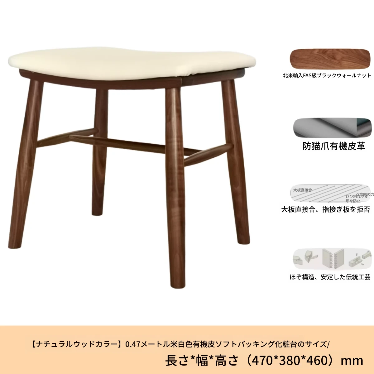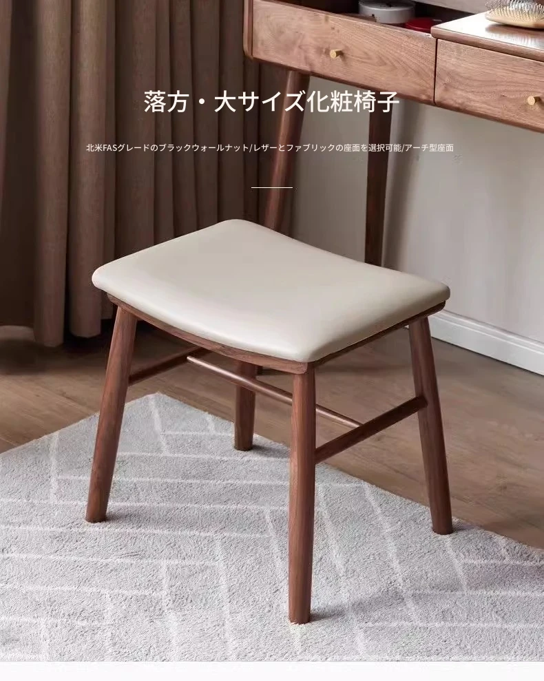 北欧風の無垢材化粧台スツール - ブラックウォールナットの高級感溢れるデザイン!シンプルでスタイリッシュな日本式の大きなクッション付きスツール。寝室にぴったりのアイテムで、毎日のメイクアップをもっと楽しく!