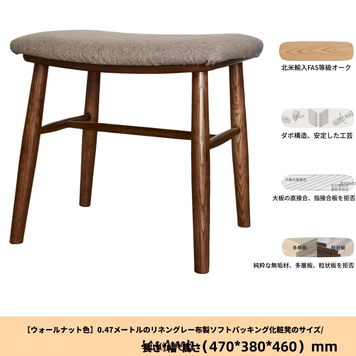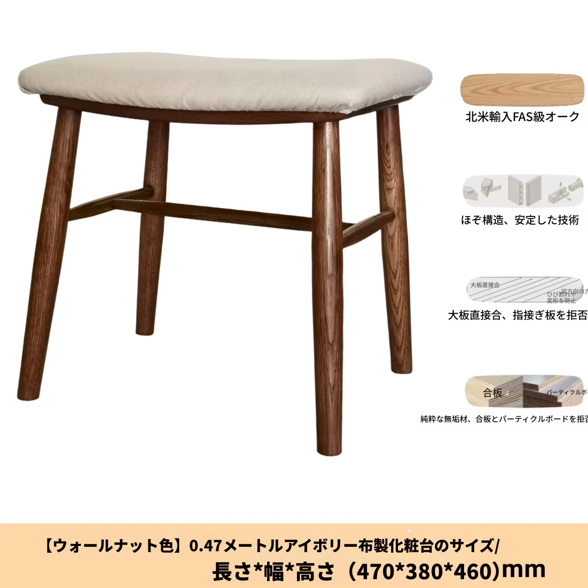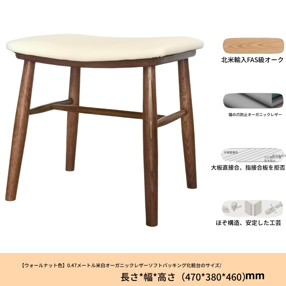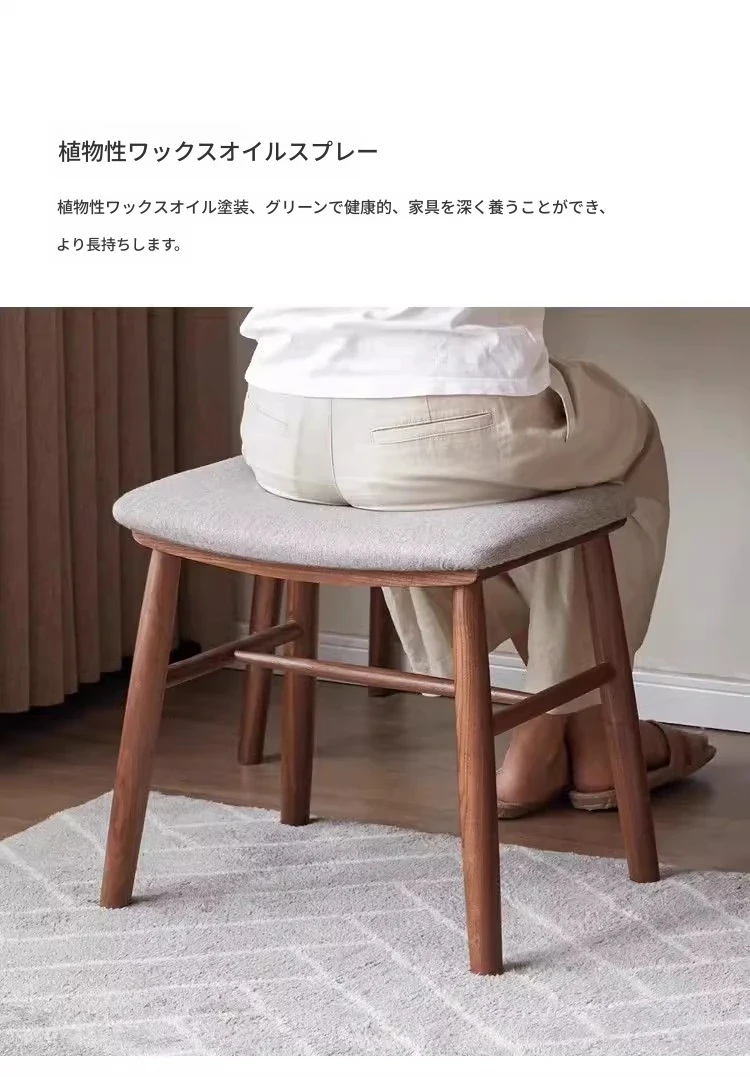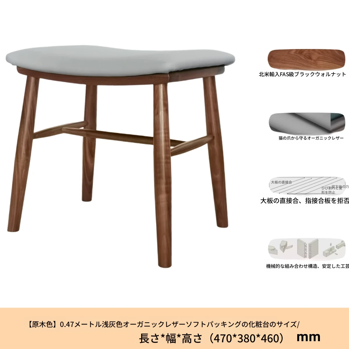 北欧風の無垢材化粧台スツール - ブラックウォールナットの高級感溢れるデザイン!シンプルでスタイリッシュな日本式の大きなクッション付きスツール。寝室にぴったりのアイテムで、毎日のメイクアップをもっと楽しく!