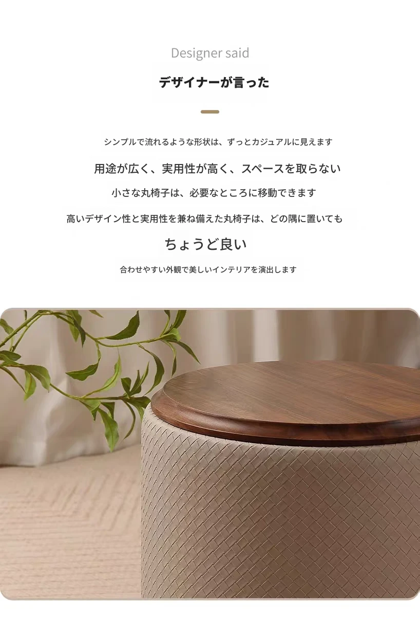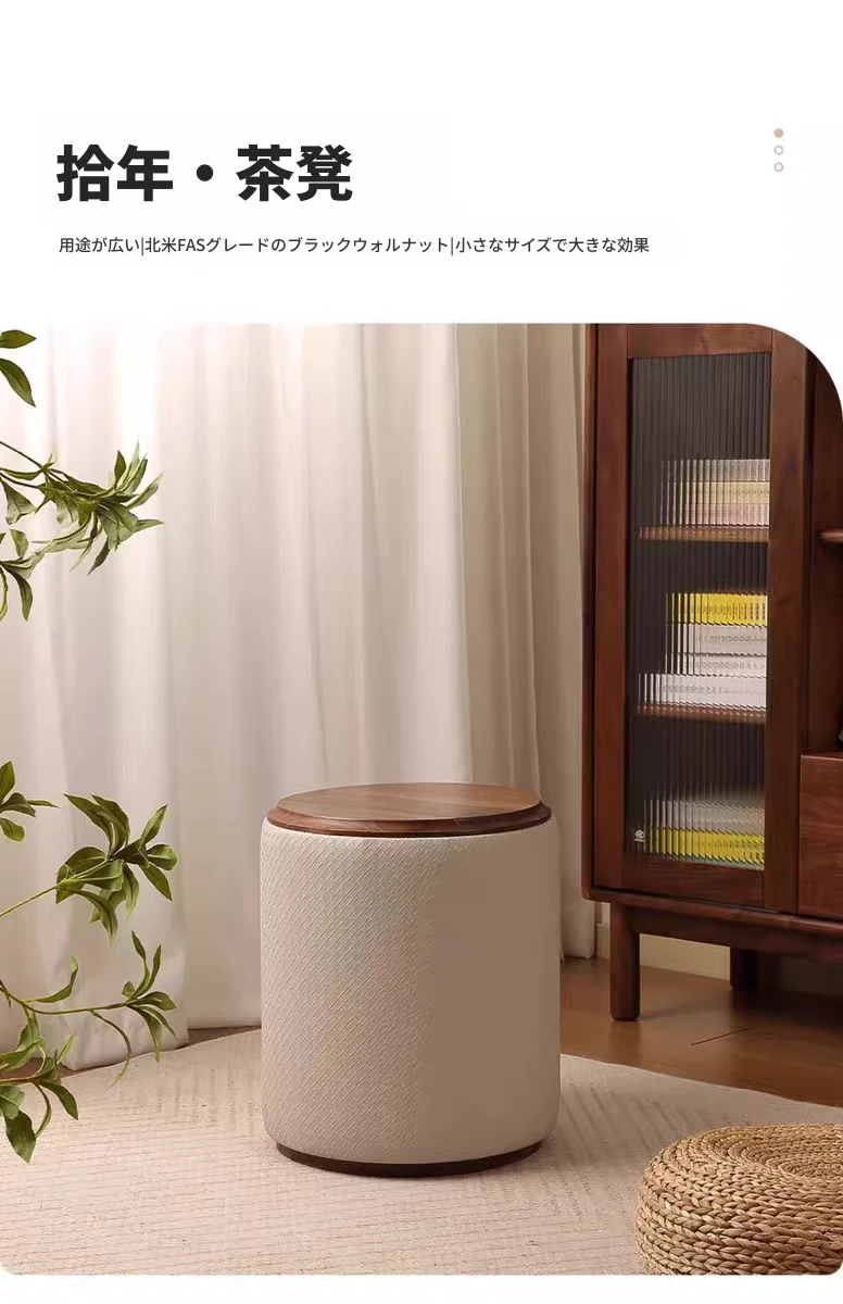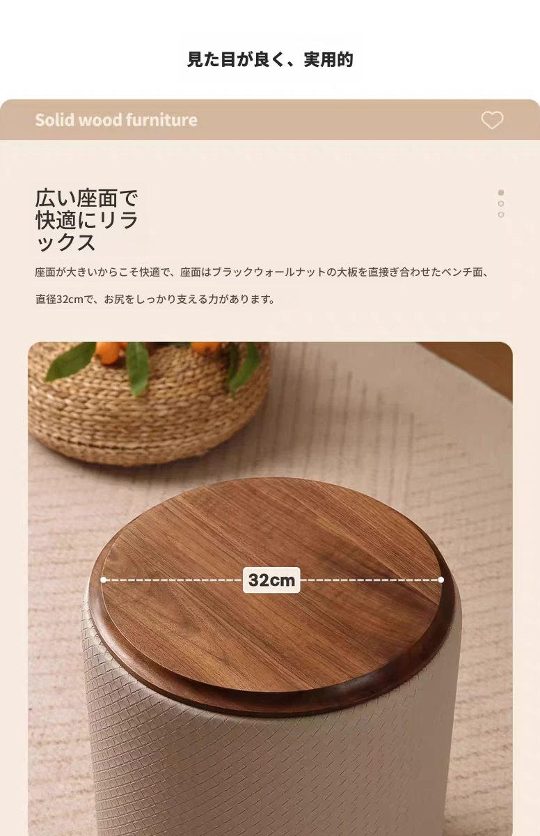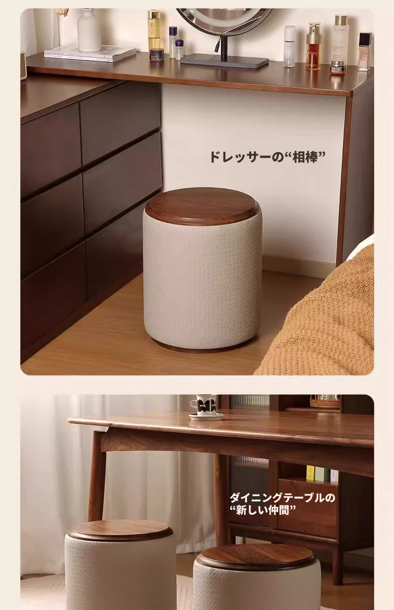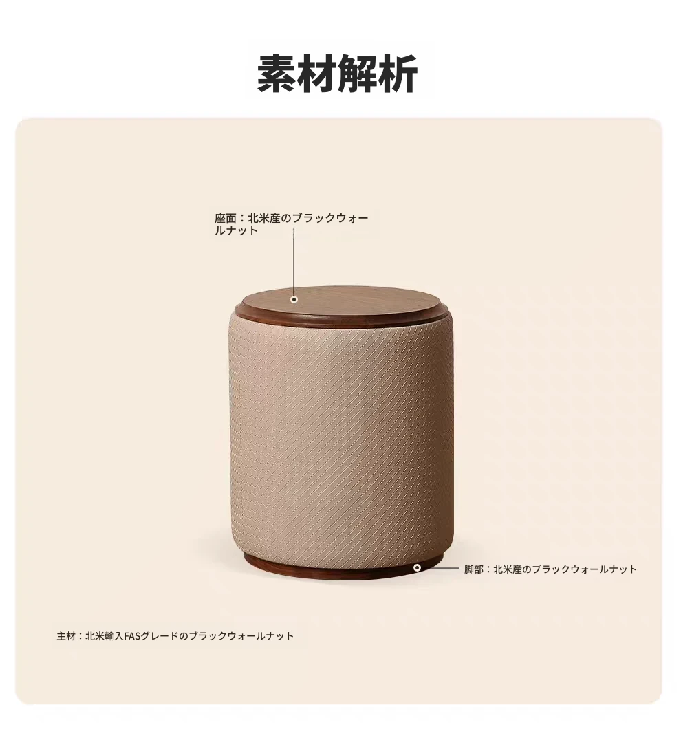 北米産ブラックウォールナットのラウンドスツール|贅沢なレザー仕上げで、寝室や化粧台に最適なソフトパッキングの低いスツール!快適さとスタイルを兼ね備えた一品です。