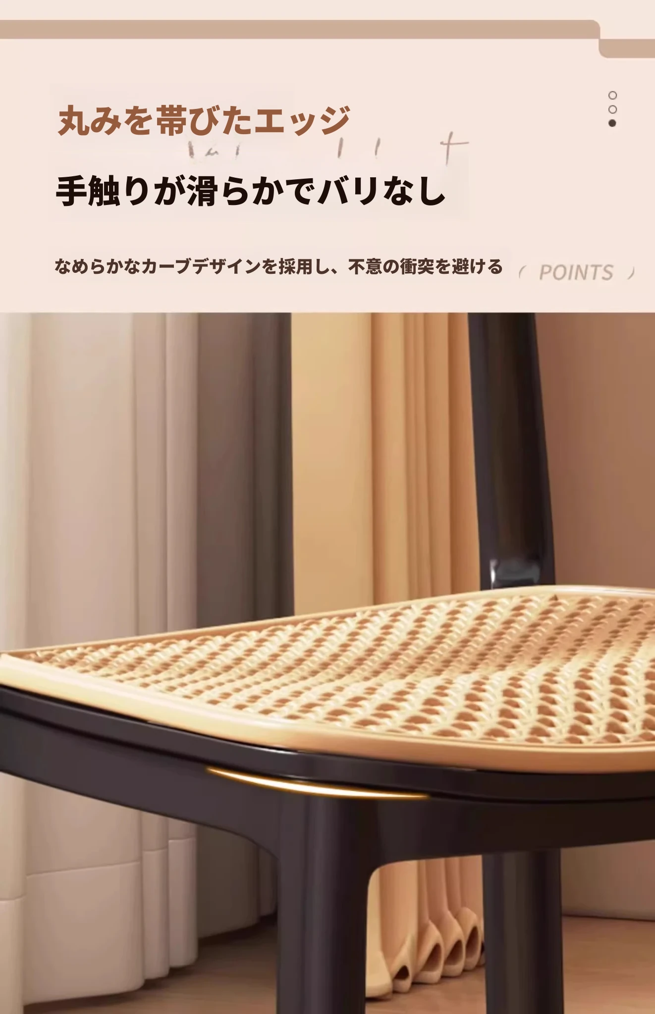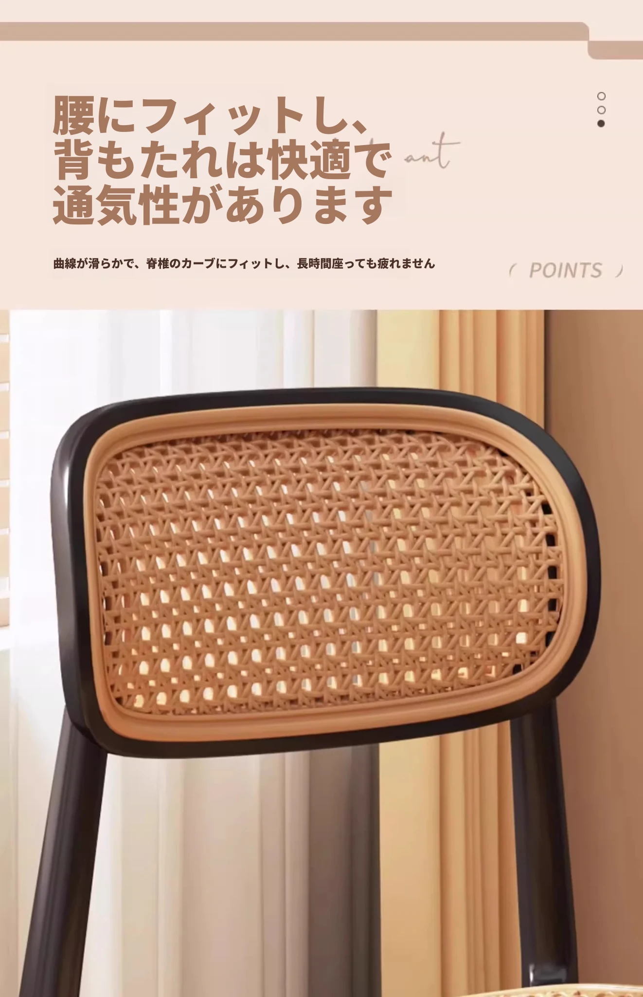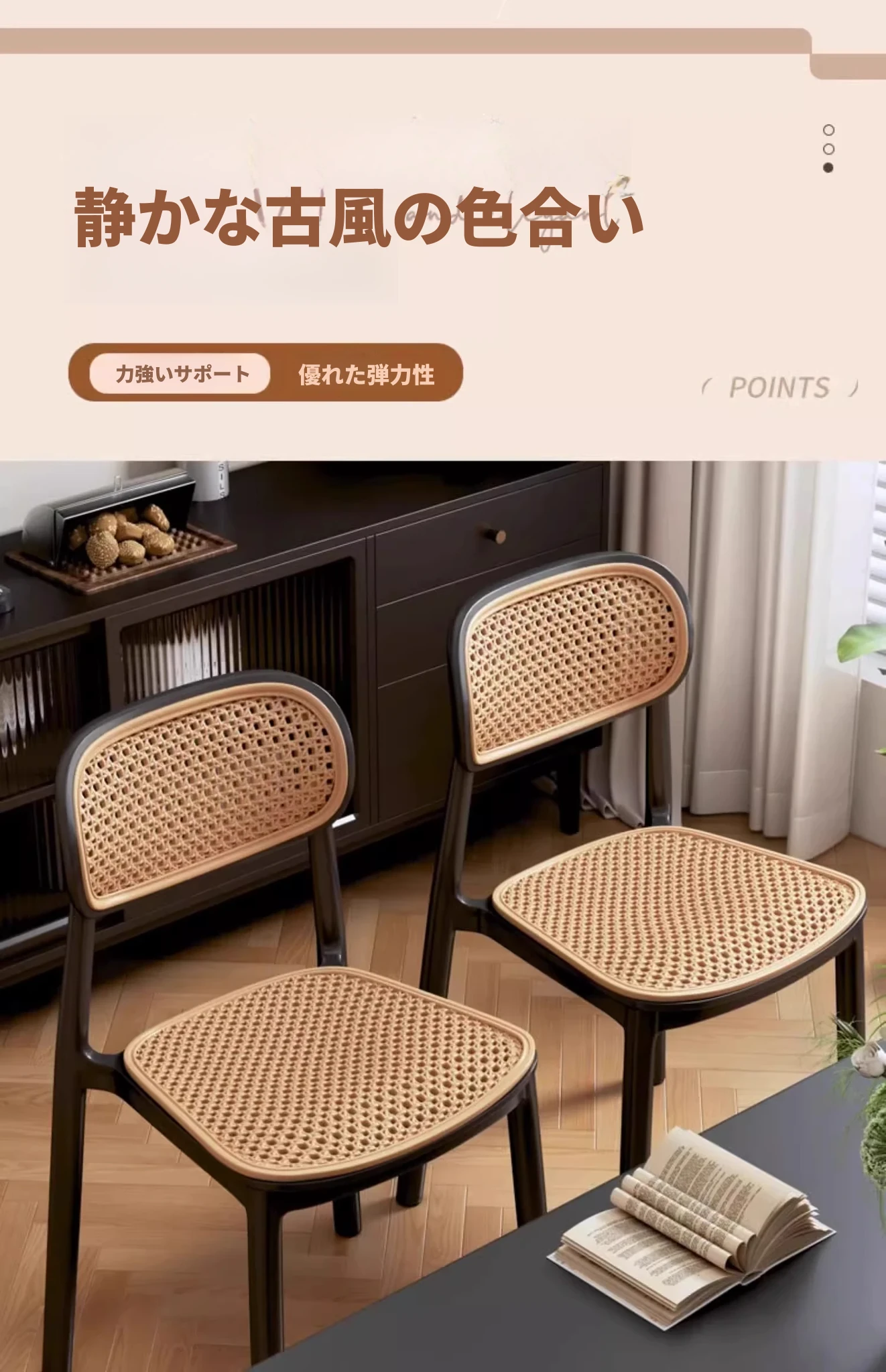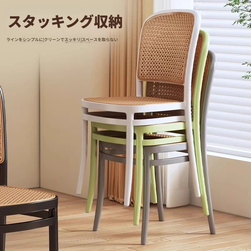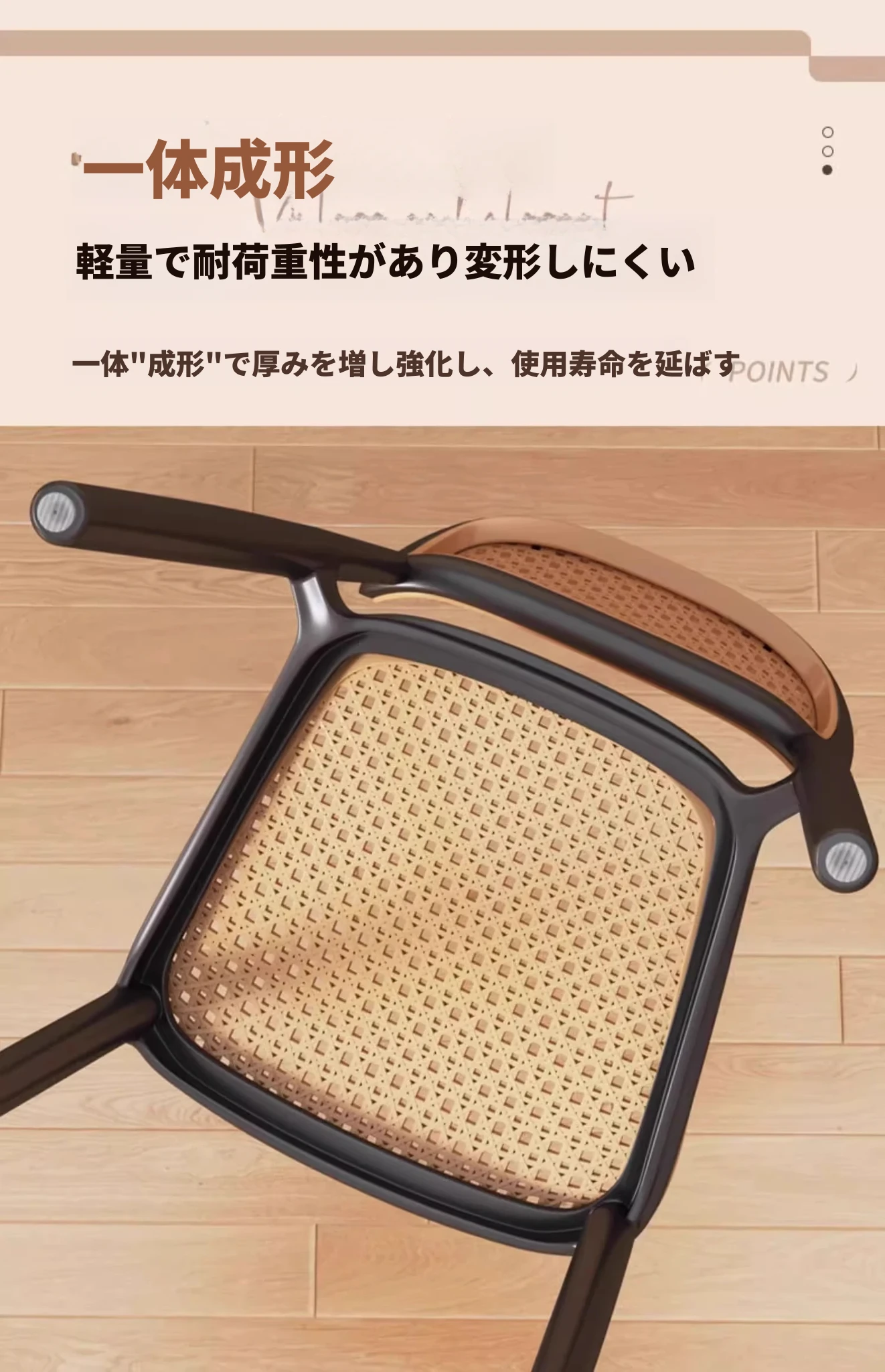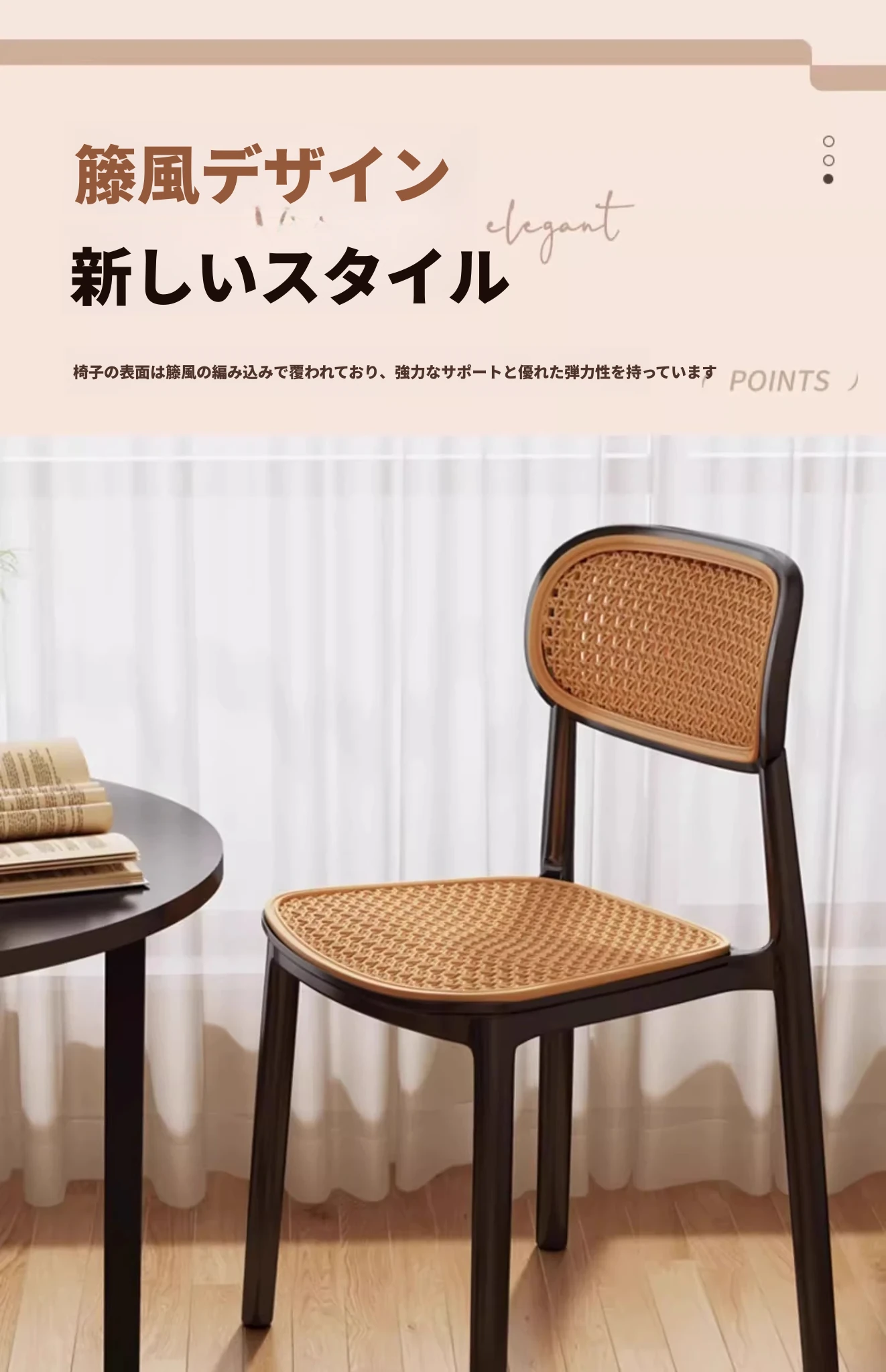 高級感溢れる藤編みの椅子!家庭用に最適な軽奢デザインの背もたれ付きダイニングチェア。厚手のプラスチック素材で頑丈、重ねて収納可能。ダイニングルームをスタイリッシュに演出します!