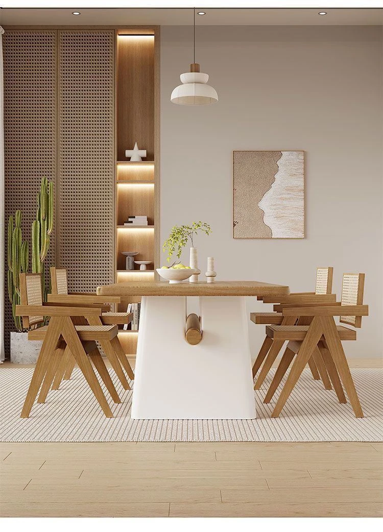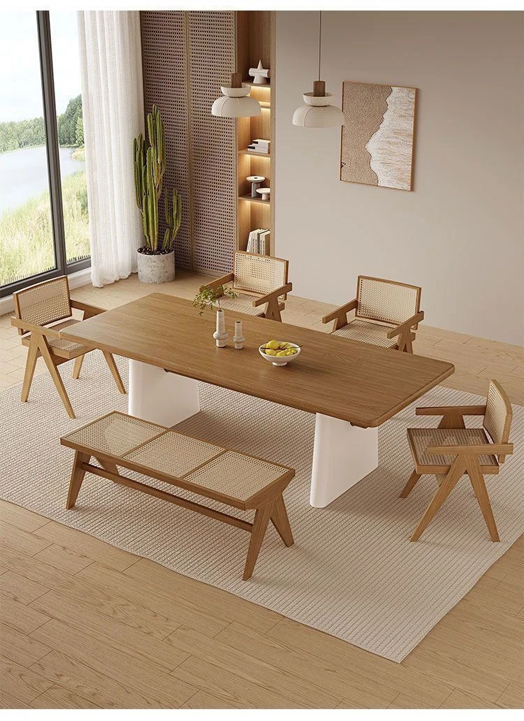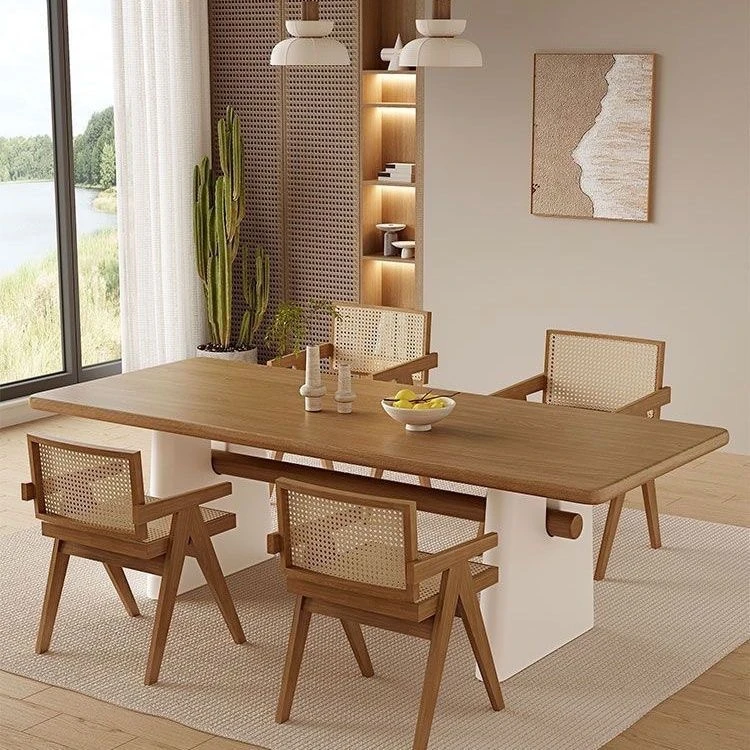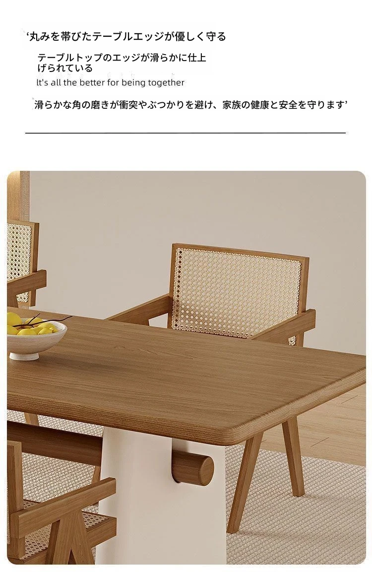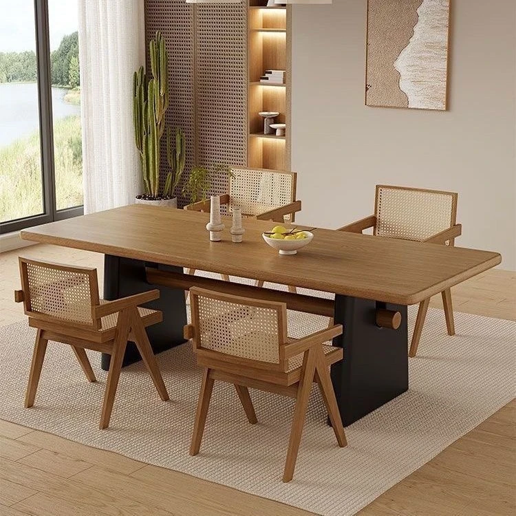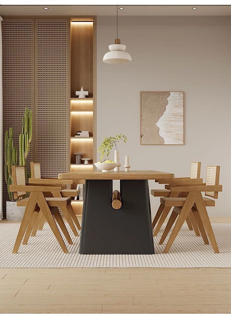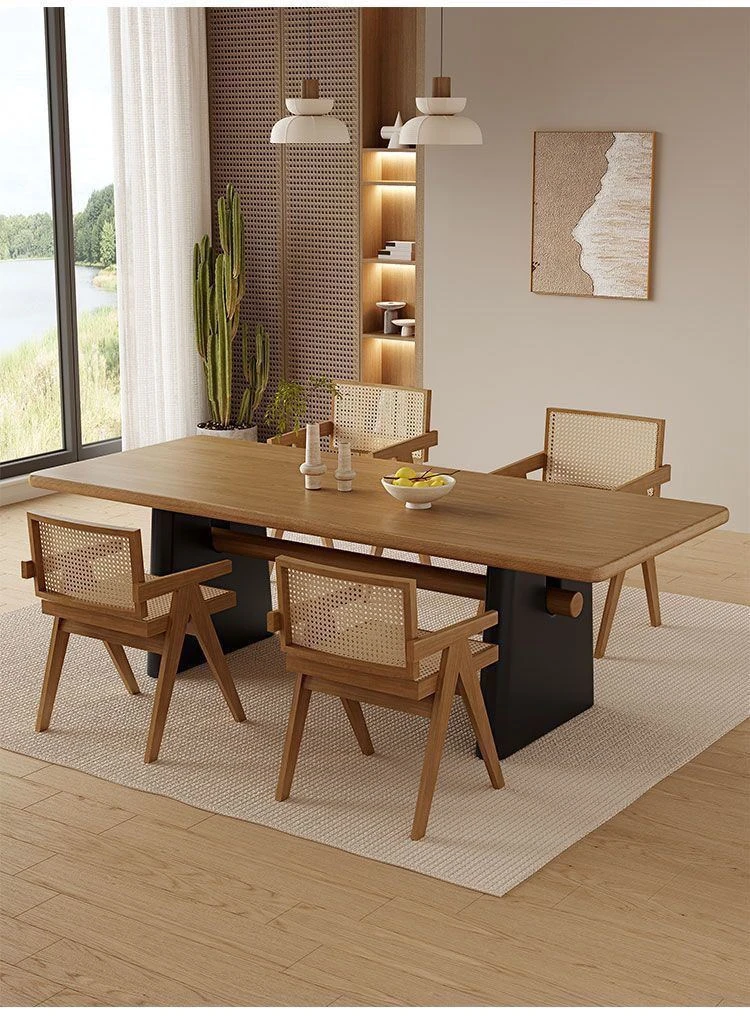 侘寂風の無垢材ダイニングテーブル&チェアセット|民宿やレストランに最適!自然の温もりを感じるオリジナルデザイン|現代的な茶卓にもなる多機能テーブルで、心地よいひとときをお楽しみください。
