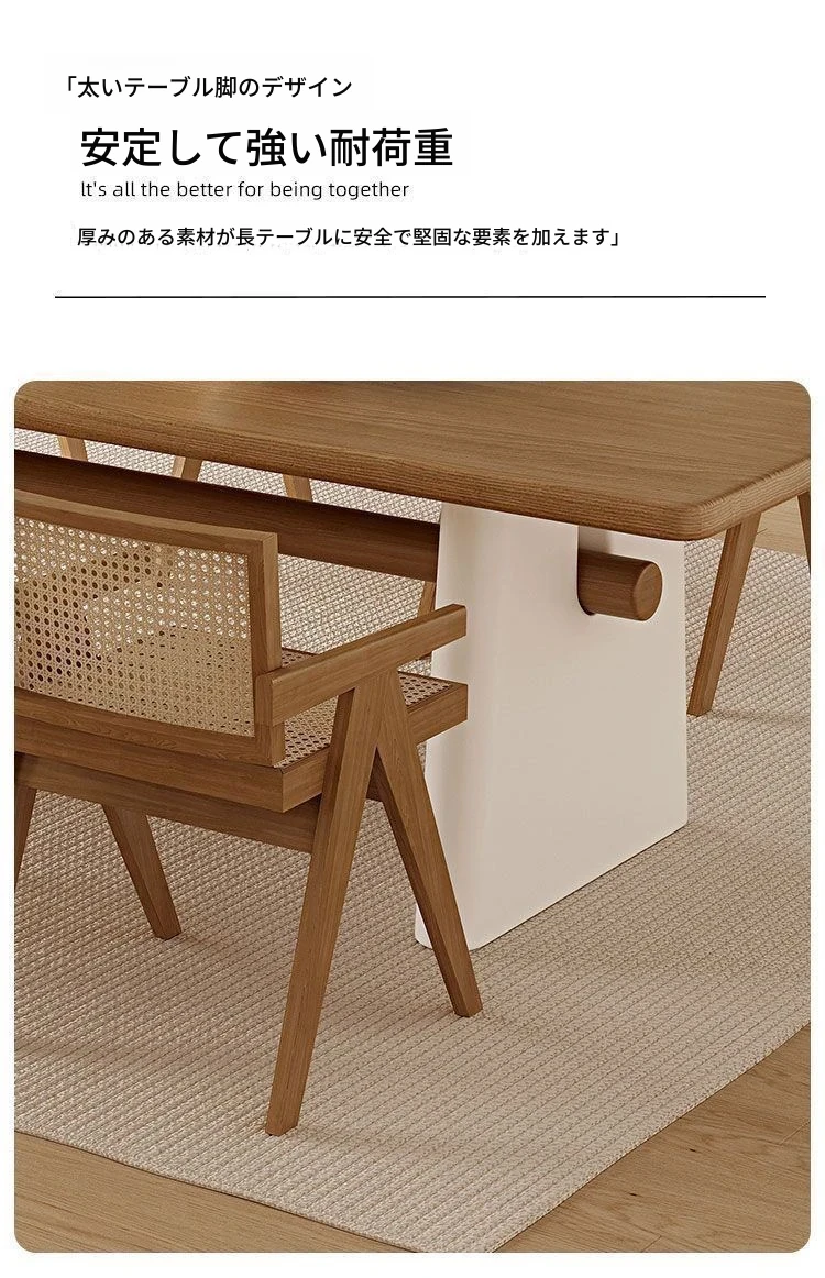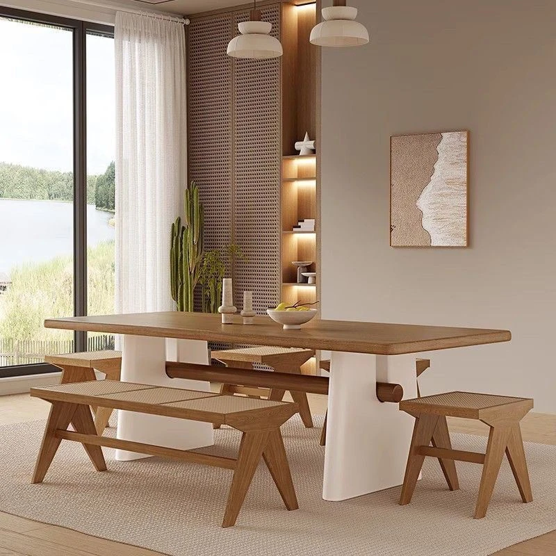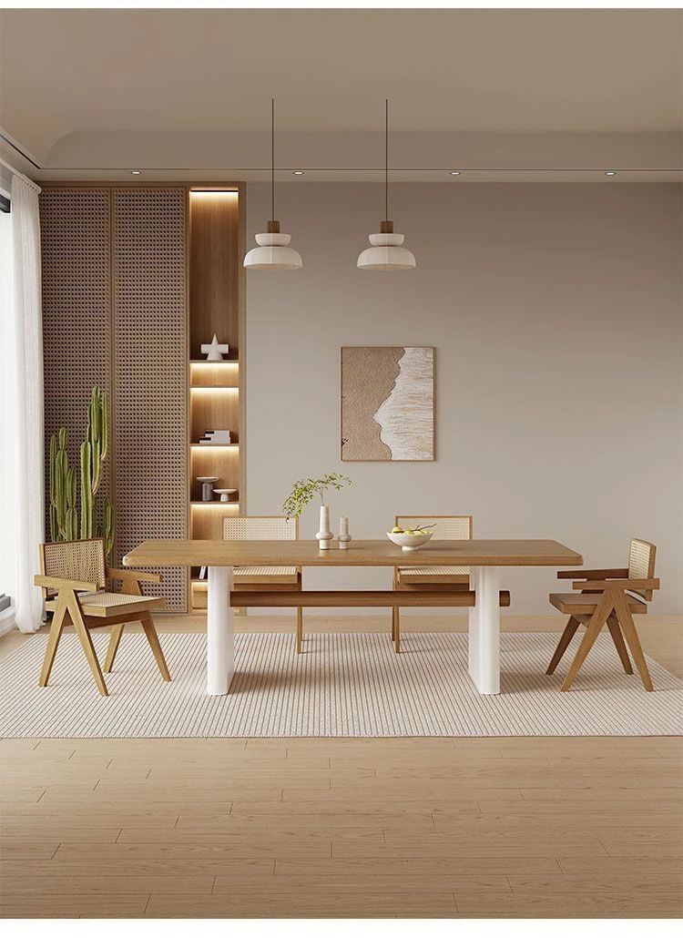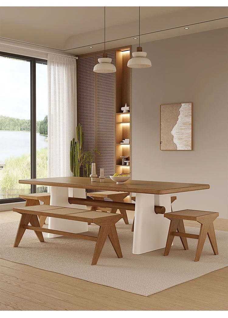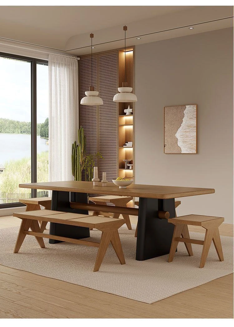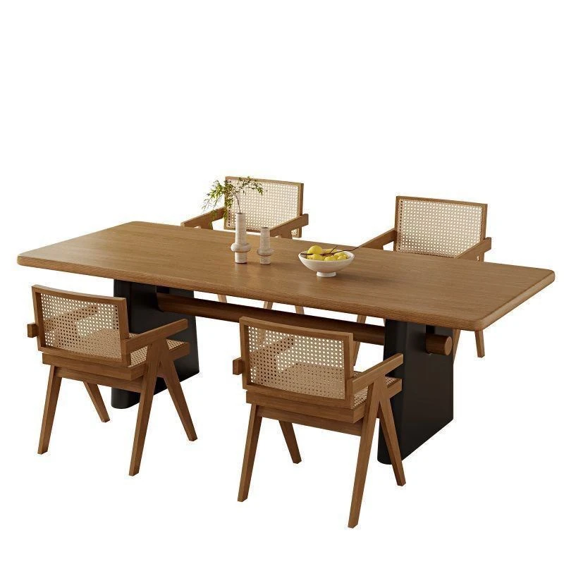 侘寂風の無垢材ダイニングテーブル&チェアセット|民宿やレストランに最適!自然の温もりを感じるオリジナルデザイン|現代的な茶卓にもなる多機能テーブルで、心地よいひとときをお楽しみください。