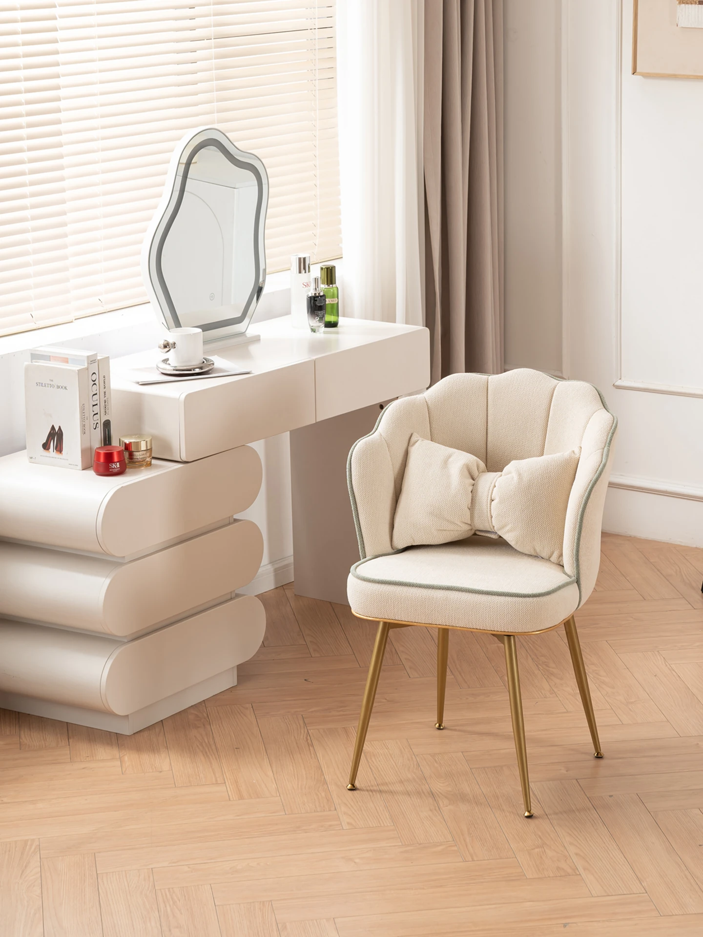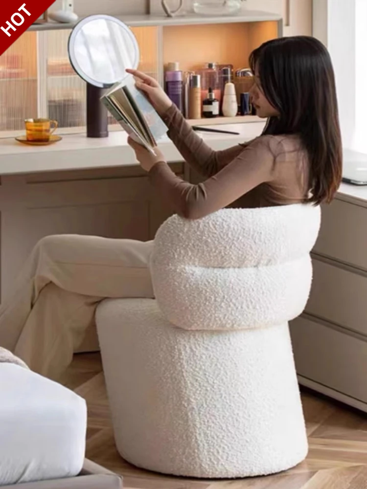 インフルエンサー必見!クリーミーな風合いのラムファーを使用したモダンでシンプルな化粧椅子。贅沢な自宅の寝室にぴったりのデザイン。おしゃれなドレッサーやメイクアップスペースに最適!